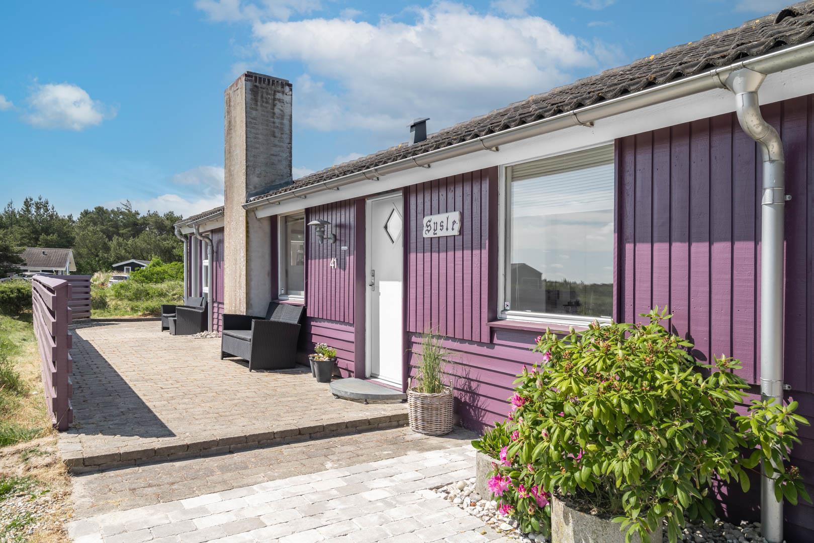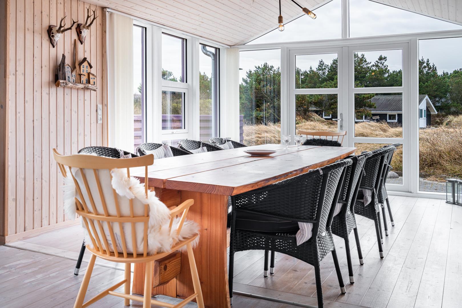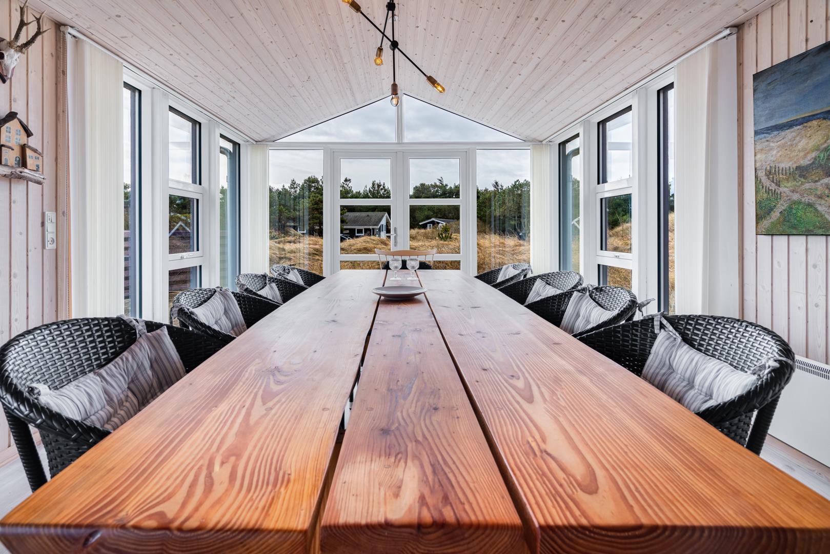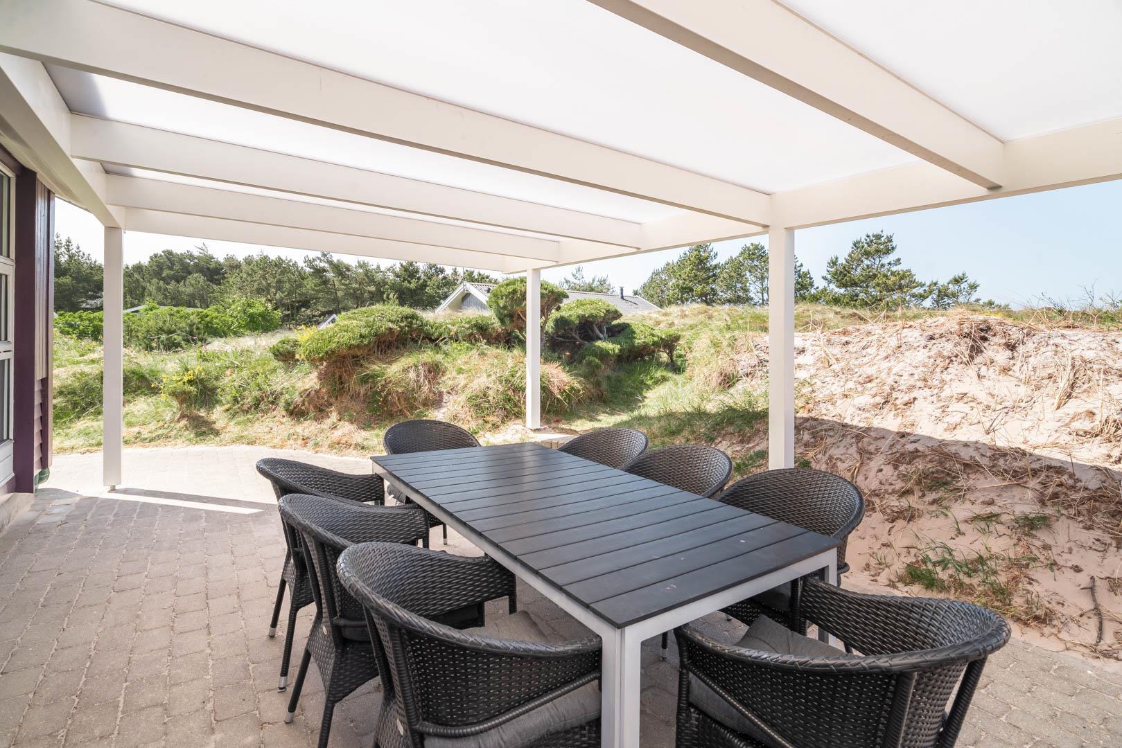 Smagfuldt feriehus ved Henne Strand med panoramaudsigt over lyng og flere ugenerede terrasser.