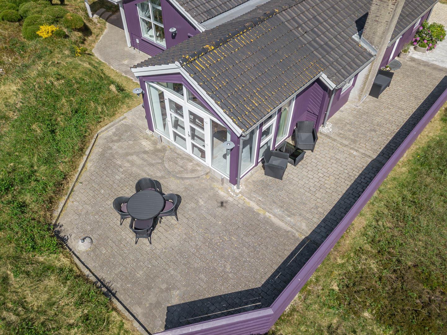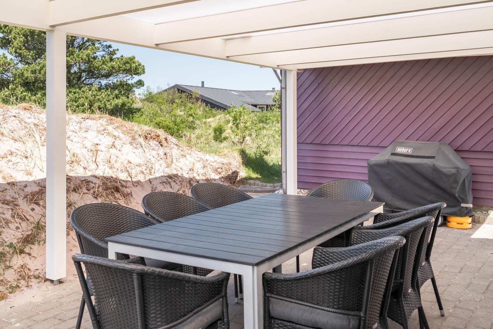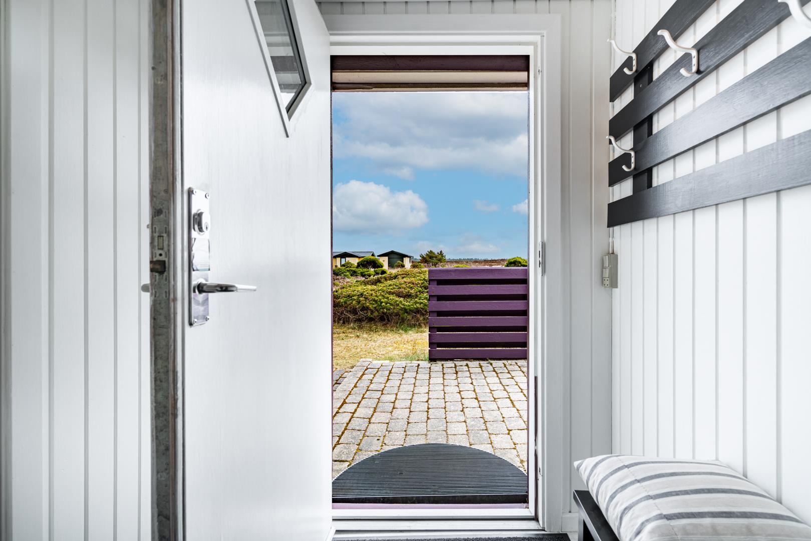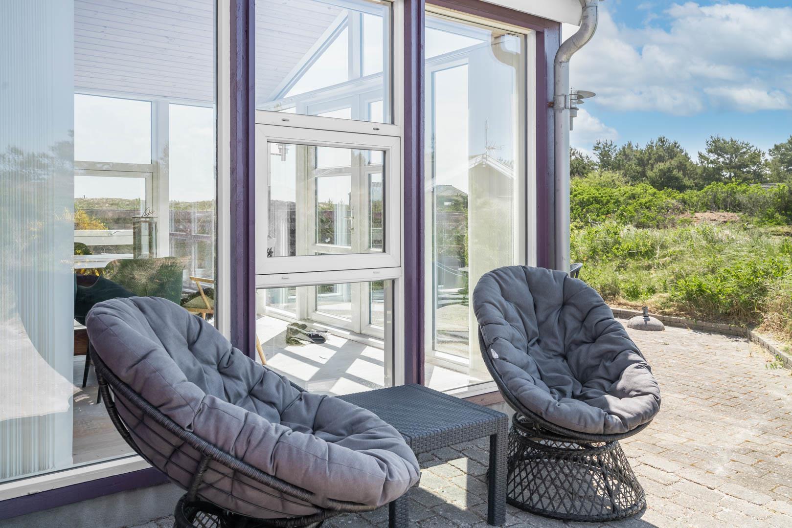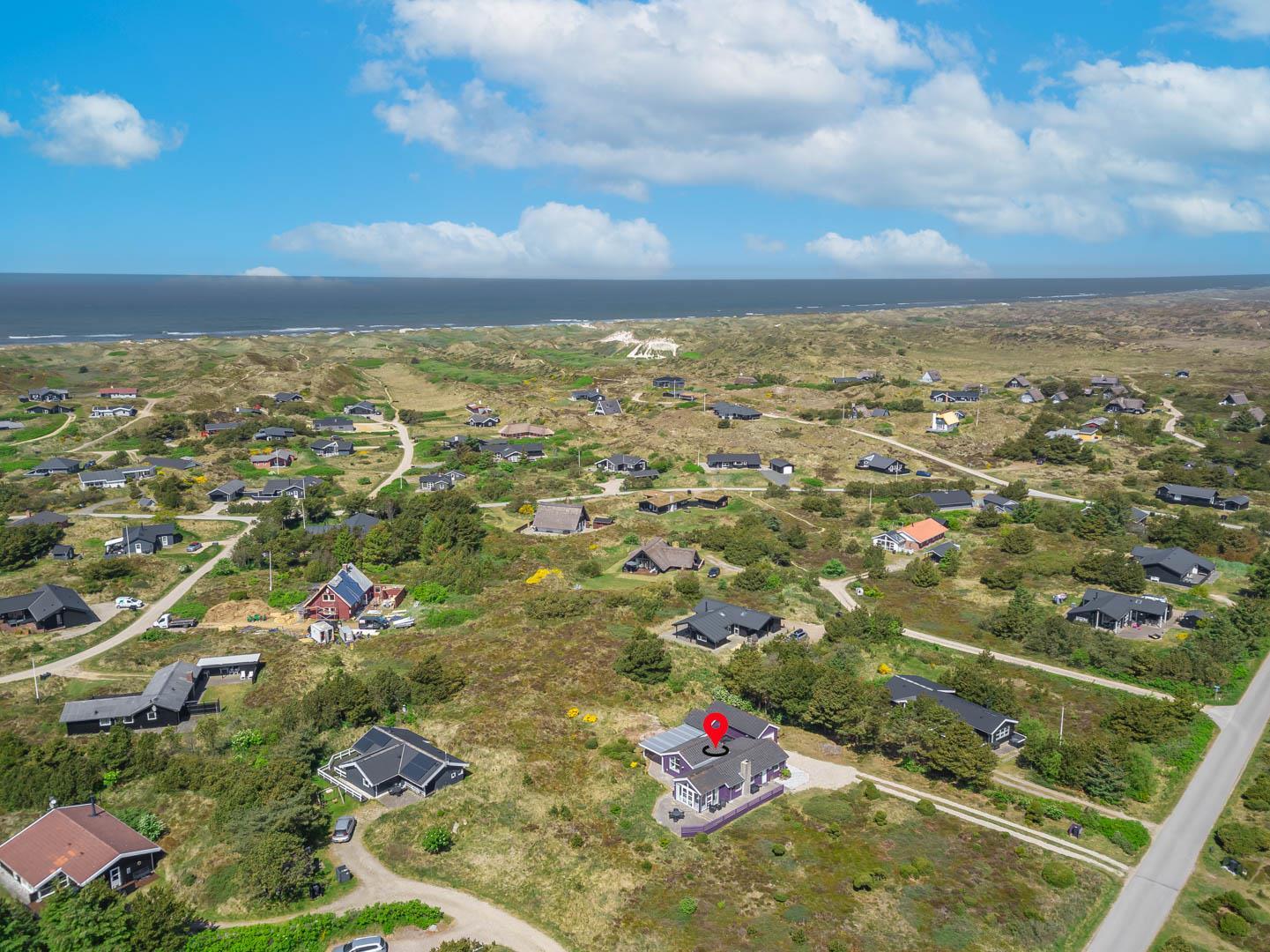 Smagfuldt feriehus ved Henne Strand med panoramaudsigt over lyng og flere ugenerede terrasser.