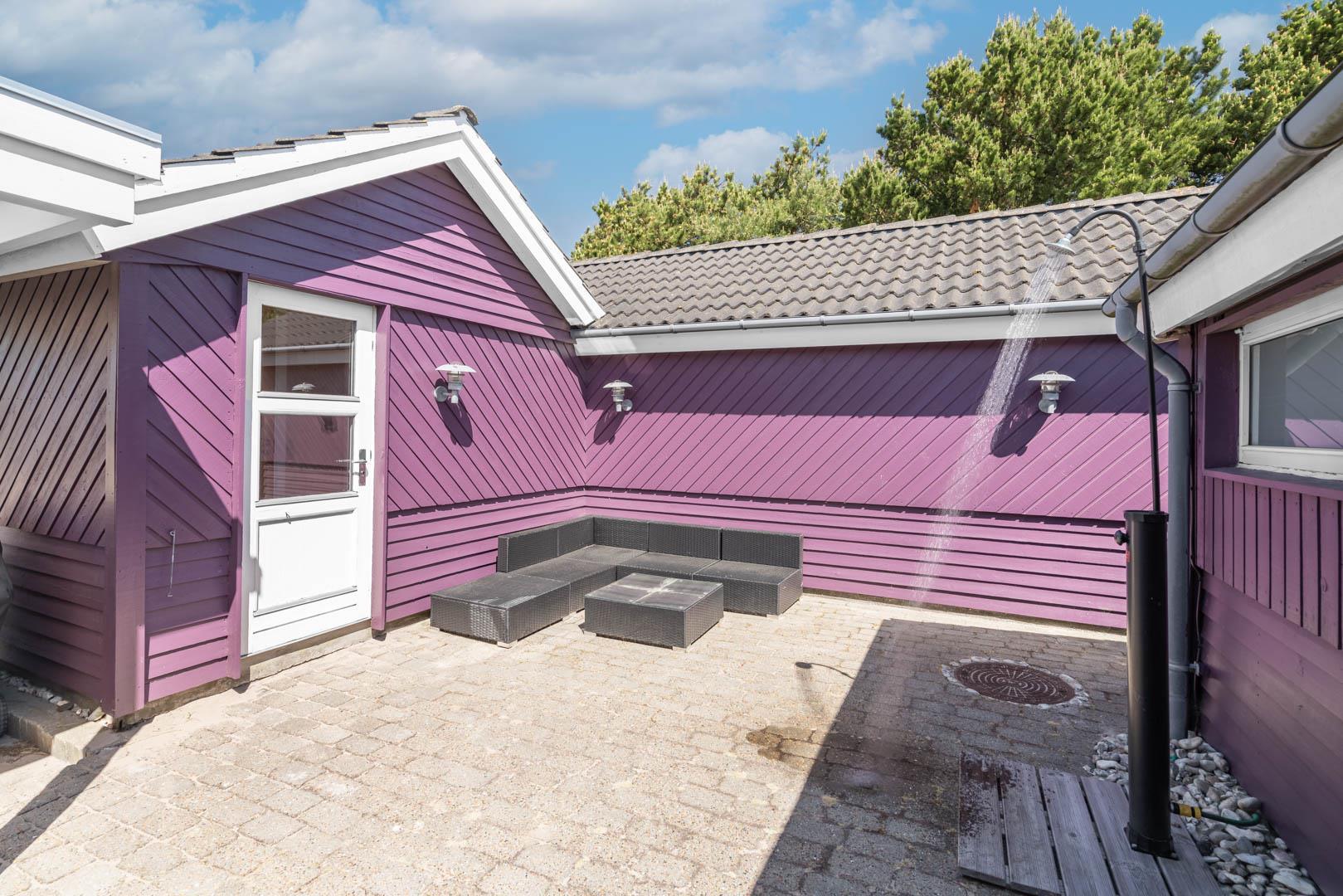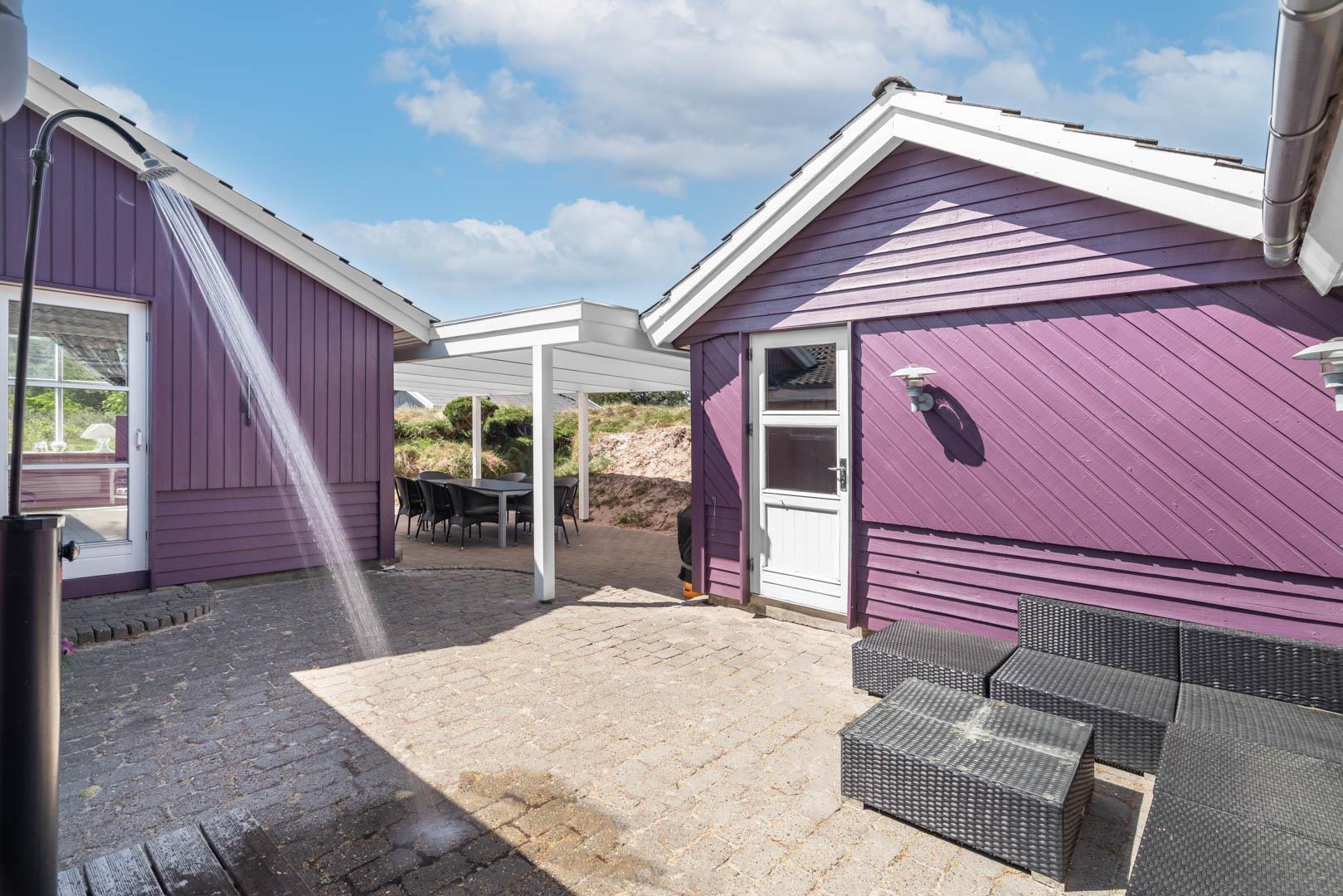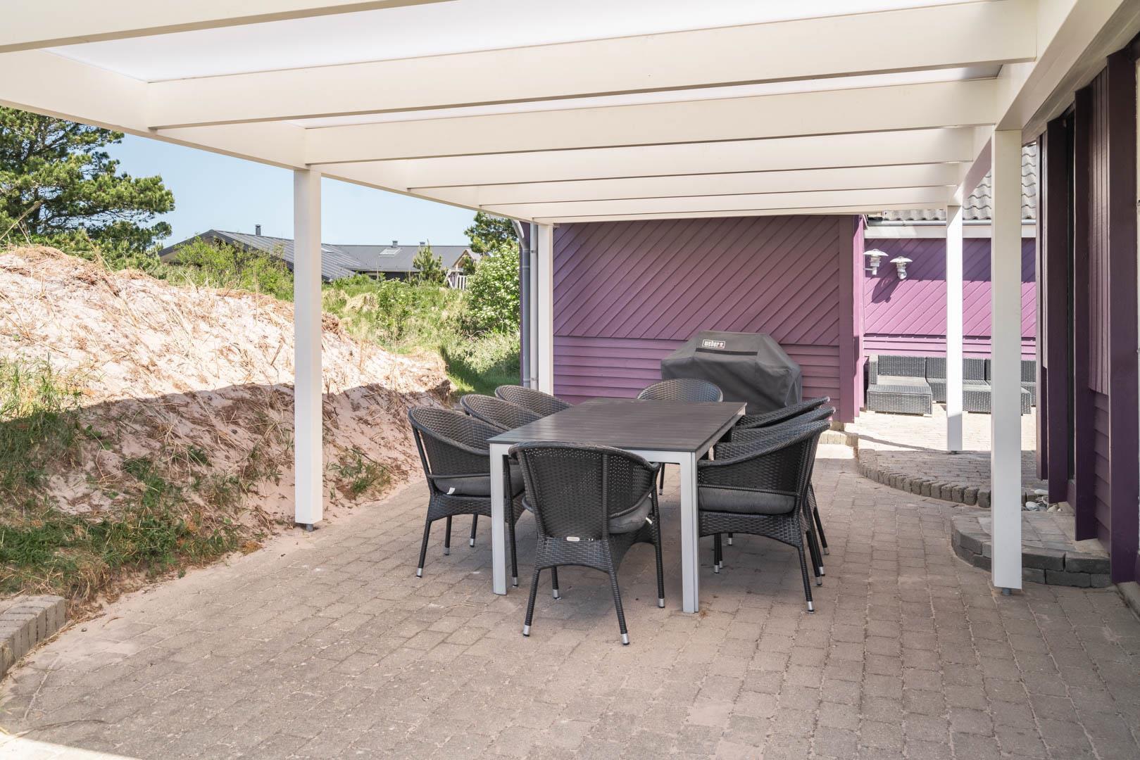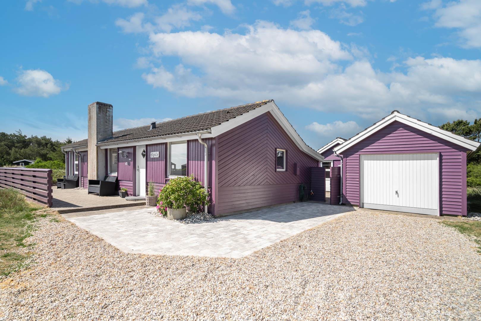 Smagfuldt feriehus ved Henne Strand med panoramaudsigt over lyng og flere ugenerede terrasser.