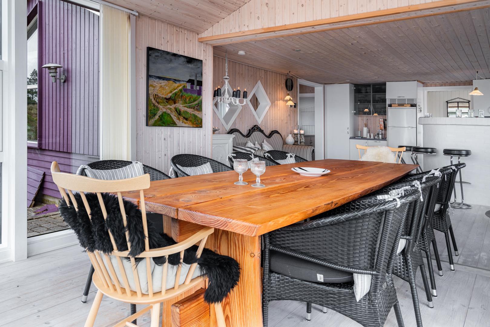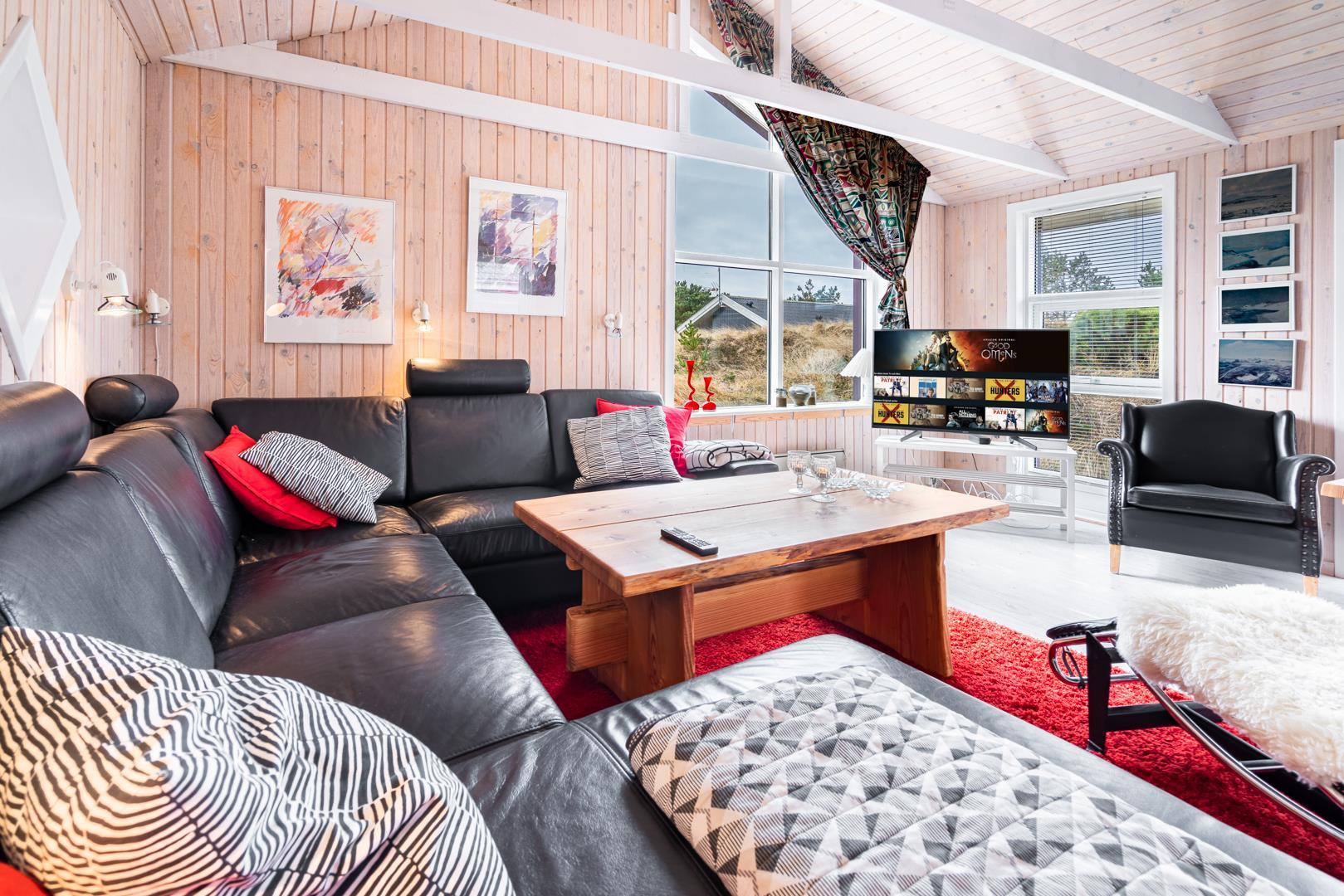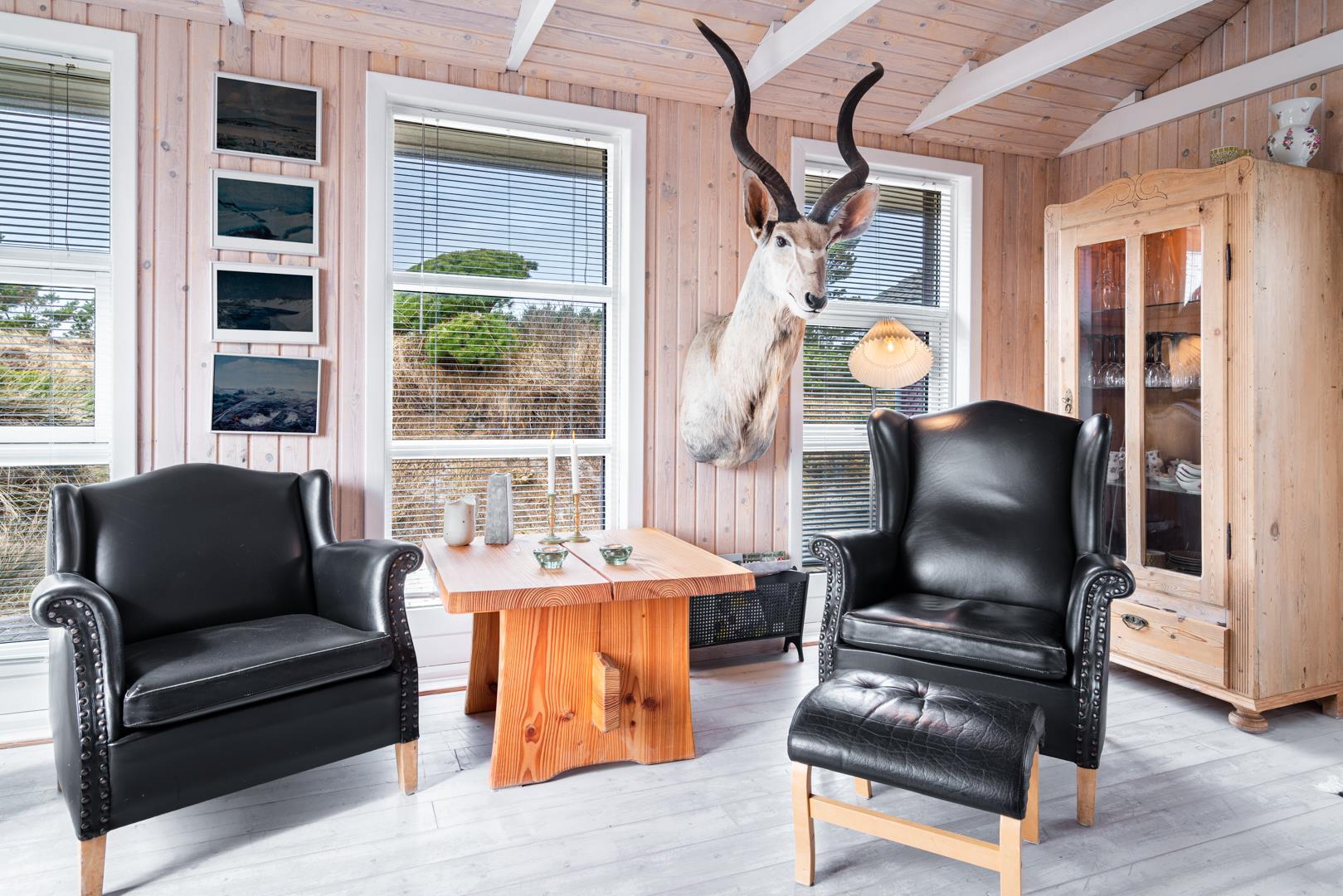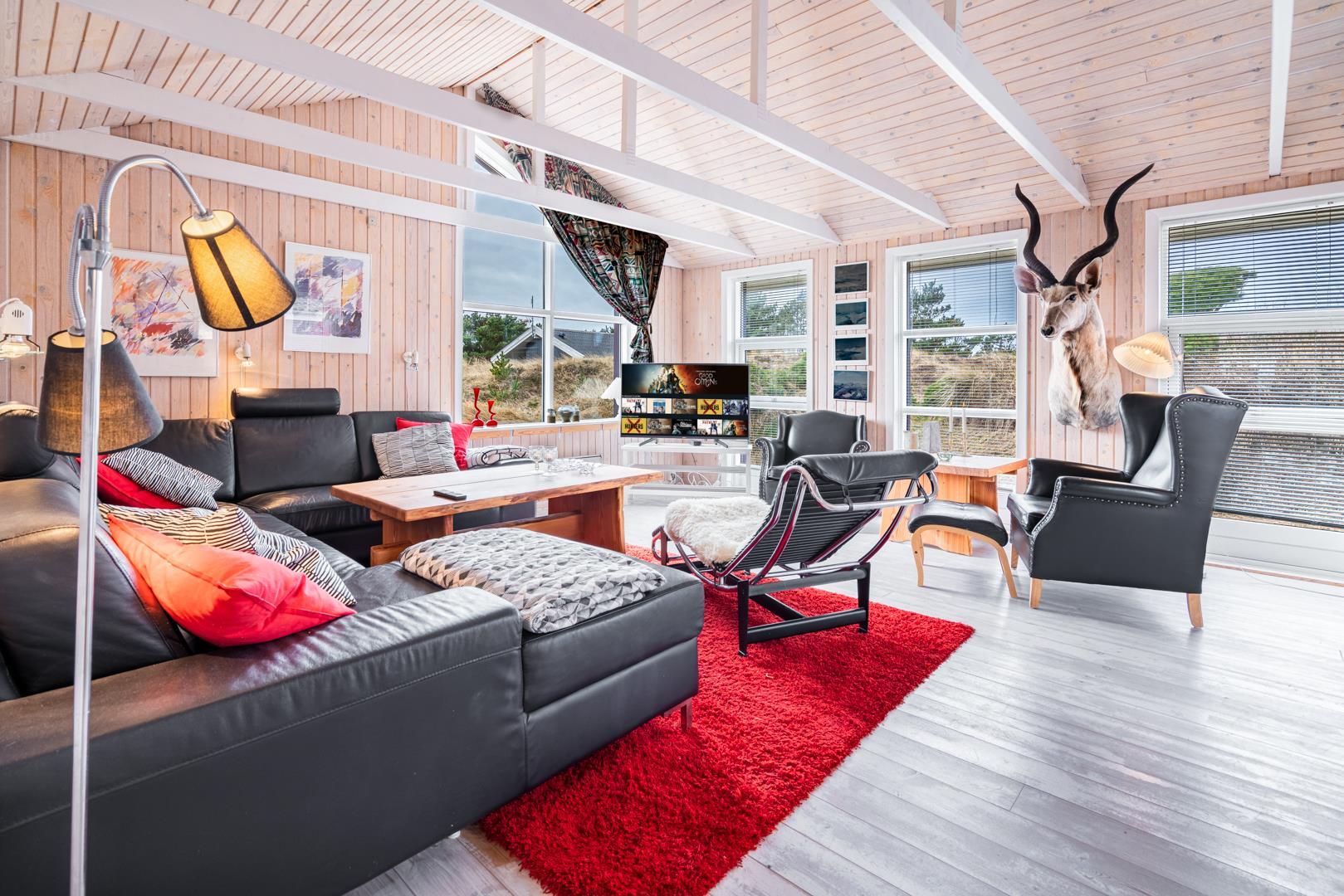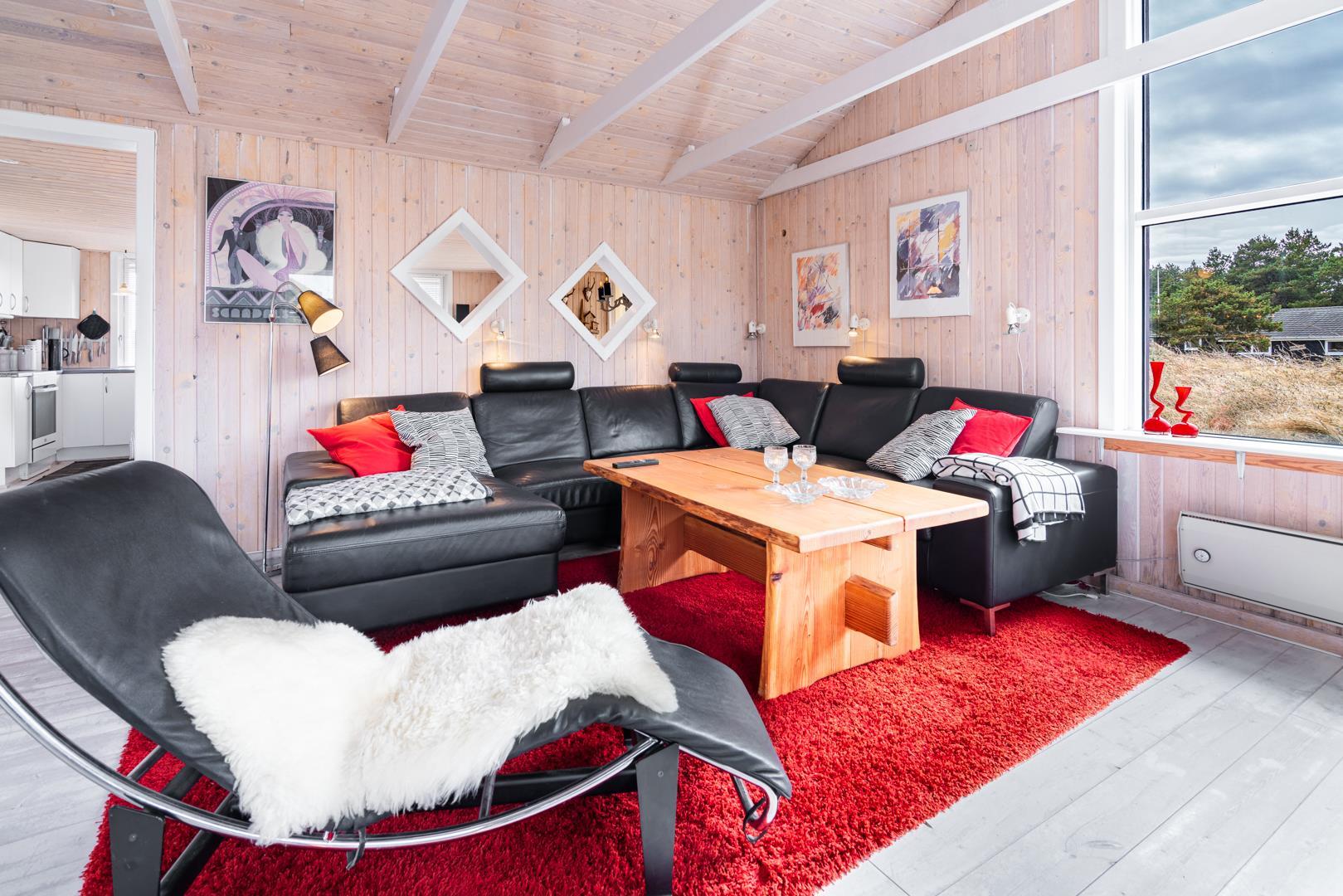 Velindrettet og meget smagfuldt privat indrettet feriehus, omgivet af flere ugenerede terrasser med panorama udsigt over det store lyngareal, beliggende på en stor lyngklædt naturgrund og godt tilbagetrukket i forhold til vejen. Huset er velindrettet med gode komfortable møbler. Der er et separat køkken/spisestue. Hyggelig og lyst indrettet stue med gode møbler.
