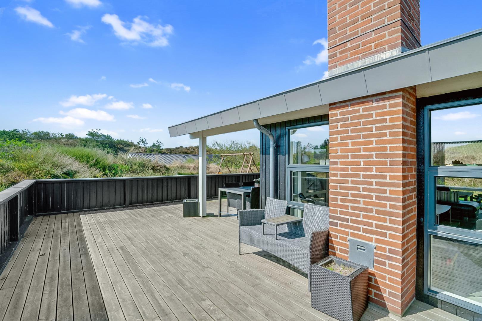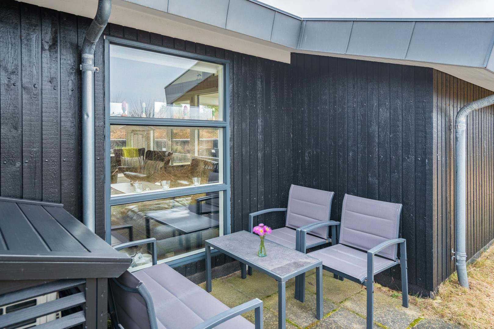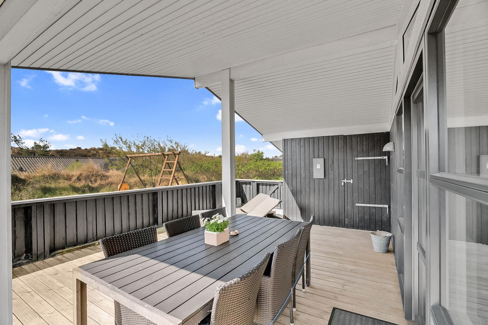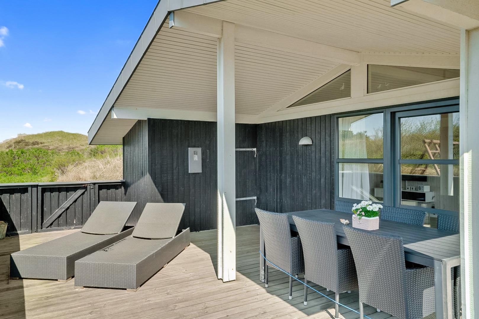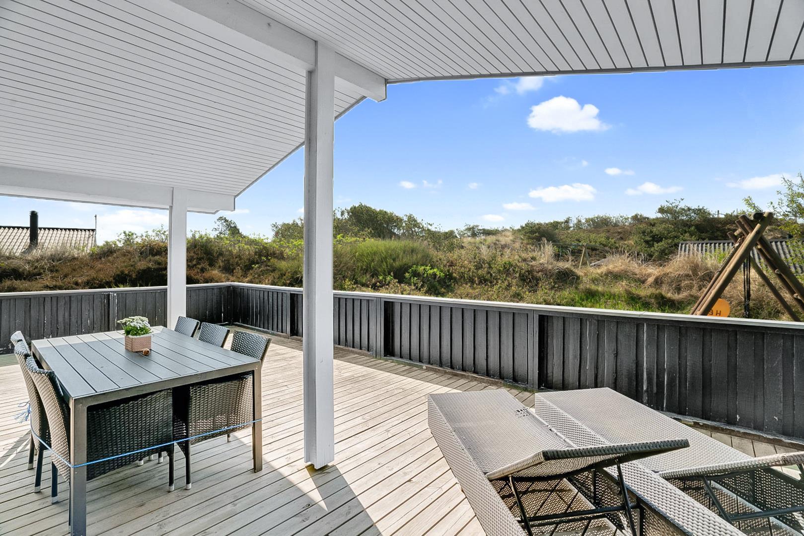 På den store lukkede træterrasse kan solen og den friske luft nydes i fulde drag. I dette skønne feriehus er rammerne skabt for en god ferie i Henne Strand.