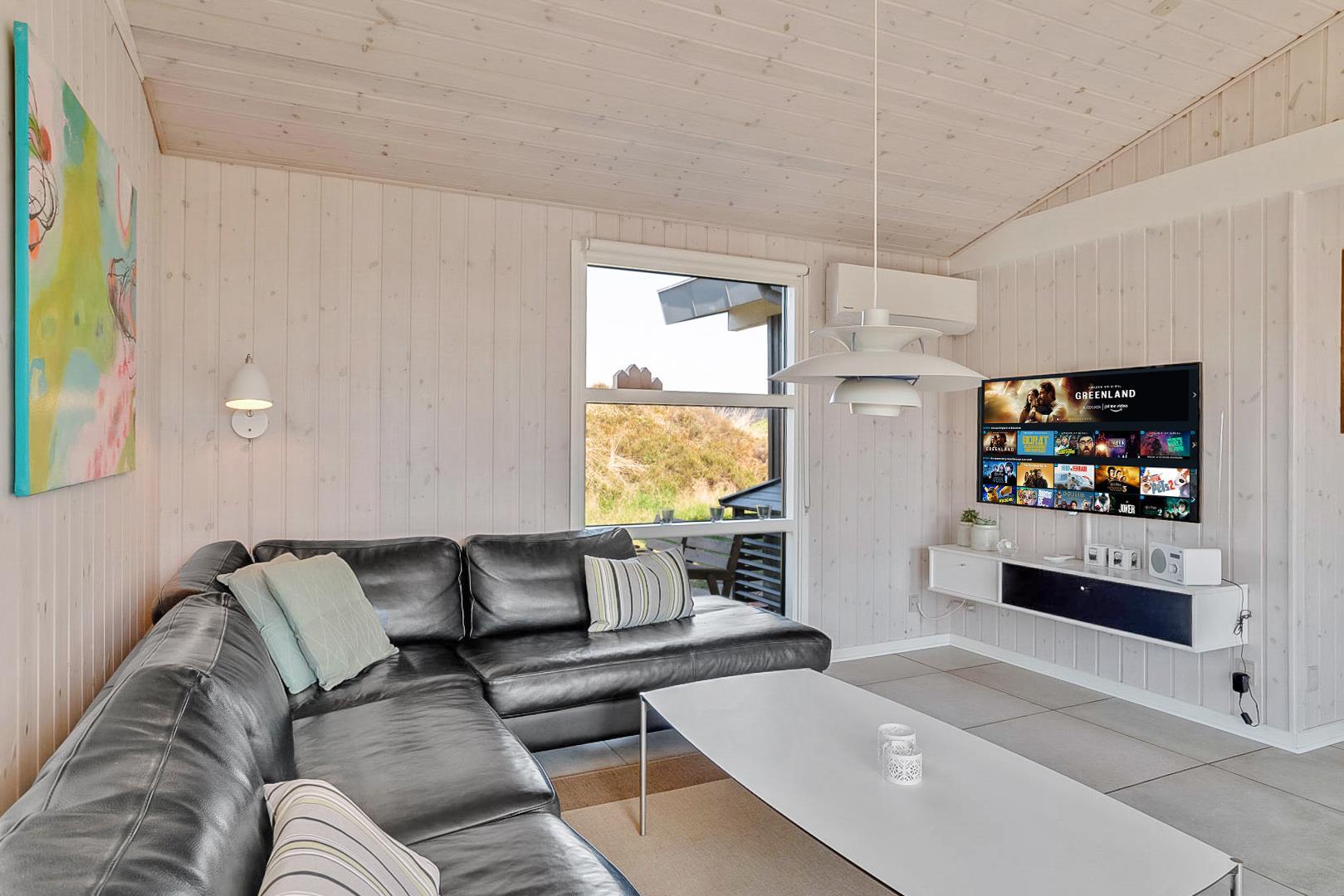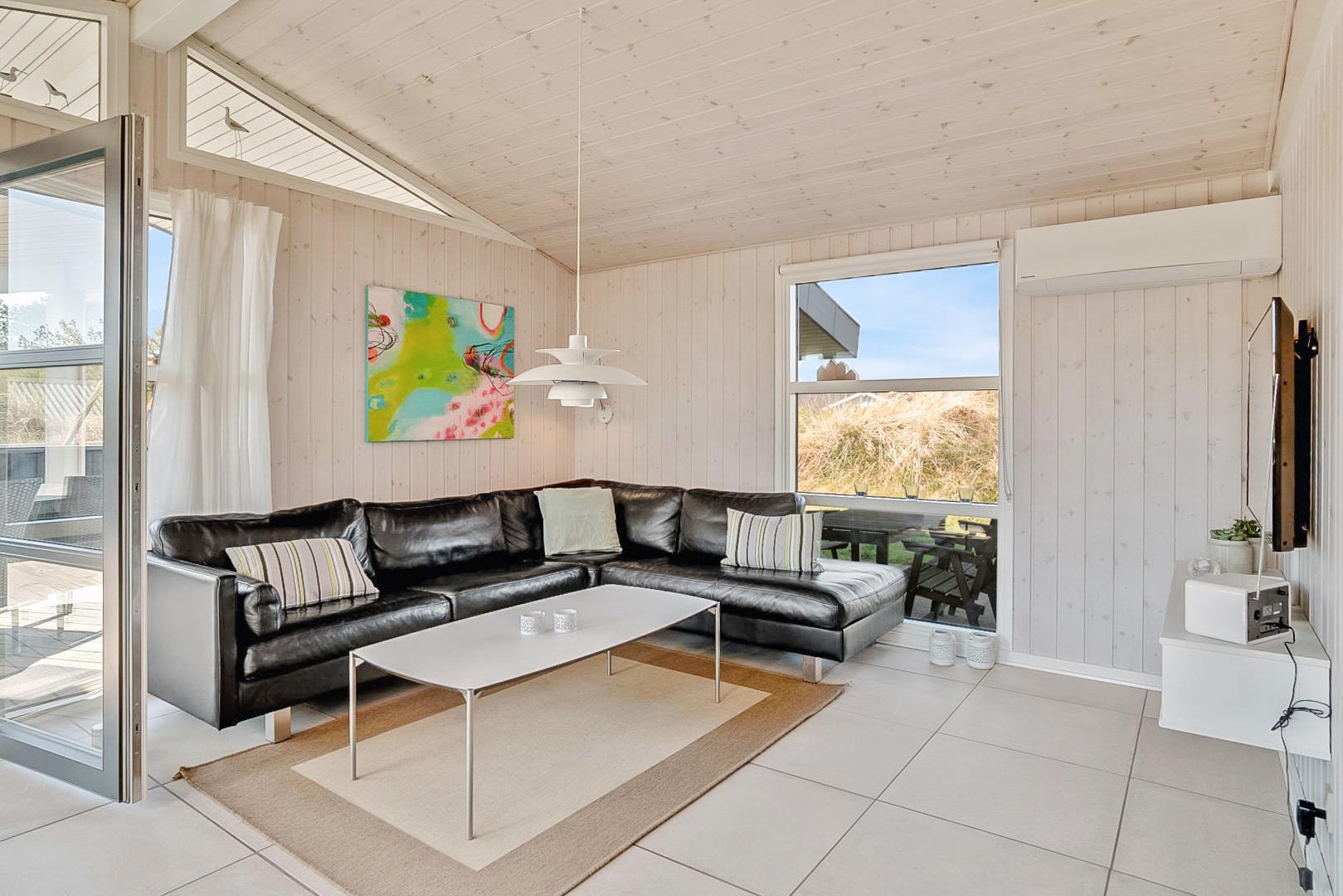 Lys og venlig stue med lyse vægge og lofter.