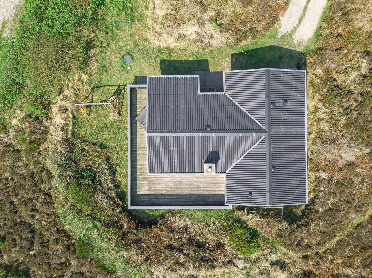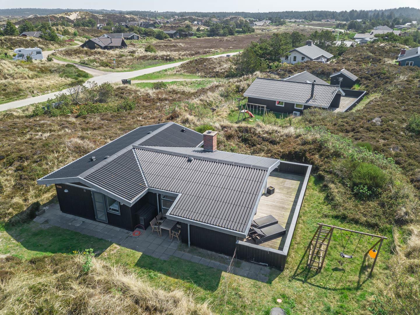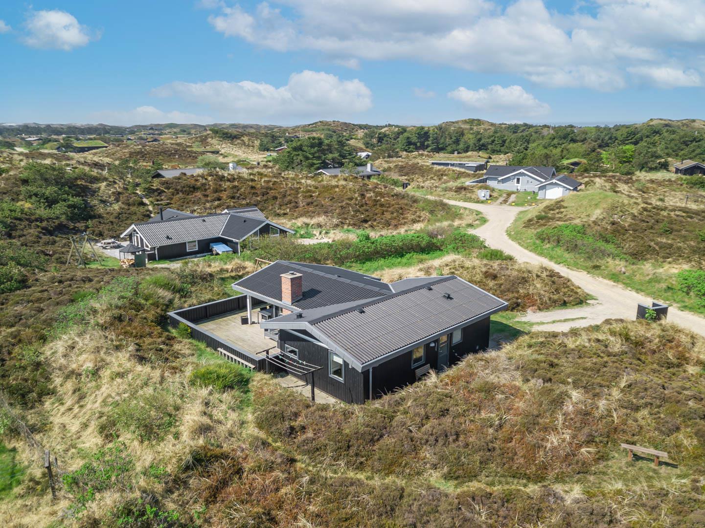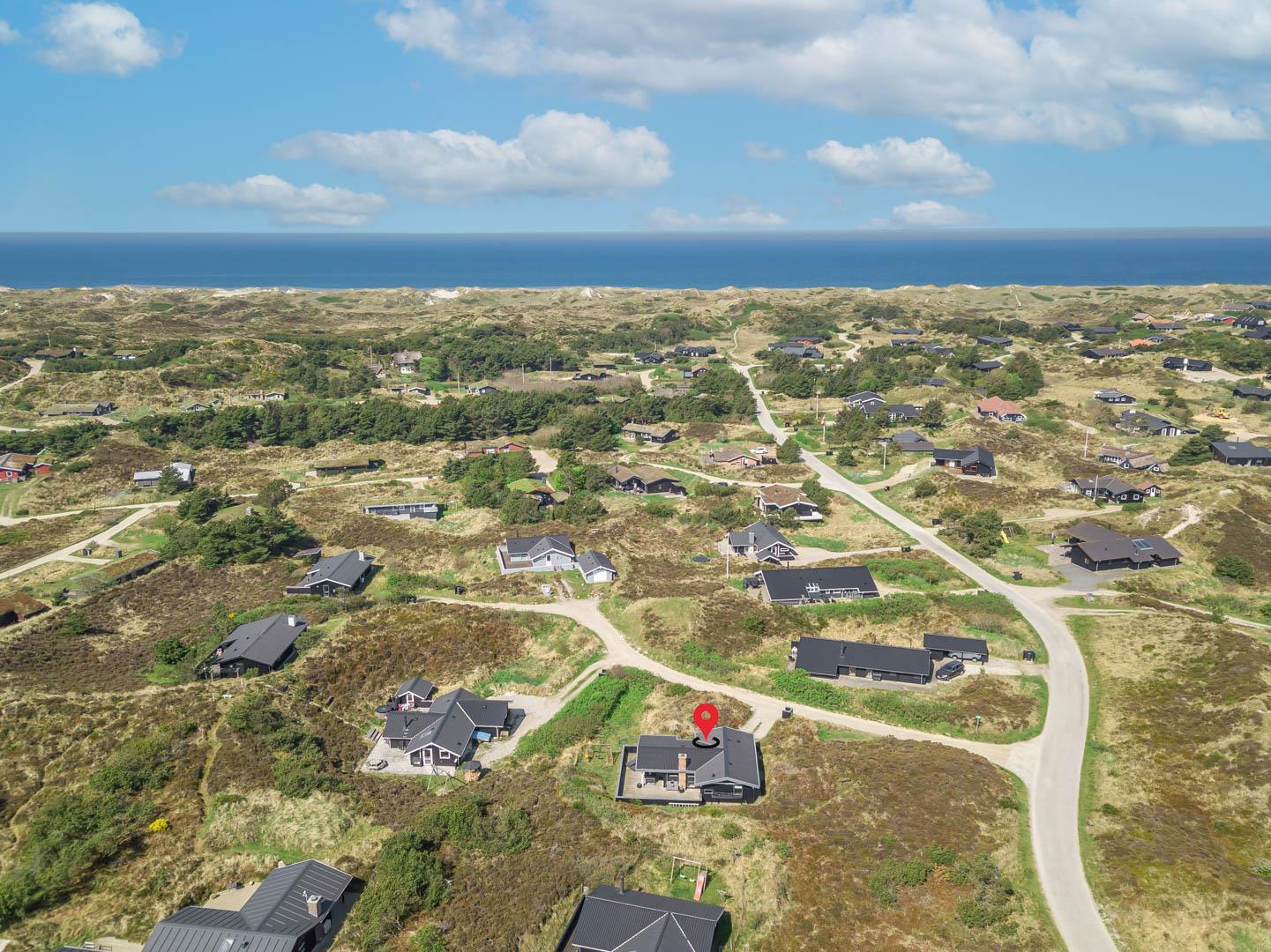 Tilbagetrukket fra Hjelmevej på en flot og letkuperet lynggrund. Ikke langt fra huset er der en sti, som går gennem det skønne klitlandskab og ned til Vesterhavet. På 5 minutter er man på områdets 18-hullers golfbane eller ud i Blåbjerg Plantage med motionsstier og mountainbike-ruter.