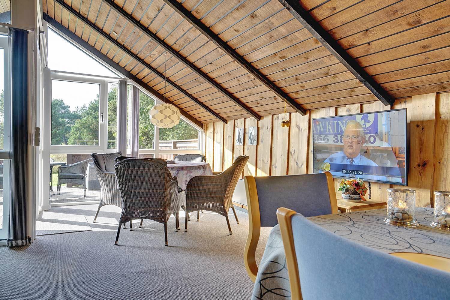 Fra stuen er der adgang til både åbne og overdækkede, lukkede terrasser – her kan I nyde solen og naturen uanset vejr og vind, og finde læ og privatliv hele dagen.