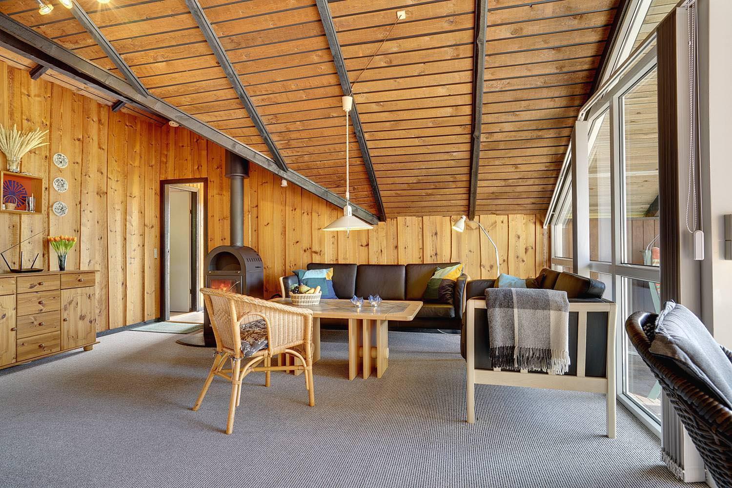 De store vinduespartier trækker naturen helt ind i stuen og skaber en dejlig atmosfære.