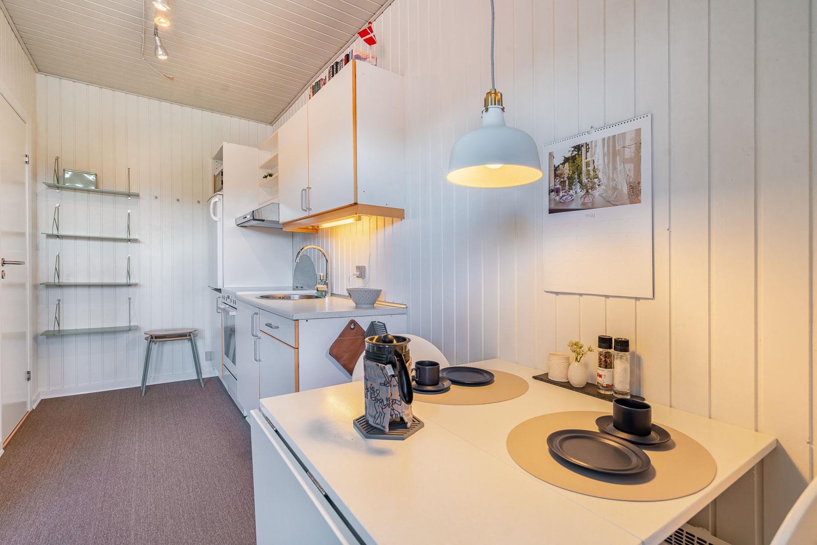 Lejligheden er 35 m2, fuldt udstyret og byder på et moderne køkken med alt, hvad I behøver til at lave lækre måltider, inklusive opdateret ovn, mikrobølgeovn og køle/fryseskab. Det renoverede badeværelse (2022) har gulvvarme og håndklædevarmer, som sikrer ekstra komfort efter en dag ved stranden.