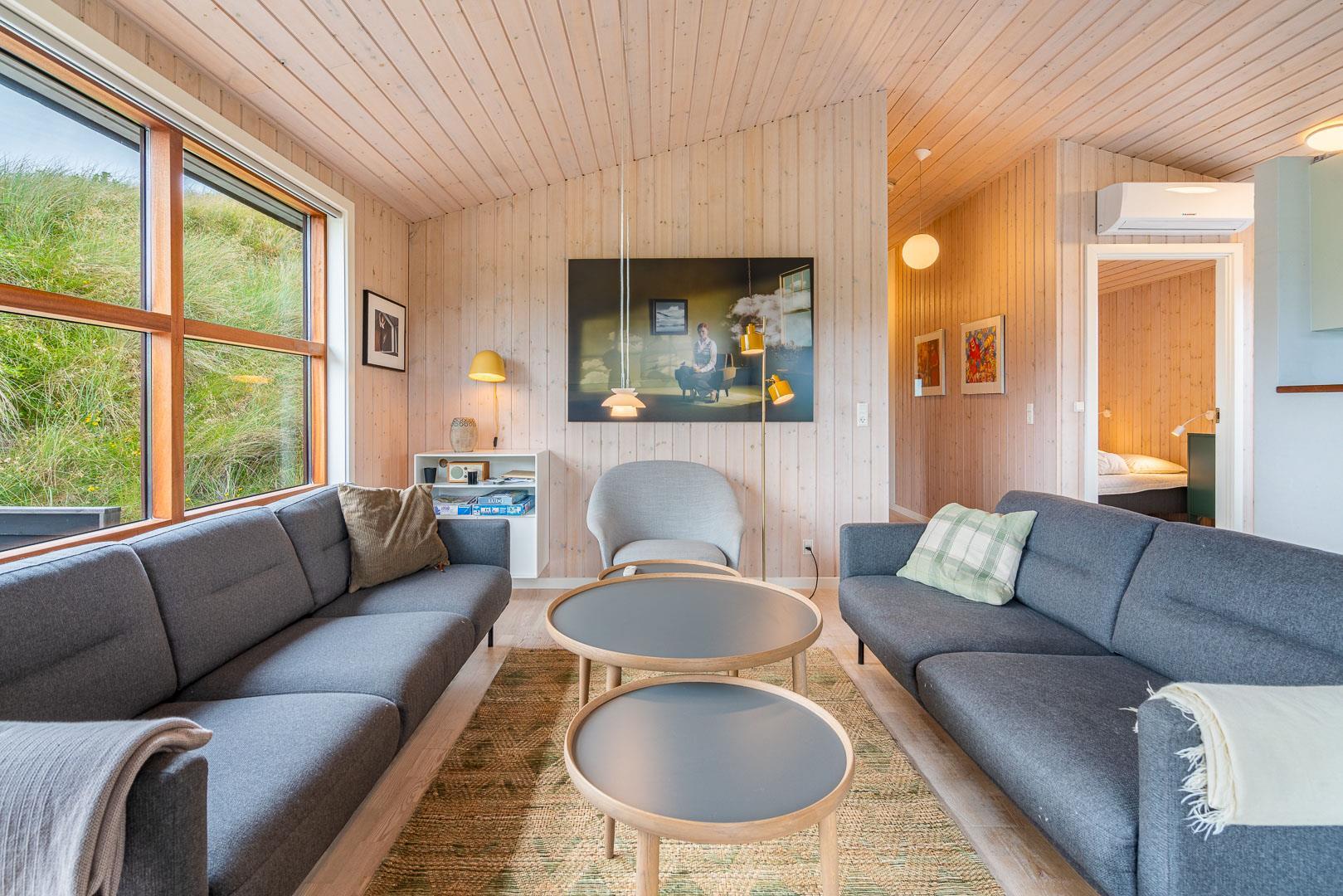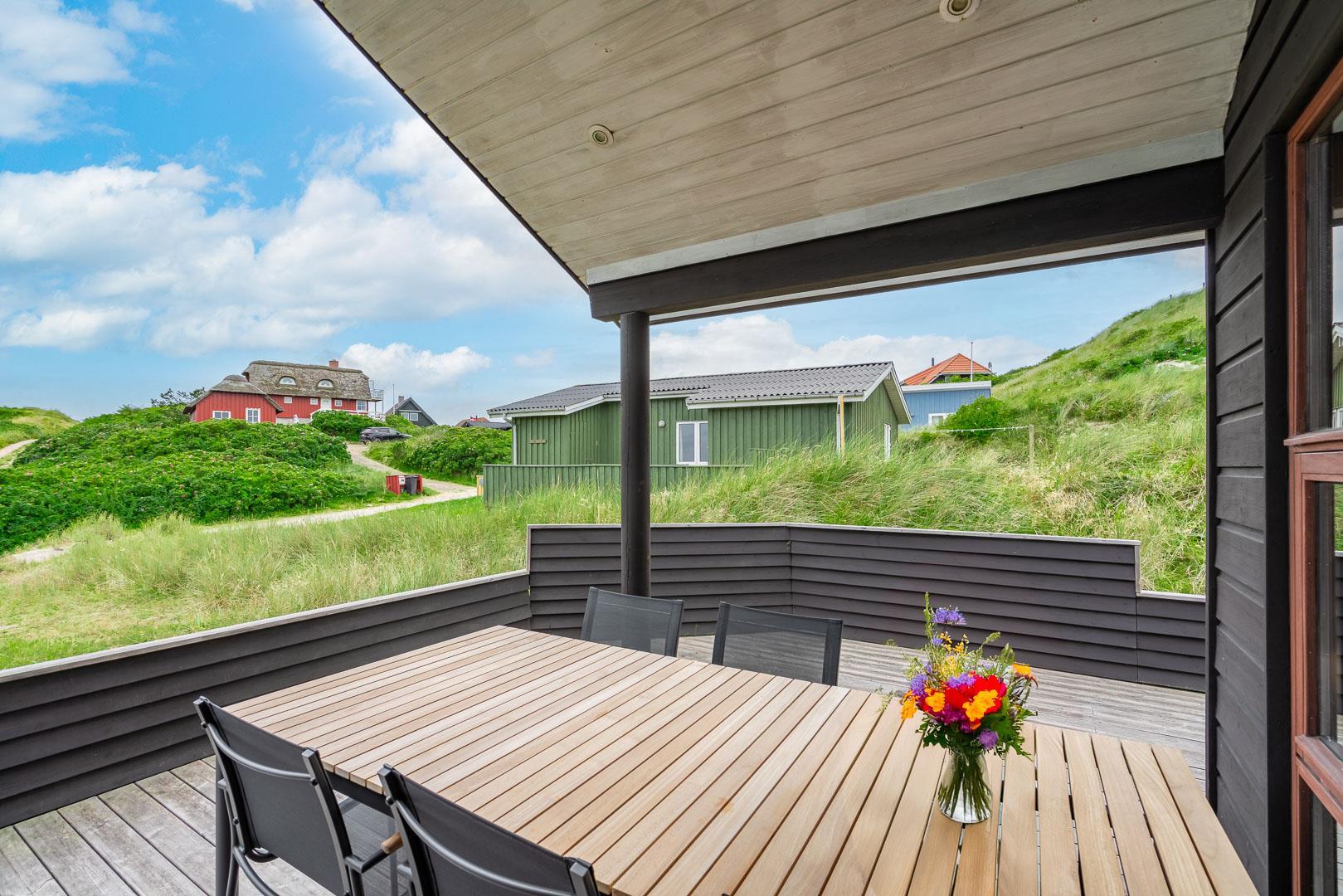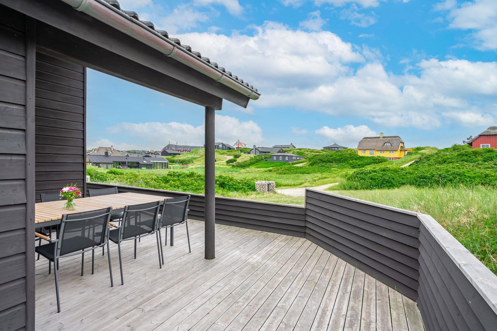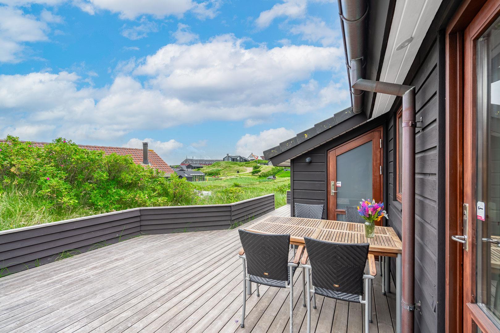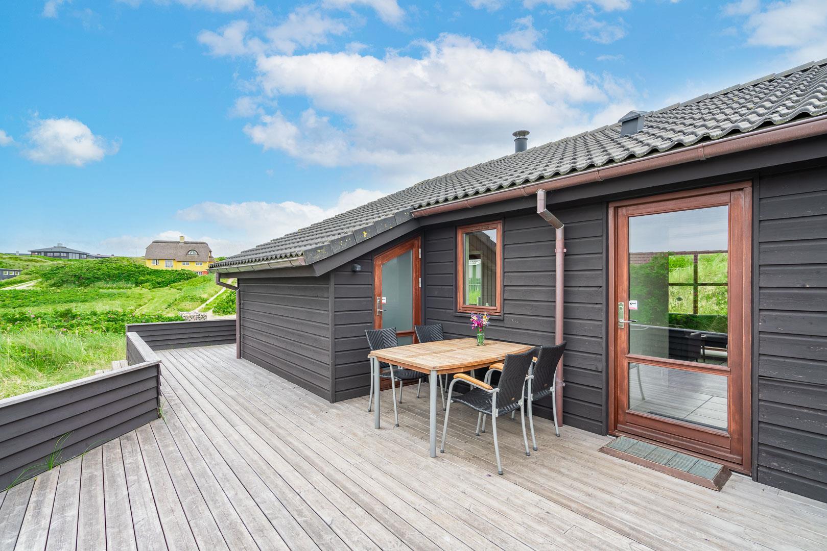 Sommerhuset byder på to badeværelser, spabad og sauna, hvor du kan slappe af efter en dag ved stranden. Udendørs finder du flere terrasser med en smuk udsigt over den kuperede klitgrund. Her kan du nyde solen i liggestole, grille lækre måltider og opleve den friske havluft.