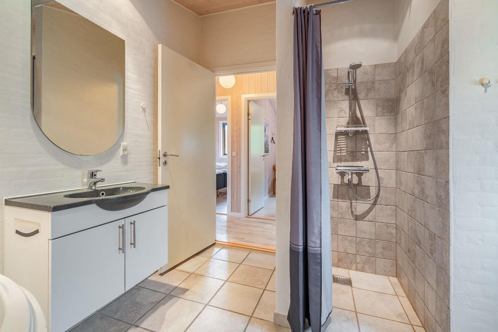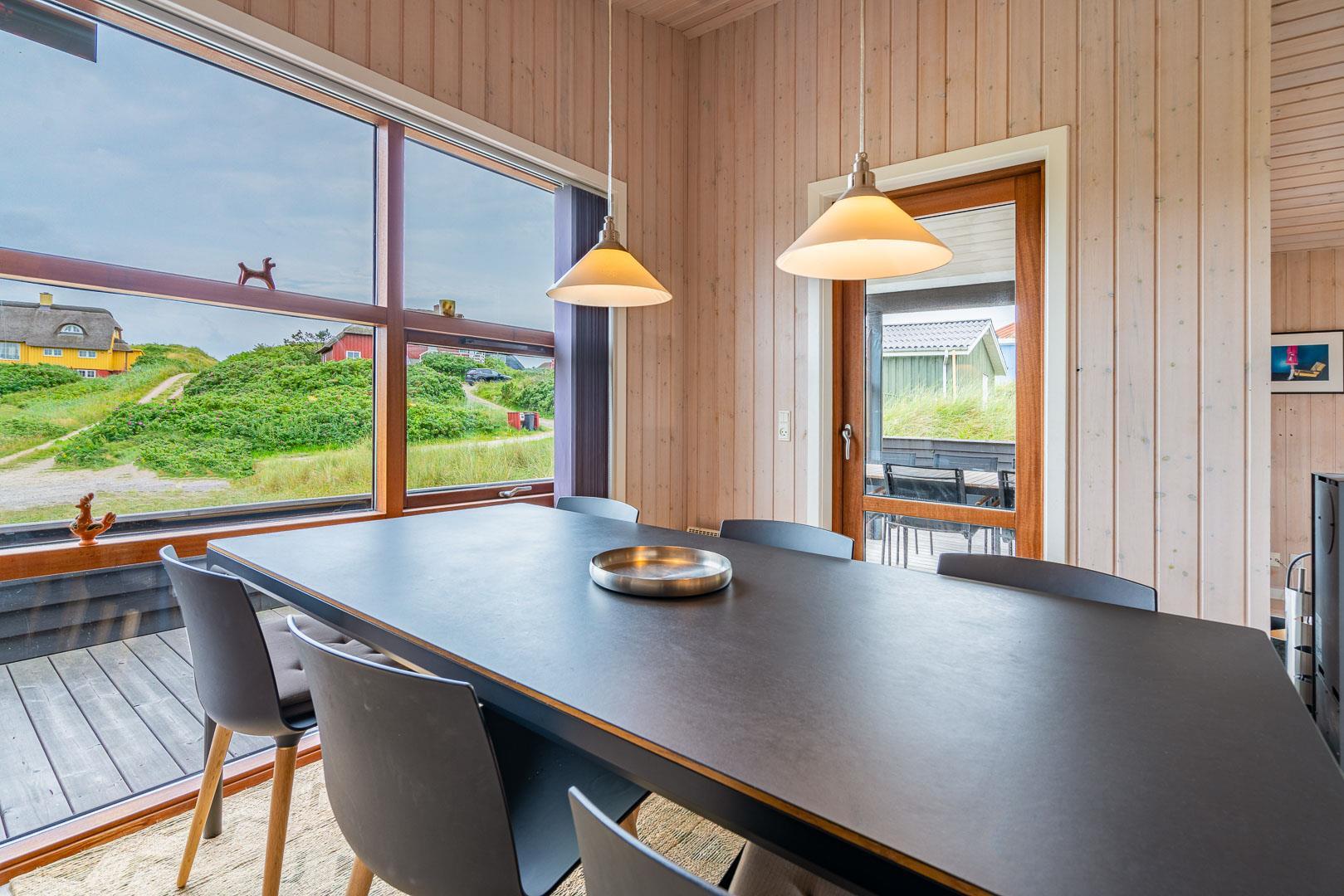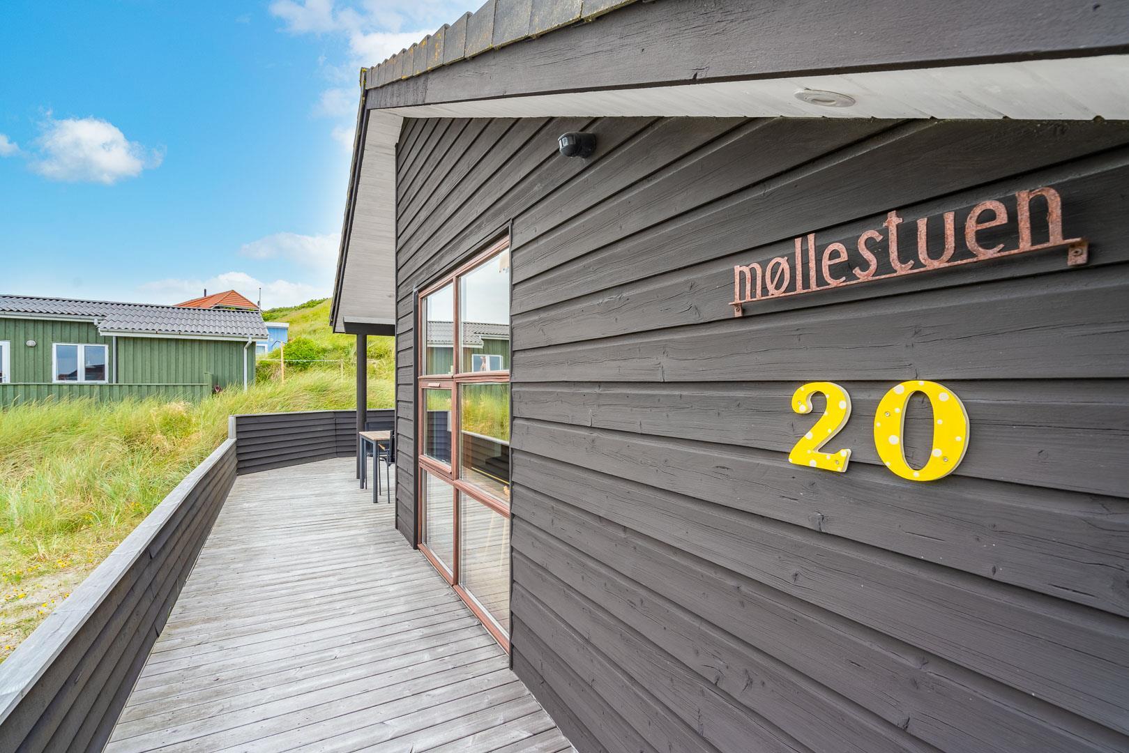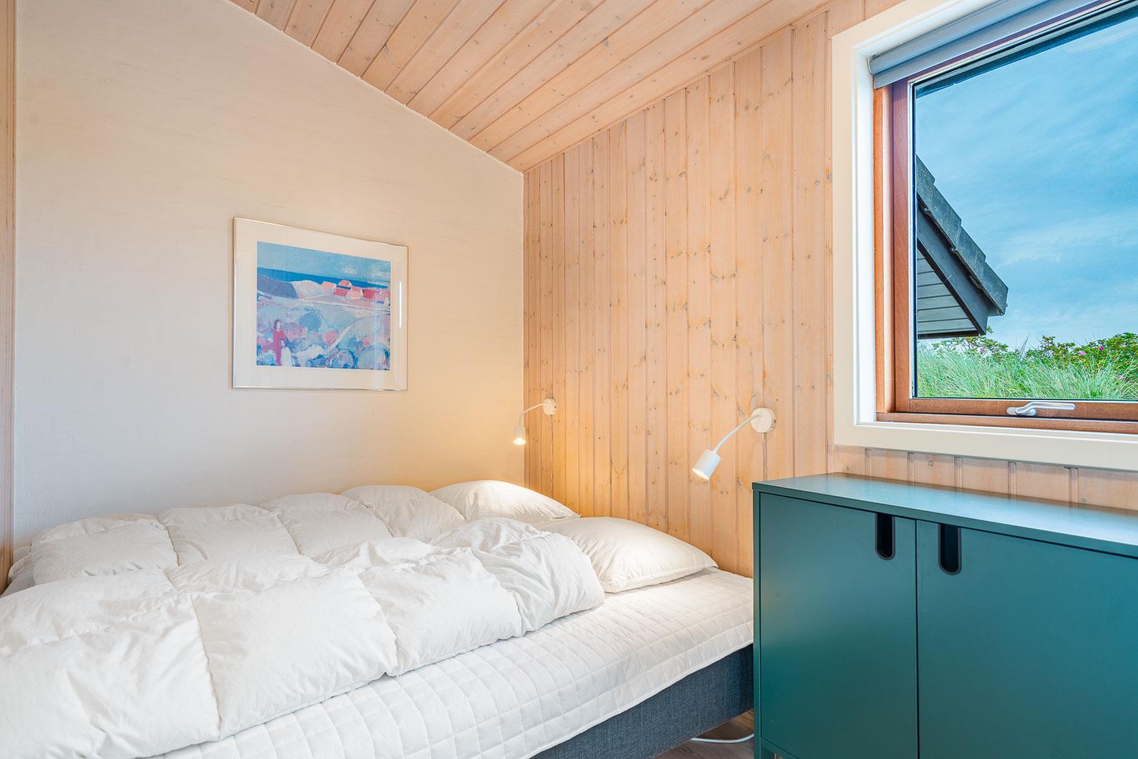 Sommerhuset byder på to badeværelser, spabad og sauna, hvor du kan slappe af efter en dag ved stranden. Udendørs finder du flere terrasser med en smuk udsigt over den kuperede klitgrund. Her kan du nyde solen i liggestole, grille lækre måltider og opleve den friske havluft.