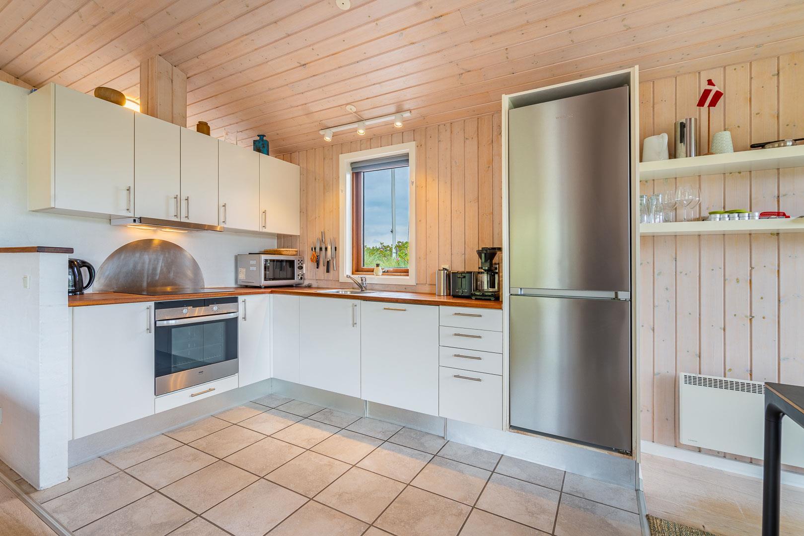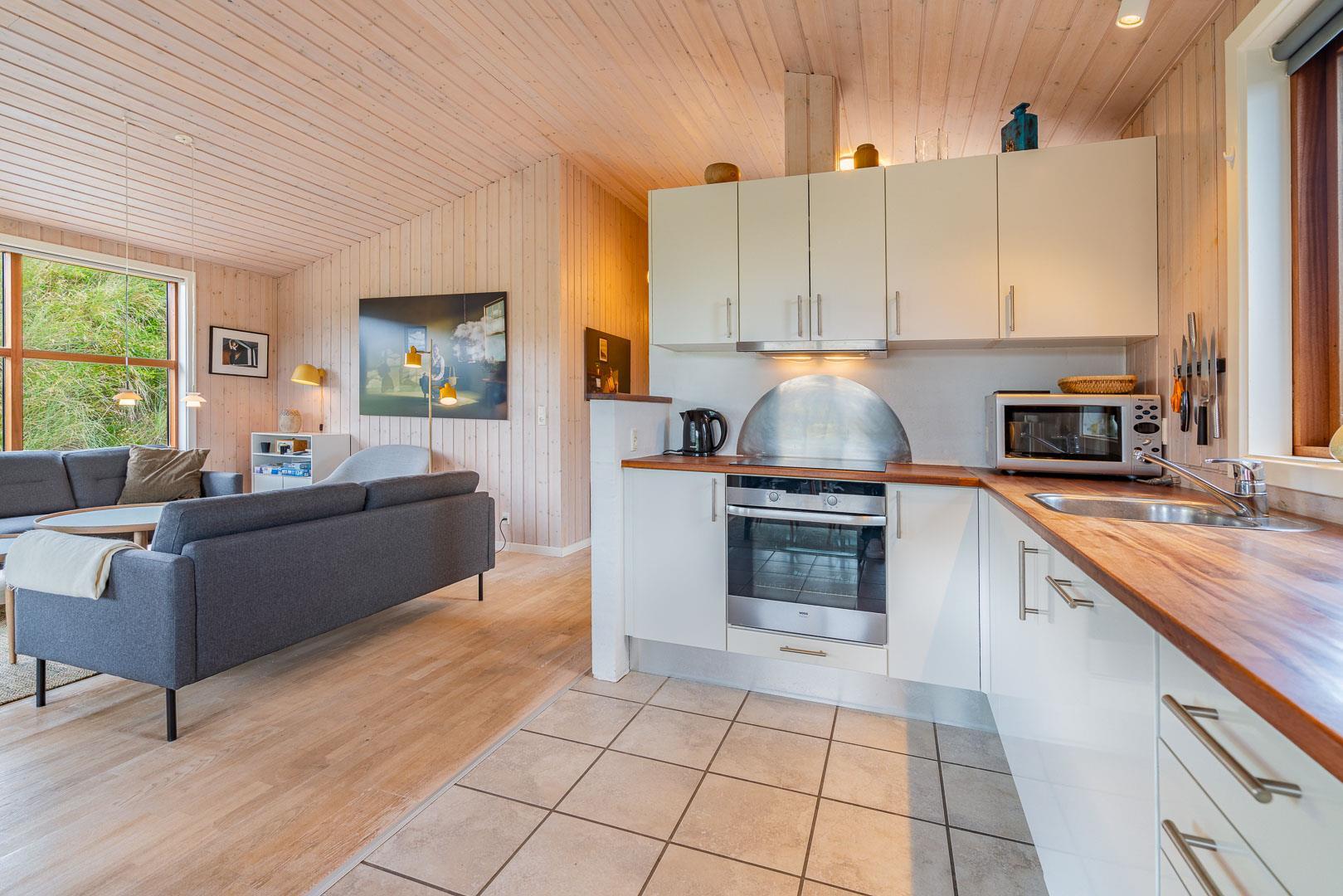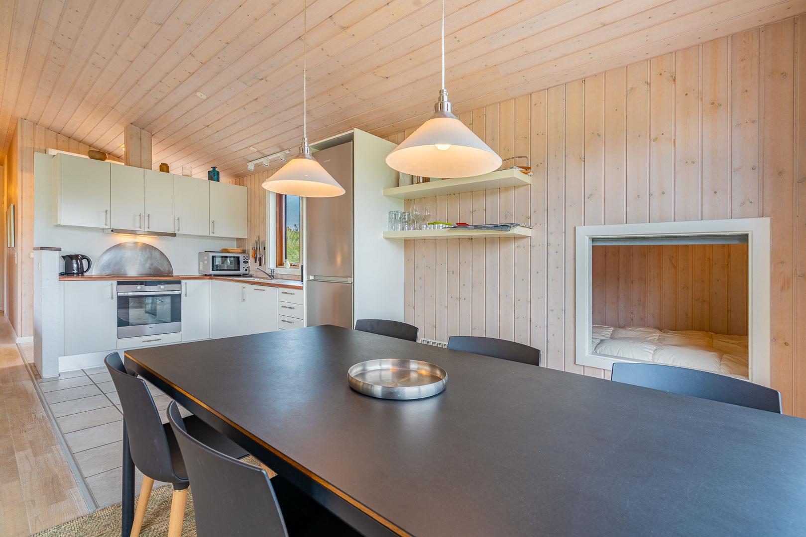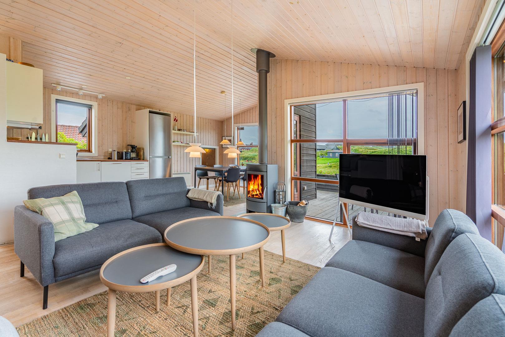 Sommerhuset er designet med fokus på både æstetik og funktionalitet. Det lyse og venlige opholdsrum har store vinduespartier, der giver en skøn atmosfære og bringer naturen helt ind i stuen. Det veludstyrede køkken er åbent og indbydende, perfekt til hyggelige måltider med familie og venner.