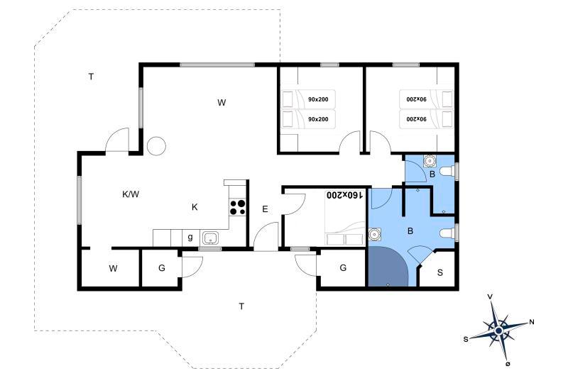 Sengestørrelser: 2 dobbeltsenge med 2 madrasser á 90 x 200 cm + 1 dobbeltseng 160 x 200 cm.