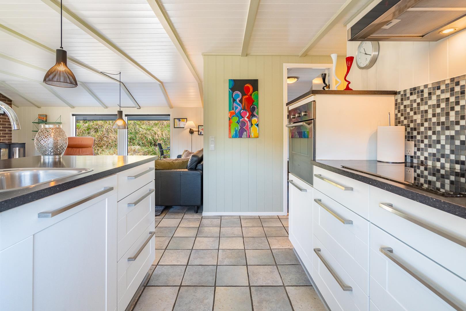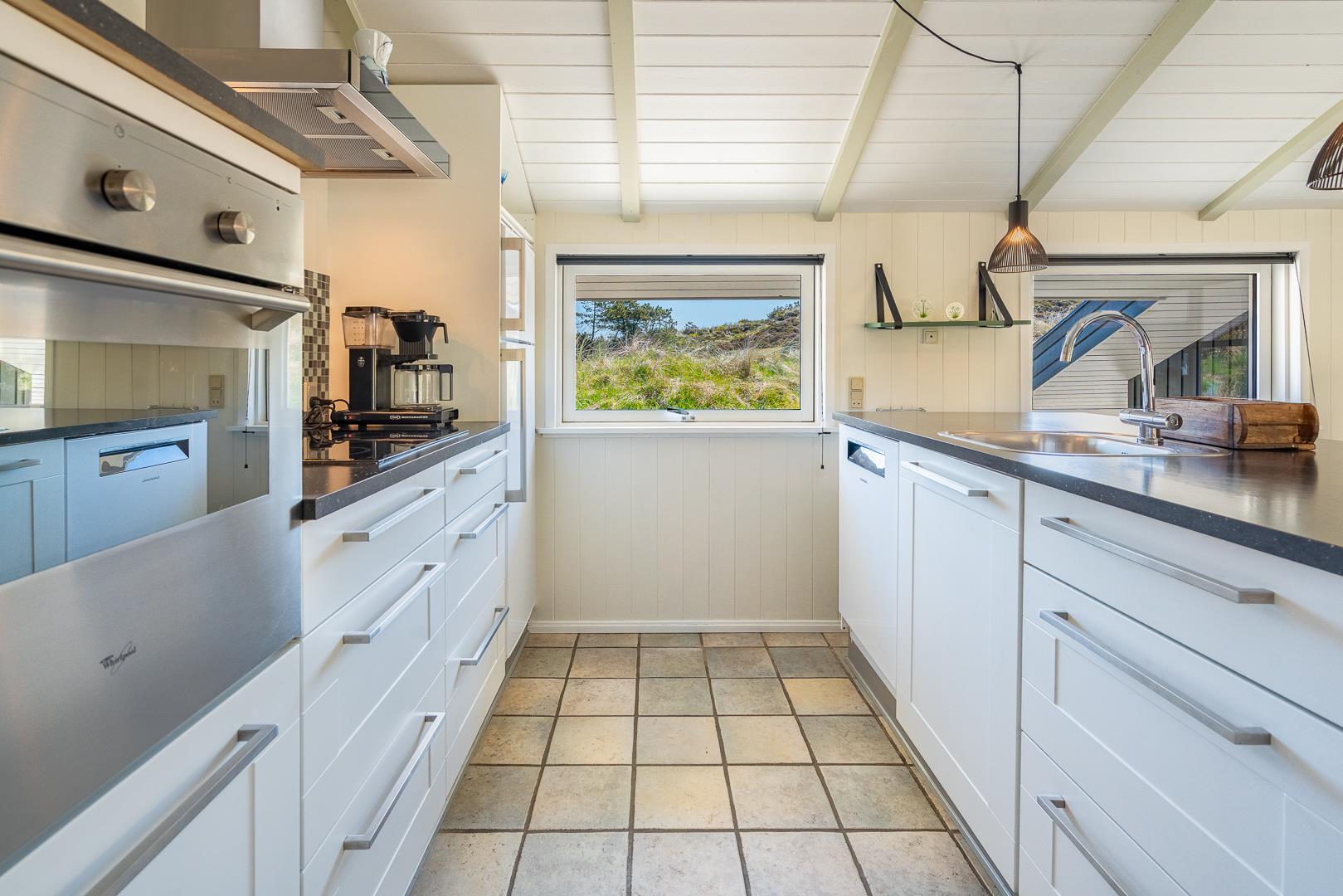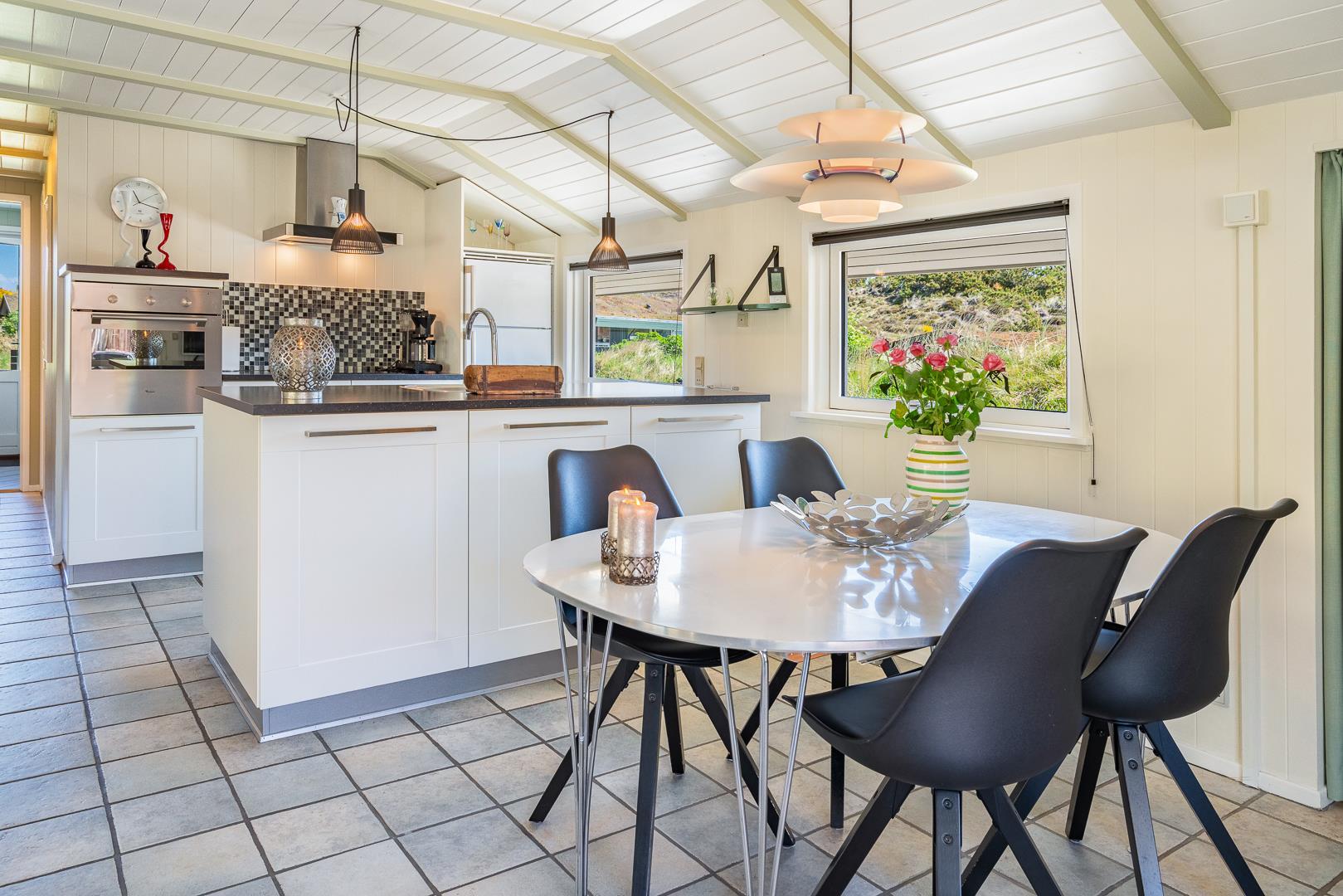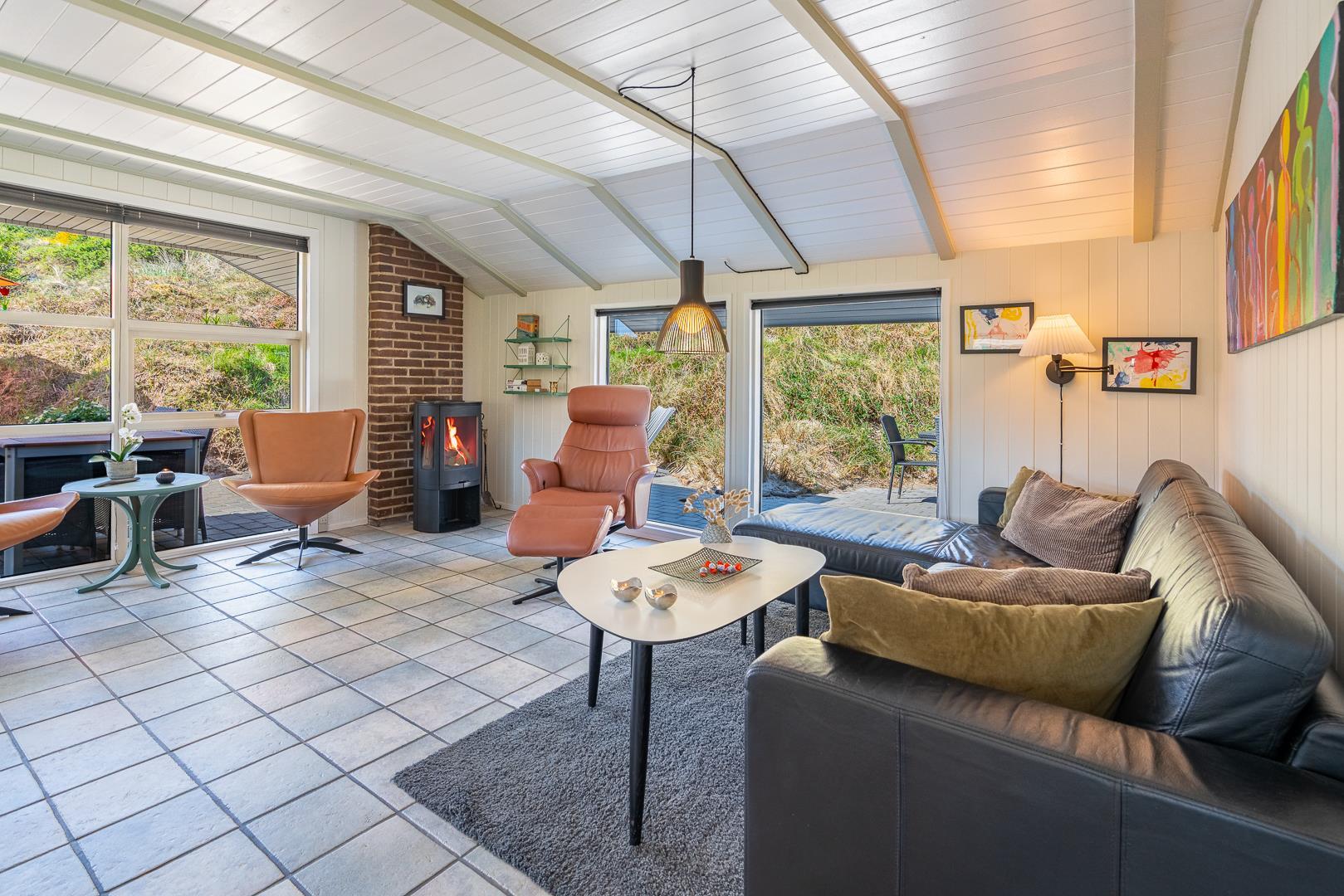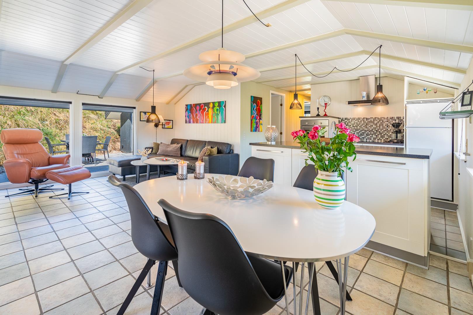 Hyggeligt og lyst indrettet feriehus, beliggende på en større kuperet naturgrund. Delvis overdækket flisebelagte terrasse som er på 2 sider af feriehuset og omkranset af en klit, som giver god læ. Lyst og godt indrettet køkken som ligger i åben forbindelse til rummelig stue med brændeovn og gode møbler . Der er klinkegulve i stue og køkken med gulvvarme og i værelserne er der trægulv. Lækkert veludstyret køkken, samt flot badeværelse. Huset fremstår overalt lyst og venligt.