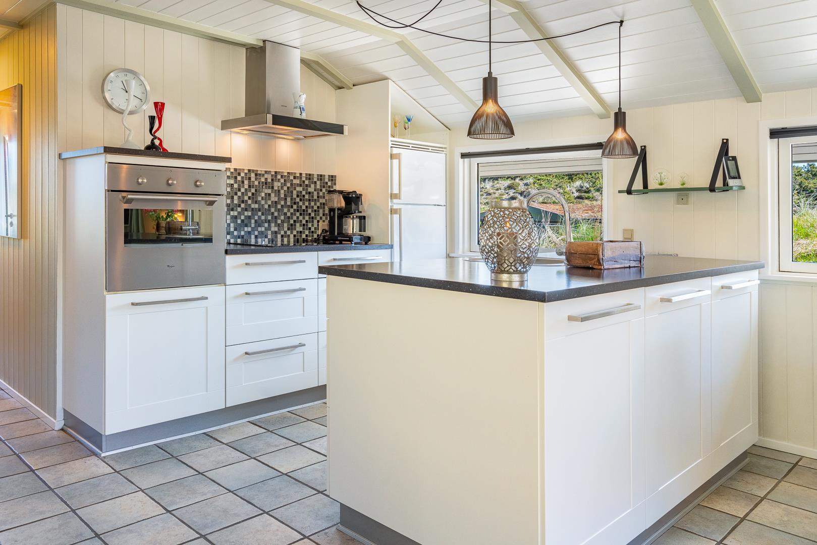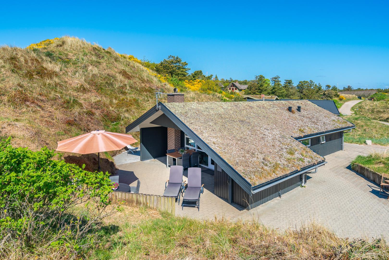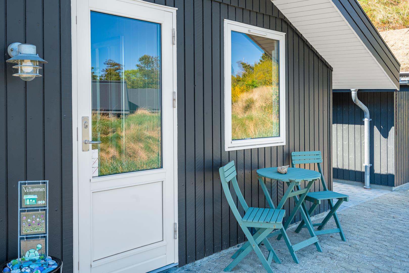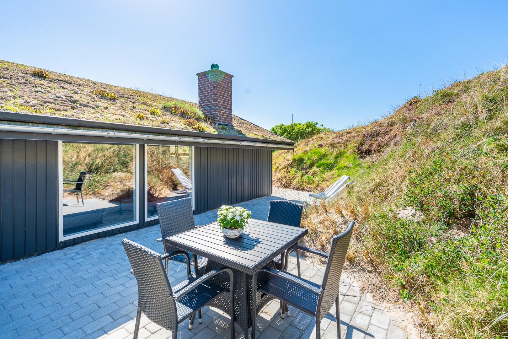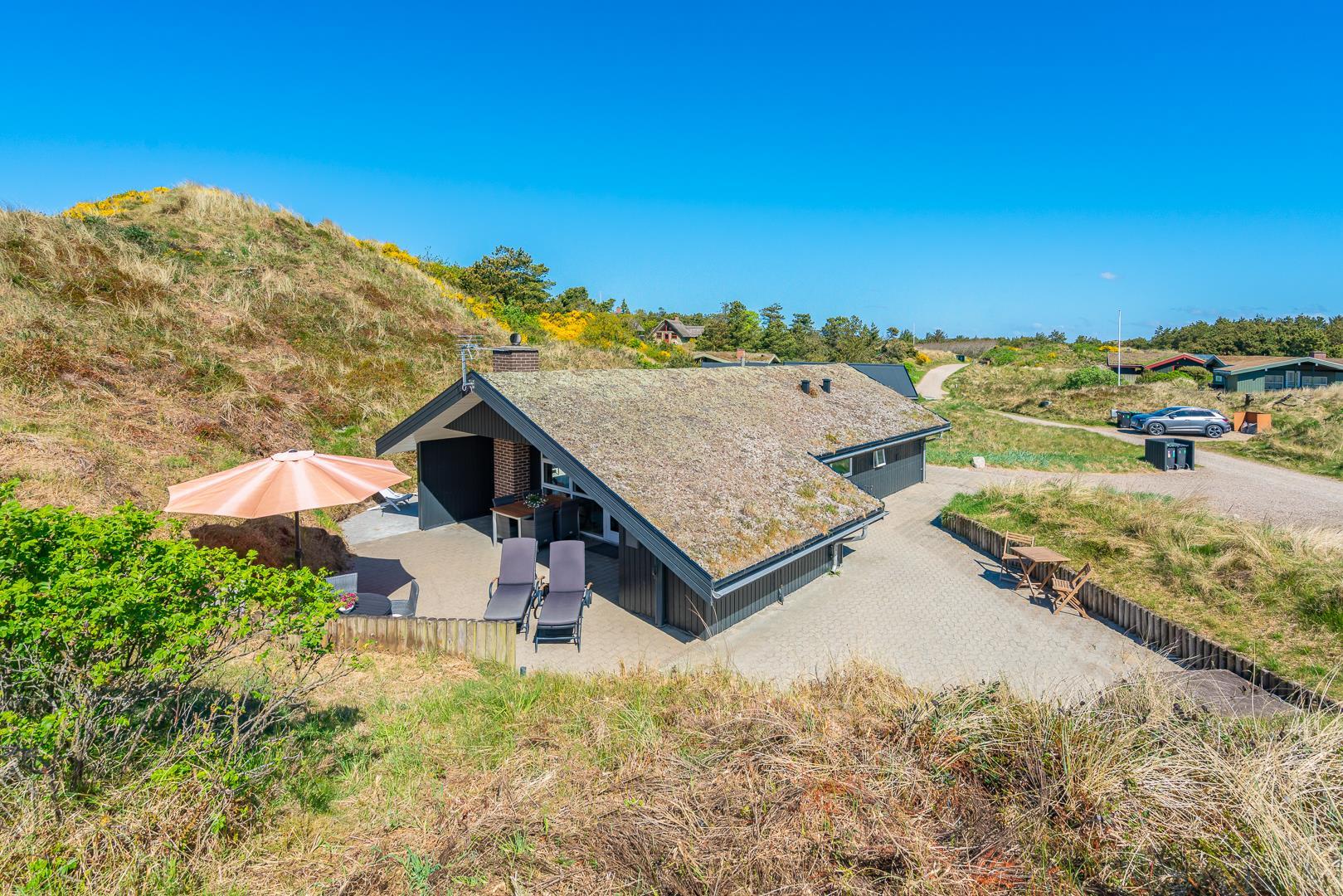 Hyggeligt og lyst indrettet feriehus, beliggende på en større kuperet naturgrund. Delvis overdækket flisebelagte terrasse som er på 2 sider af feriehuset og omkranset af en klit, som giver god læ. Lyst og godt indrettet køkken som ligger i åben forbindelse til rummelig stue med brændeovn og gode møbler . Der er klinkegulve i stue og køkken med gulvvarme og i værelserne er der trægulv. Lækkert veludstyret køkken, samt flot badeværelse. Huset fremstår overalt lyst og venligt.