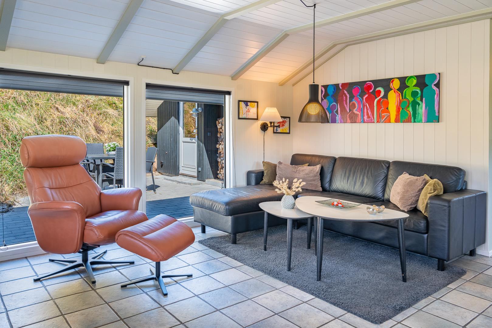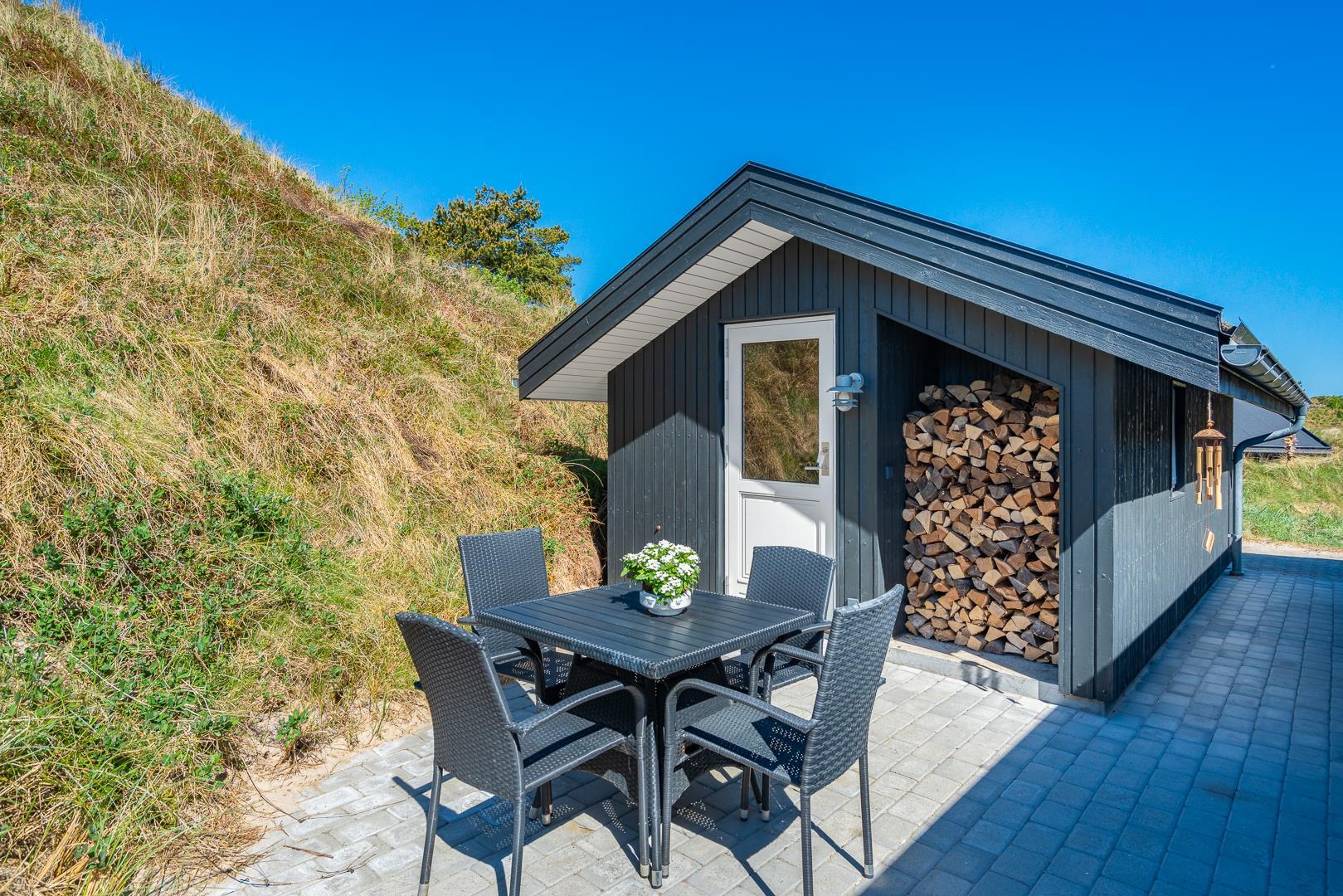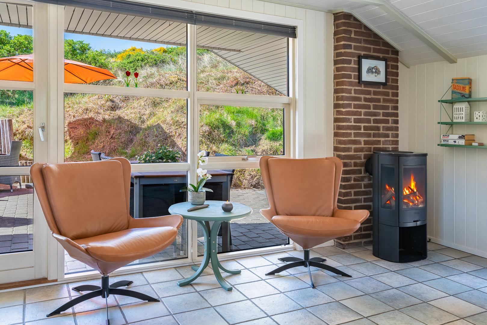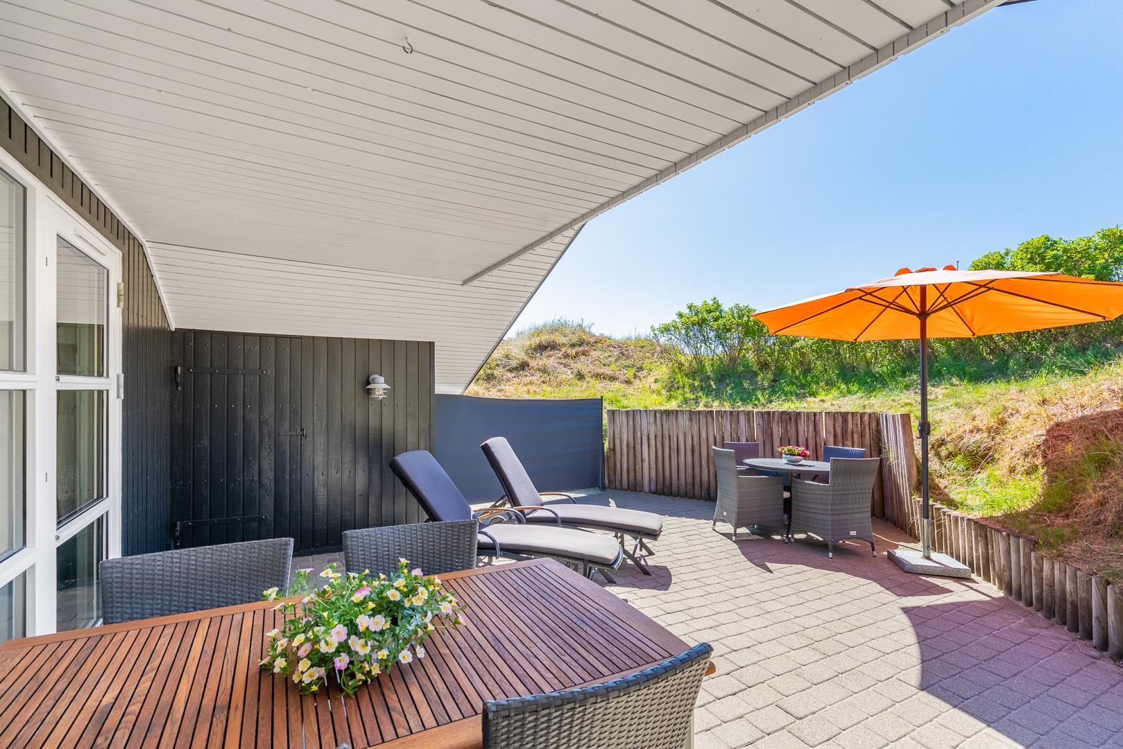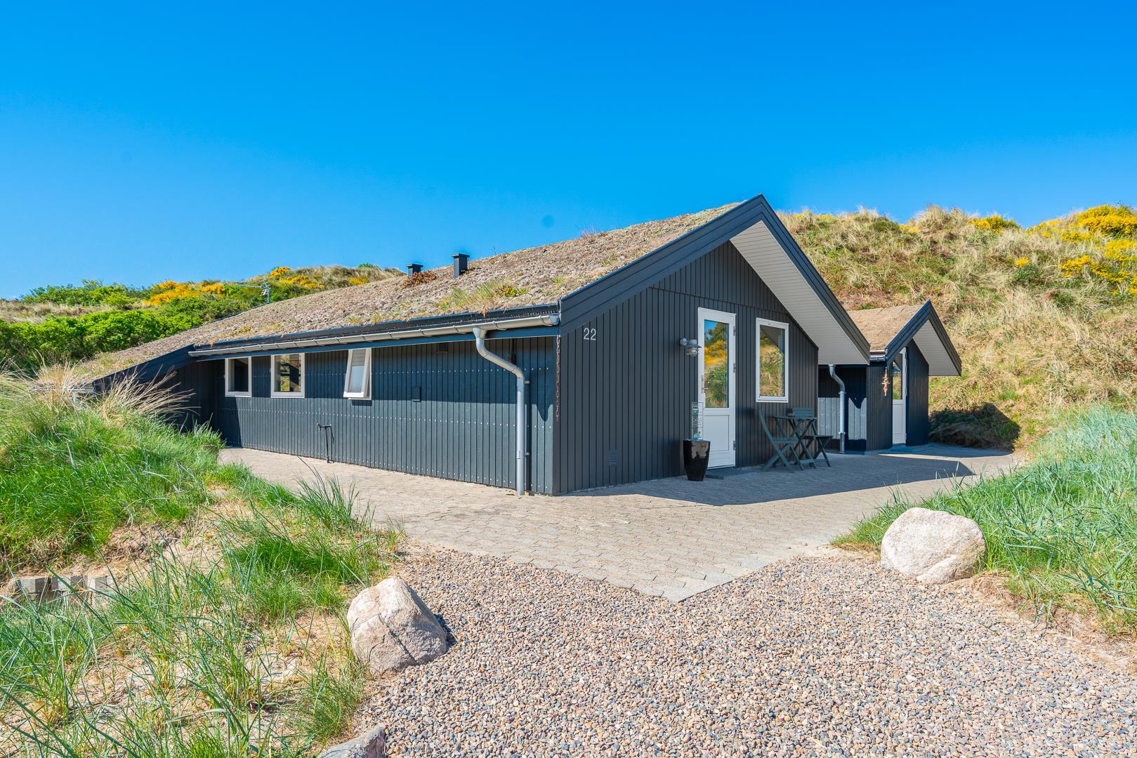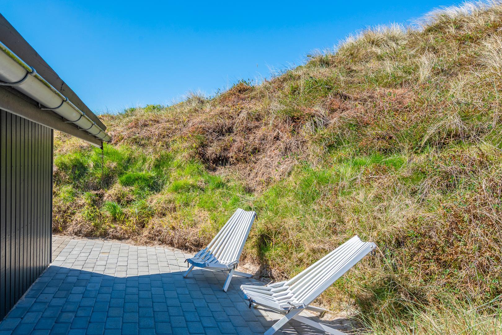 Hyggeligt og lyst indrettet feriehus, beliggende på en større kuperet naturgrund. Delvis overdækket flisebelagte terrasse som er på 2 sider af feriehuset og omkranset af en klit, som giver god læ. Lyst og godt indrettet køkken som ligger i åben forbindelse til rummelig stue med brændeovn og gode møbler . Der er klinkegulve i stue og køkken med gulvvarme og i værelserne er der trægulv. Lækkert veludstyret køkken, samt flot badeværelse. Huset fremstår overalt lyst og venligt.