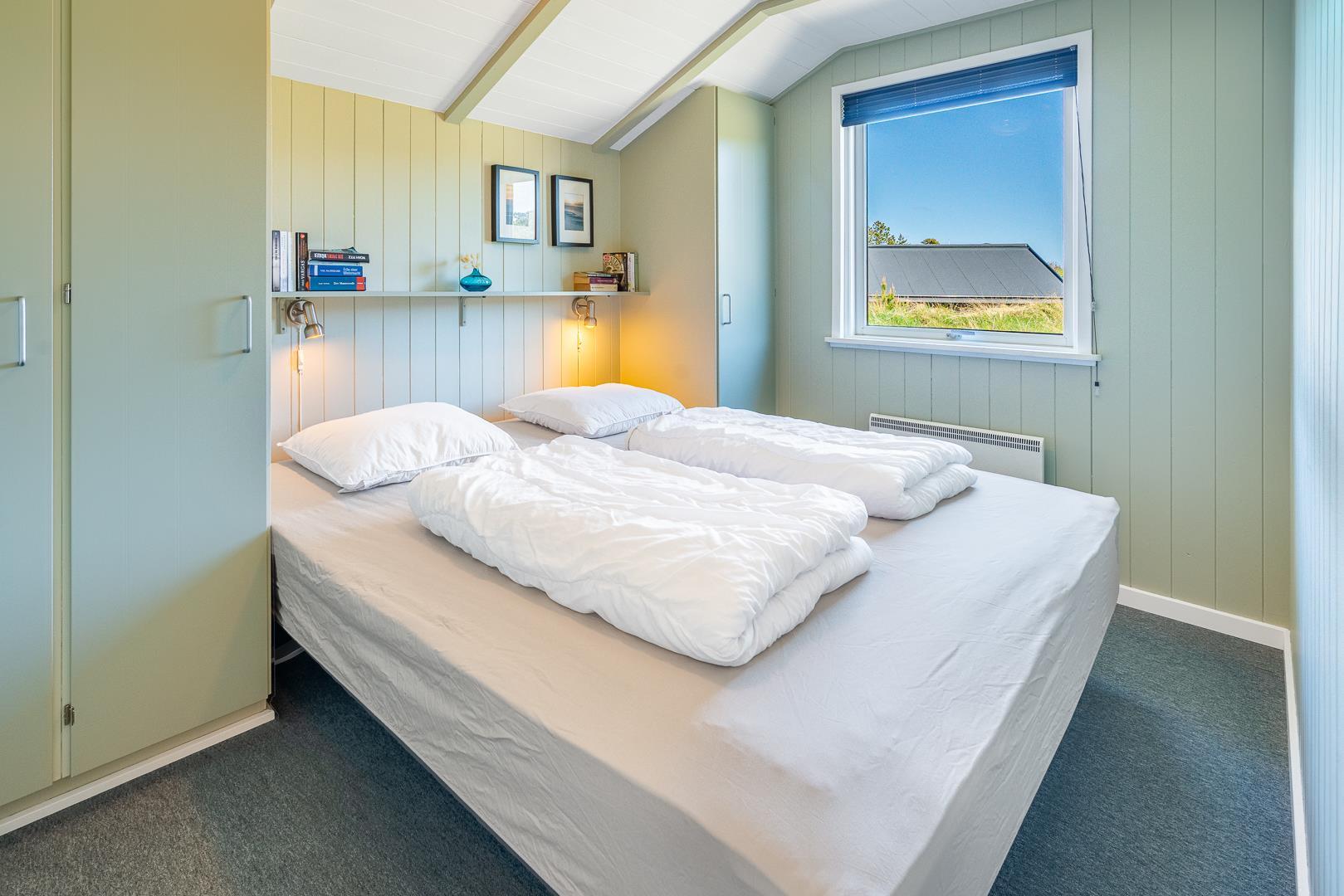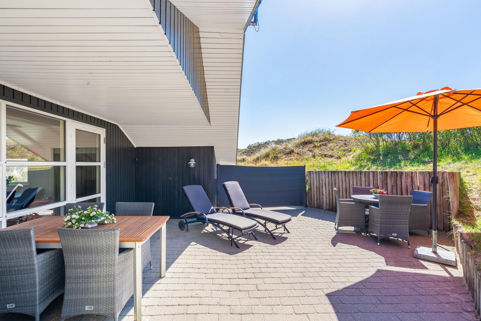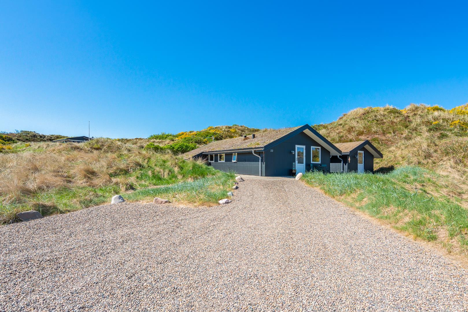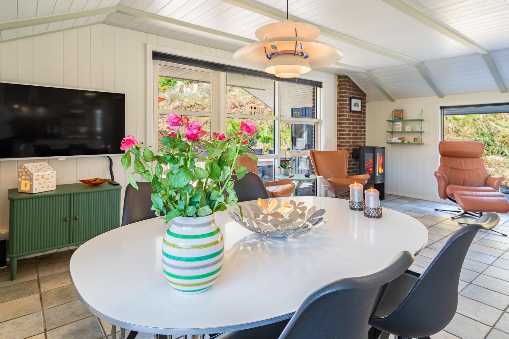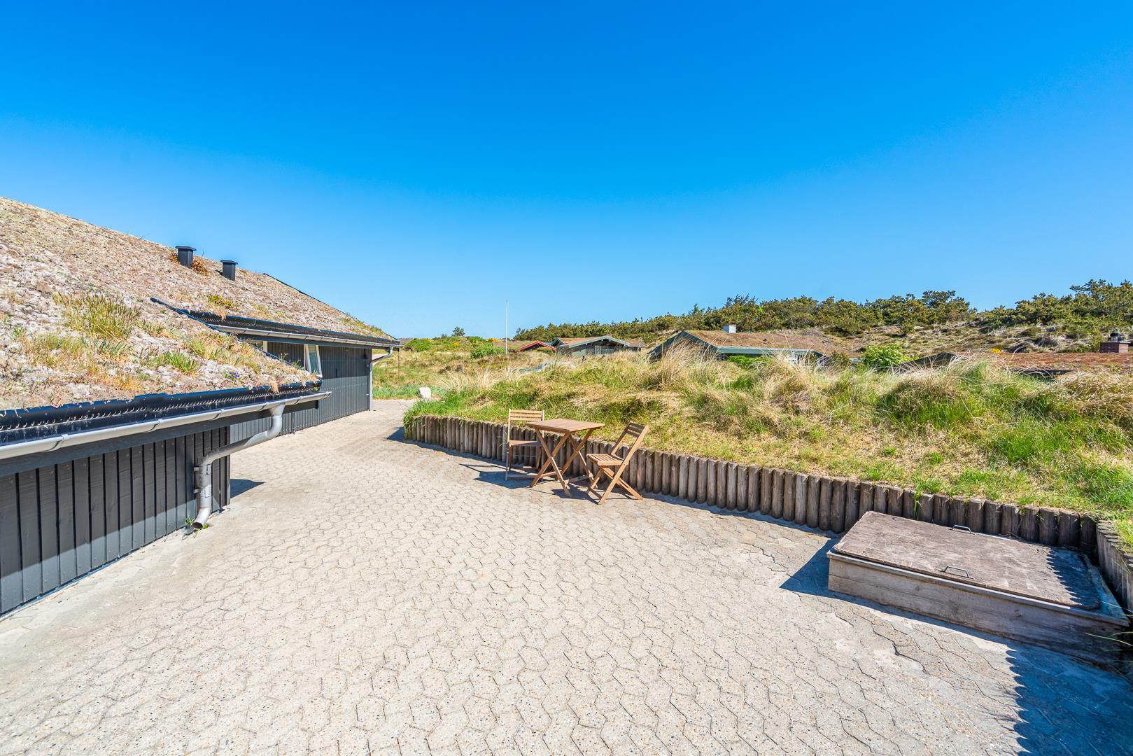 Hyggeligt og lyst indrettet feriehus, beliggende på en større kuperet naturgrund. Delvis overdækket flisebelagte terrasse som er på 2 sider af feriehuset og omkranset af en klit, som giver god læ. Lyst og godt indrettet køkken som ligger i åben forbindelse til rummelig stue med brændeovn og gode møbler . Der er klinkegulve i stue og køkken med gulvvarme og i værelserne er der trægulv. Lækkert veludstyret køkken, samt flot badeværelse. Huset fremstår overalt lyst og venligt.