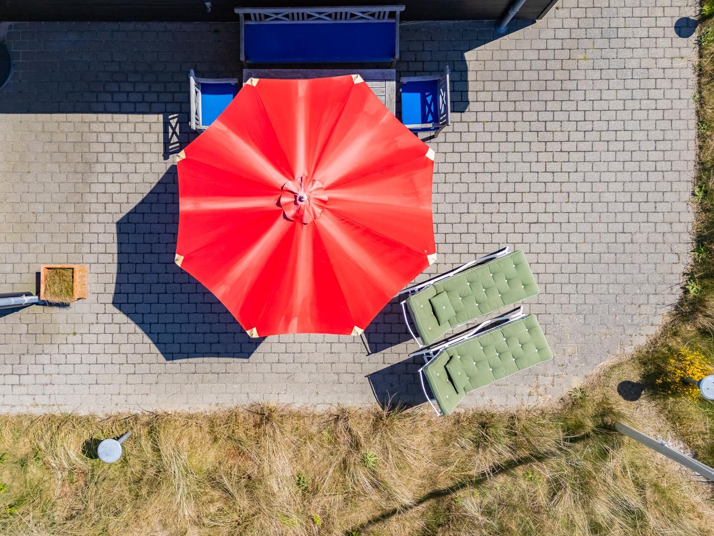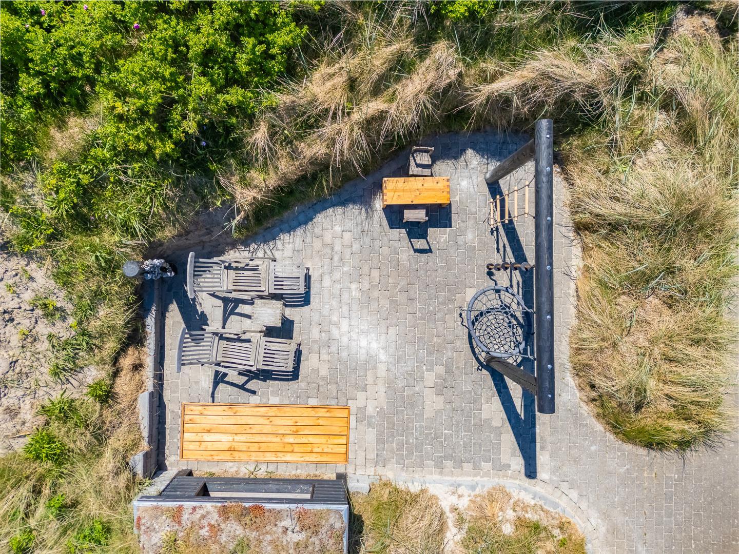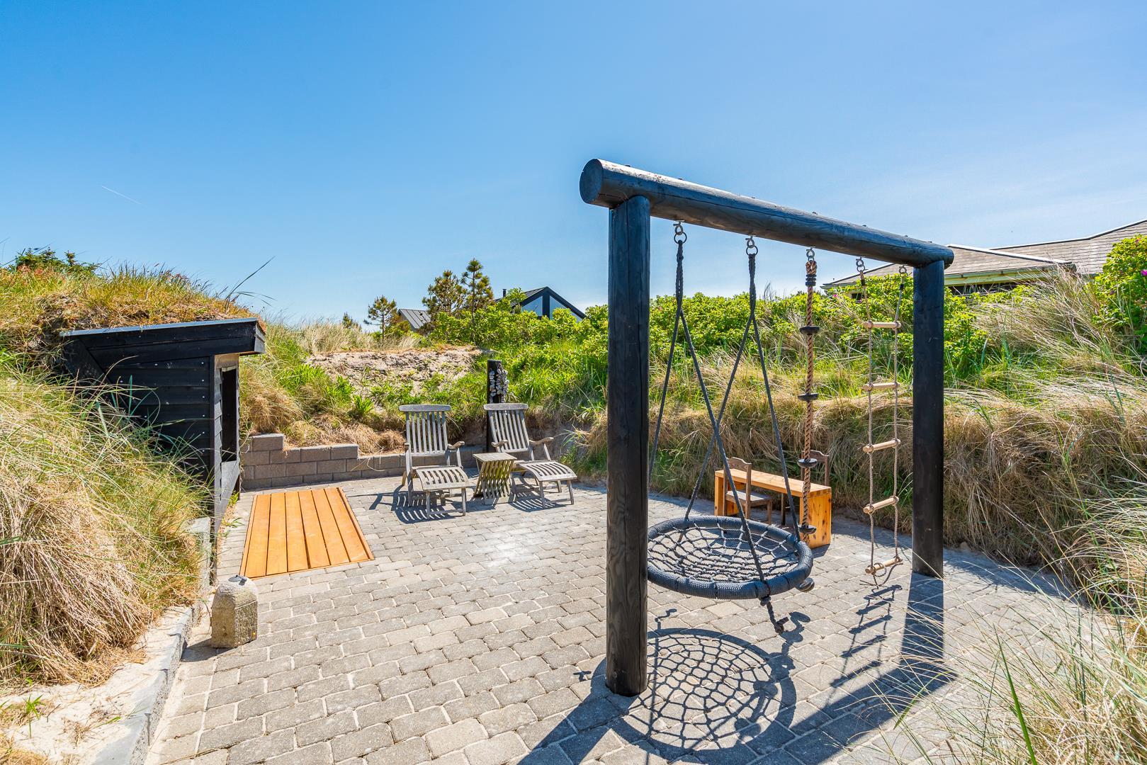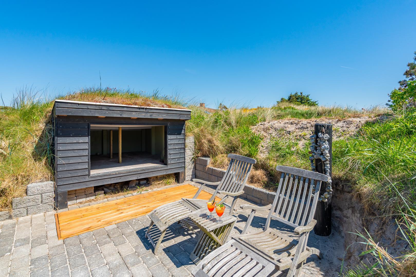 Det store, private udeområde er en sand perle. Den østvendte terrasse er både overdækket og åben, så du kan starte dagen med morgenmad i solen eller finde skygge på de varme sommerdage. Grunden er udstyret med et shelter/legehus, der gør huset ekstra attraktivt for børnefamilier eller dem, der vil prøve en nat i naturen – tæt på, men stadig bekvemt.