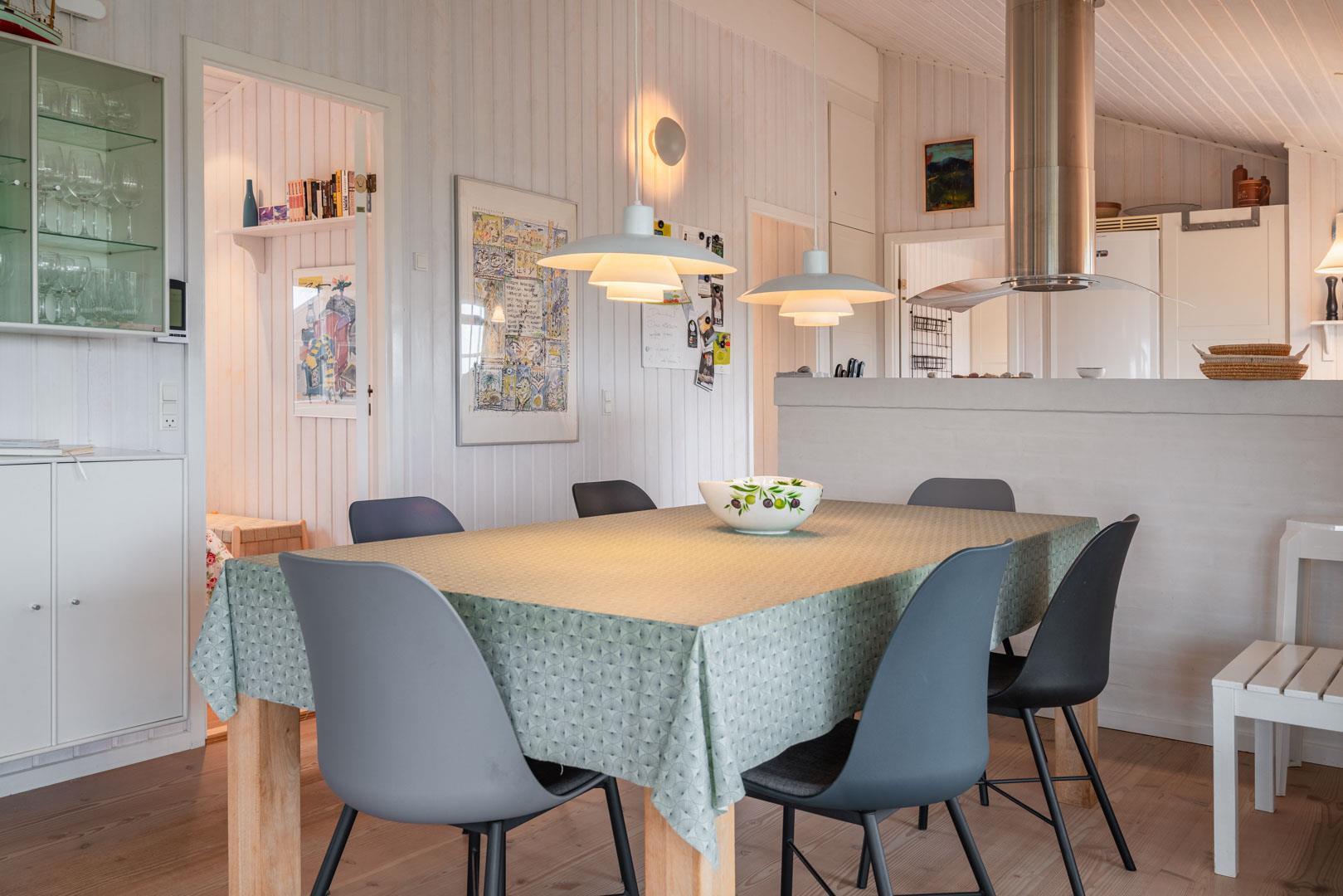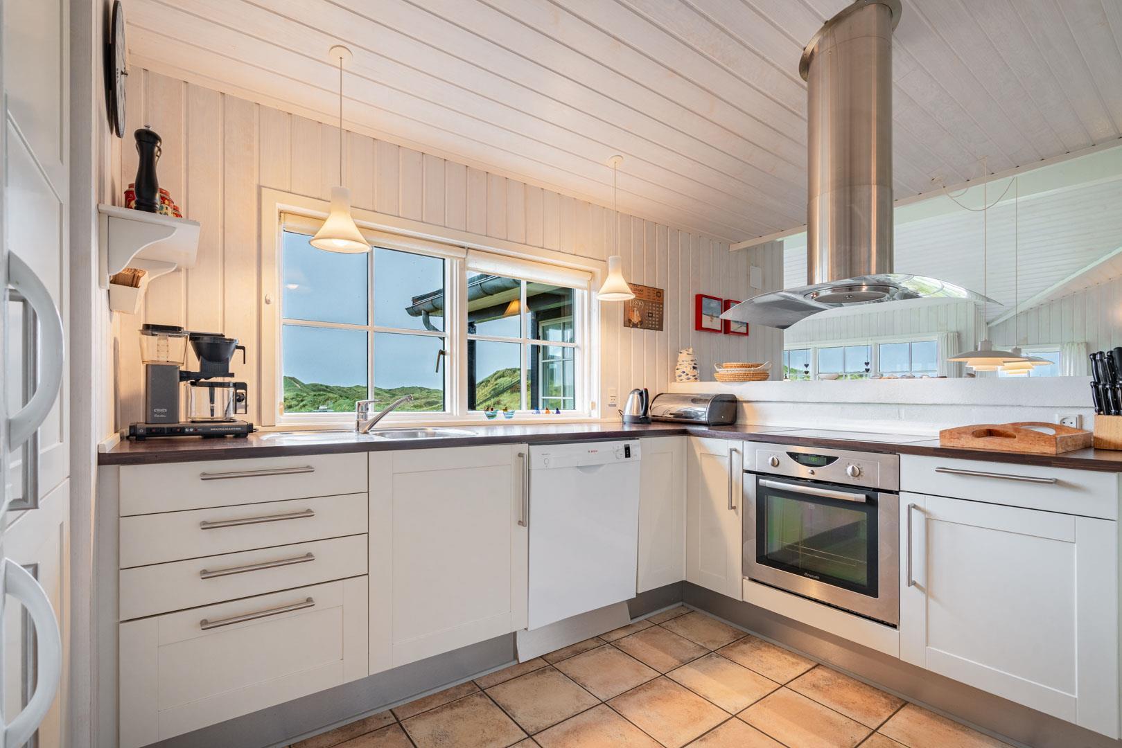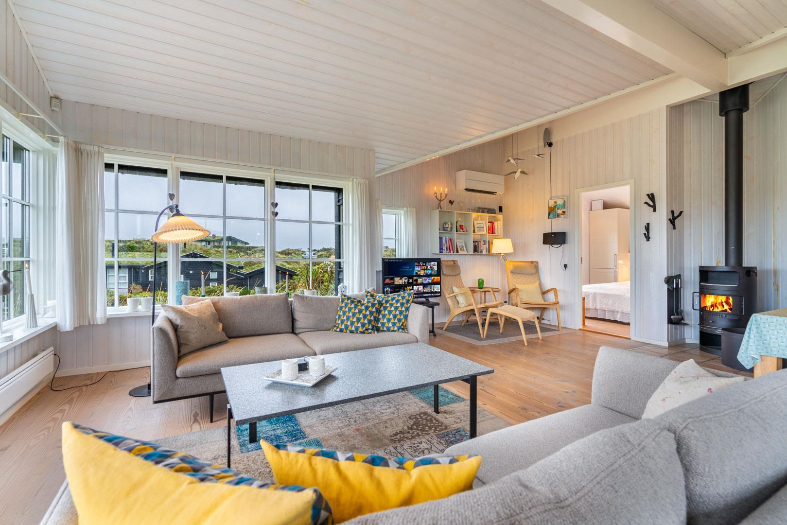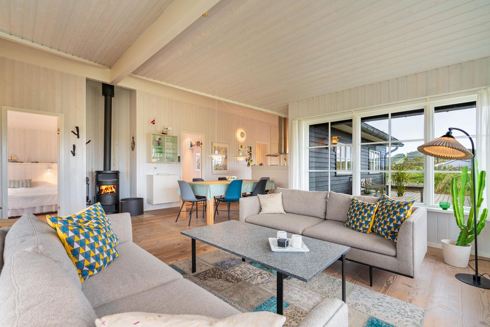 Huset er indrettet med fokus på komfort og stil, og det veludstyrede køkken ligger i åben forbindelse med spisestuen og stuen. Her får du et lyst og rummeligt opholdsrum, hvor hele familien kan samles. Fra stuen er der direkte adgang til en stor vestvendt terrasse, hvor du kan nyde solnedgangen og den friske havluft.
