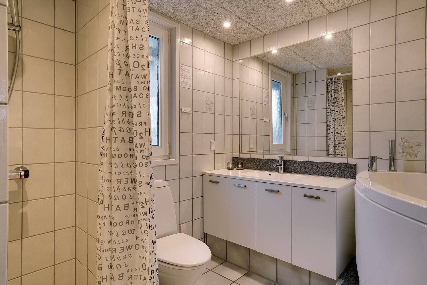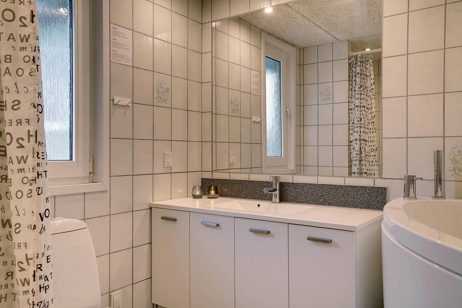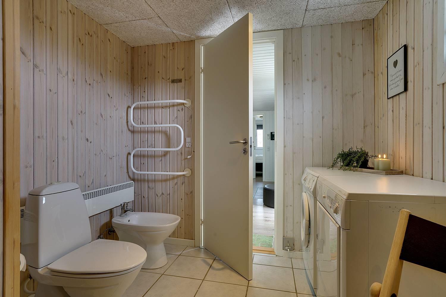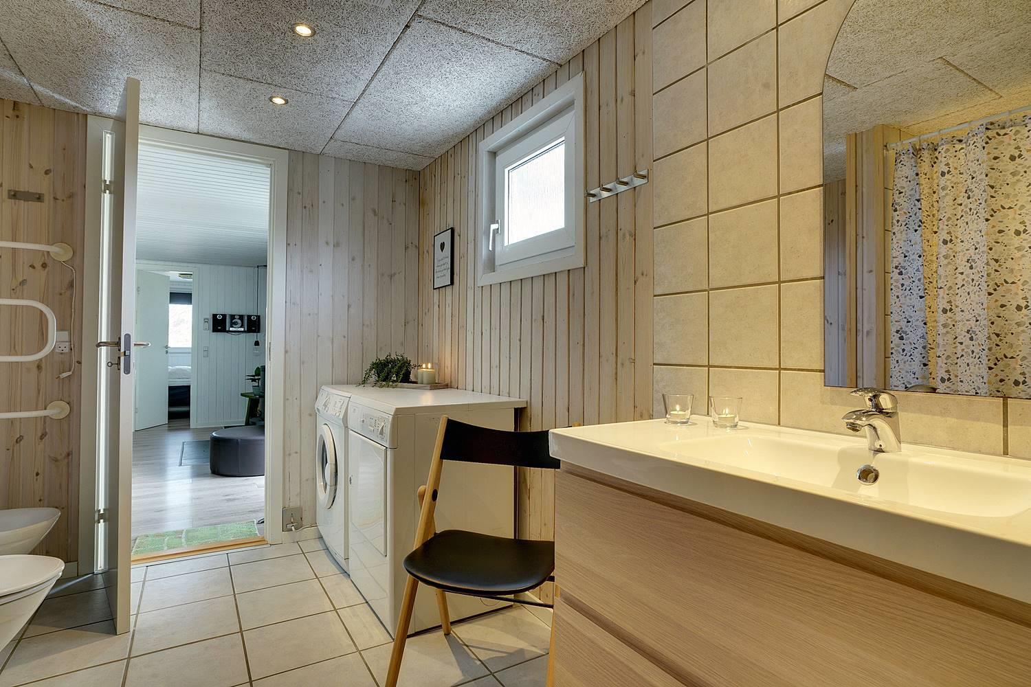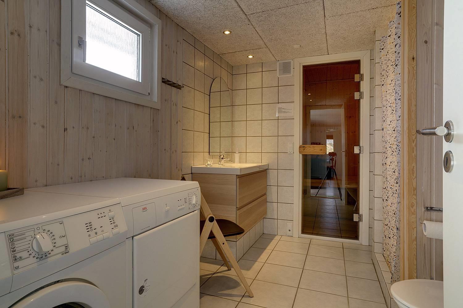 Hjelmevej 148 har badeværelser med sauna, vaskemaskine og tørretumbler, samt ekstra badeværelse med spa.