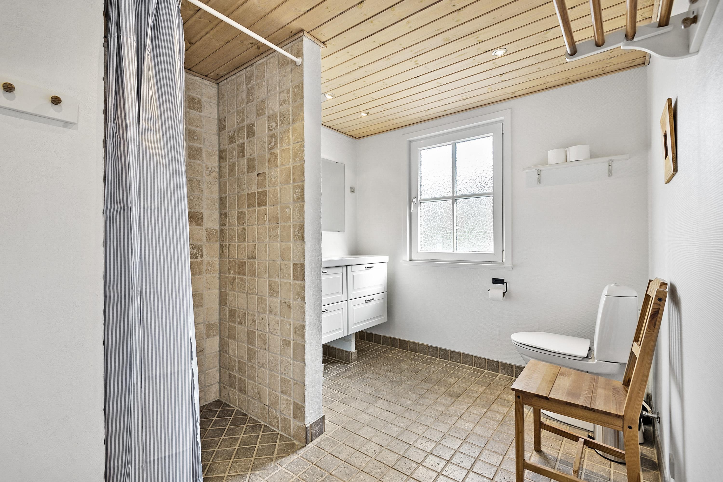 Lyst badeværelse med nyt badeværelsesinteriør og gulvvarme.