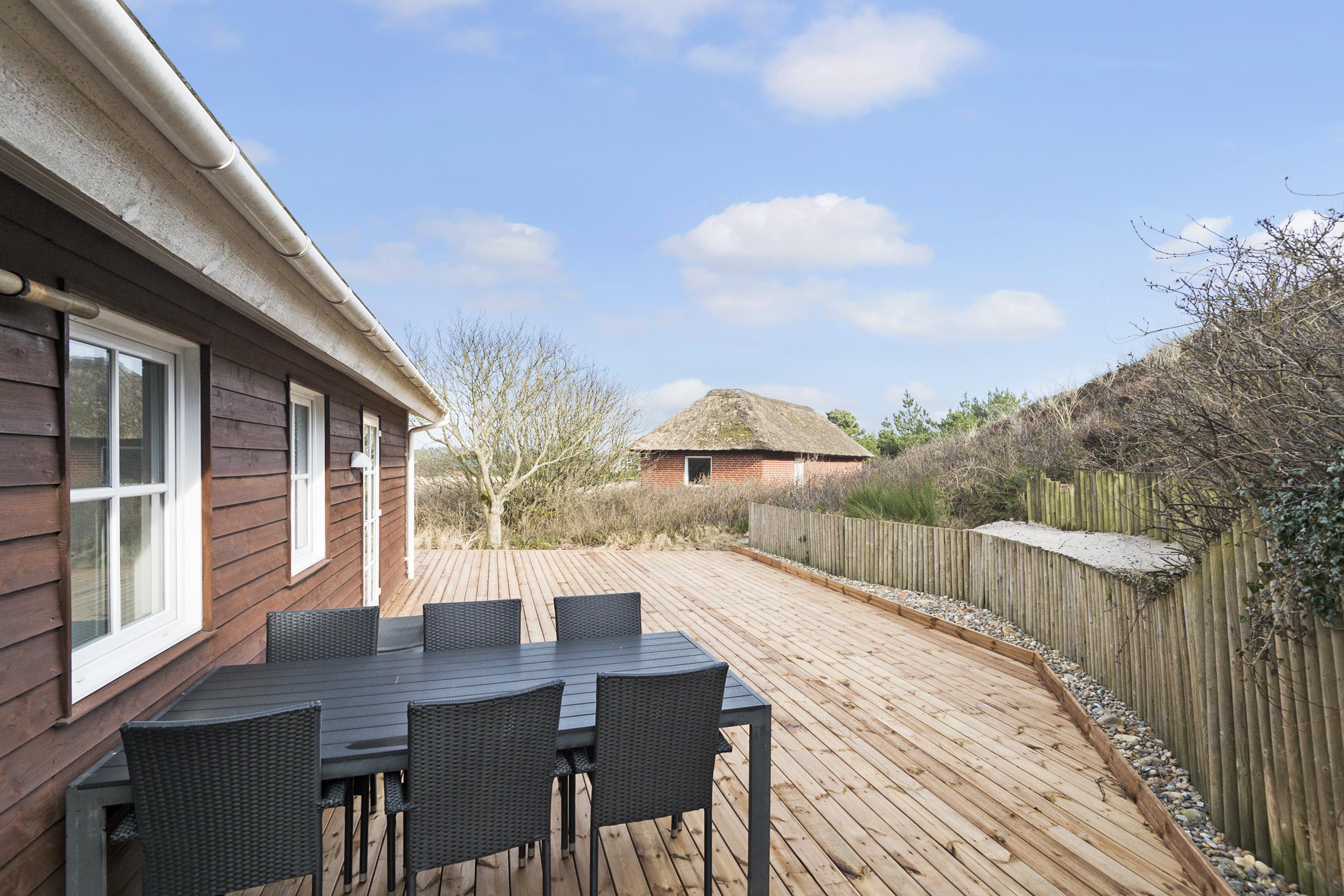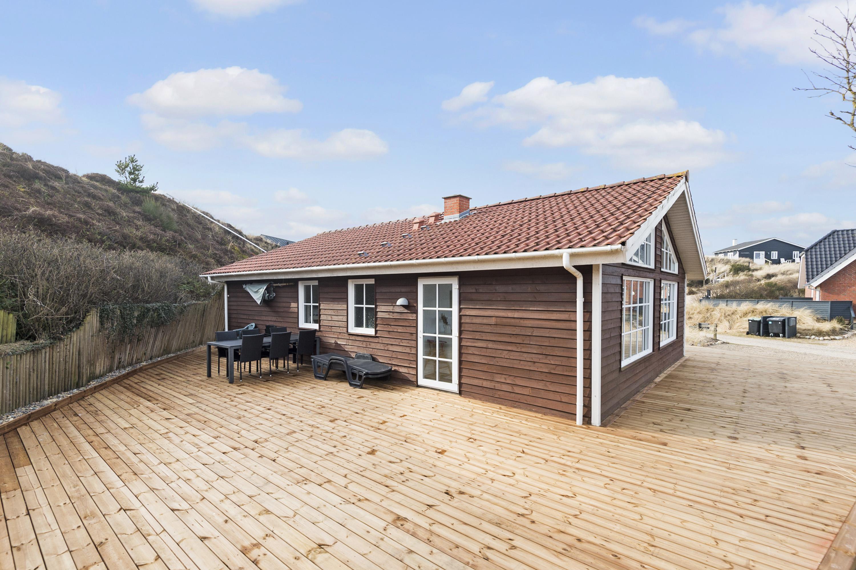 Der er en stor træ terrasse rundt om hele huset. Terrassen mod syd er særlig fantastisk, idet den ligger i læ af den store klit på grunden. Fra terrassen er der sti til toppen.