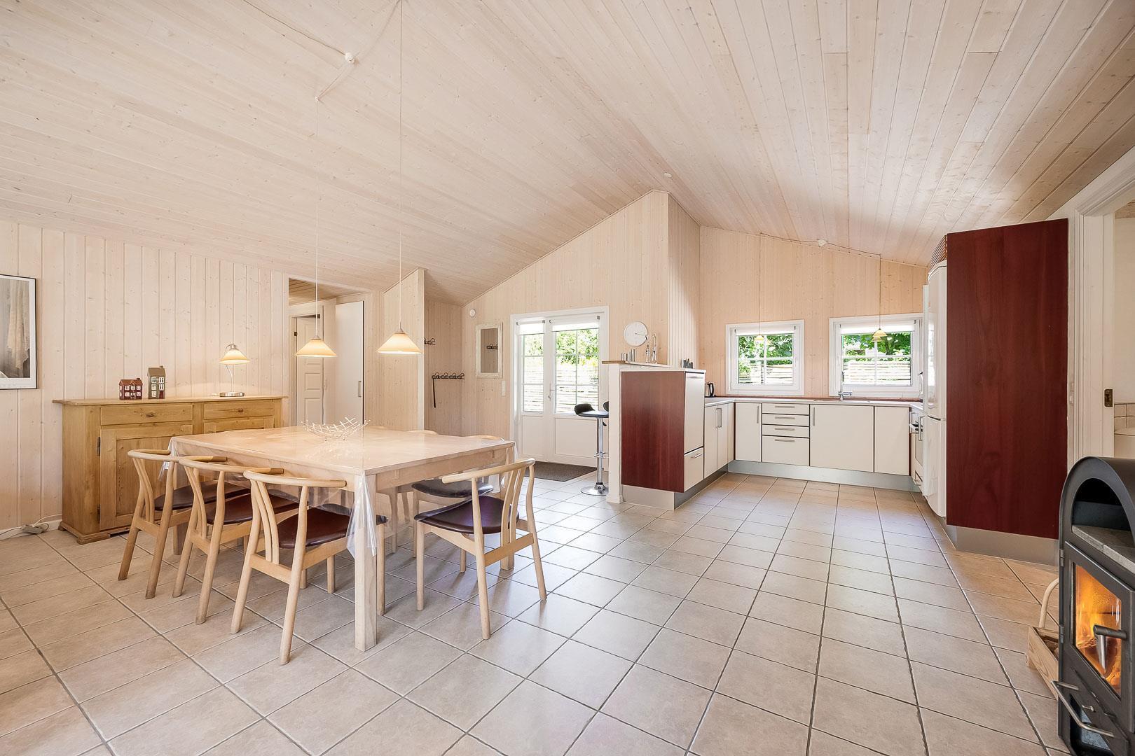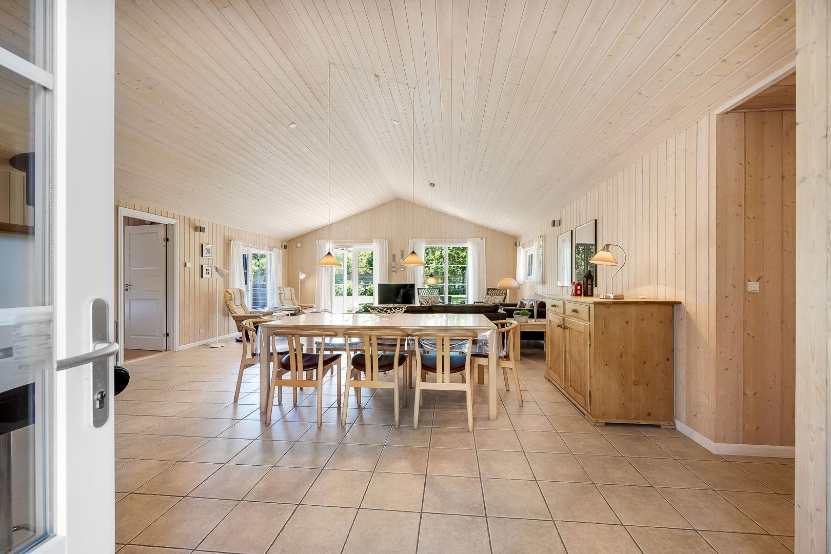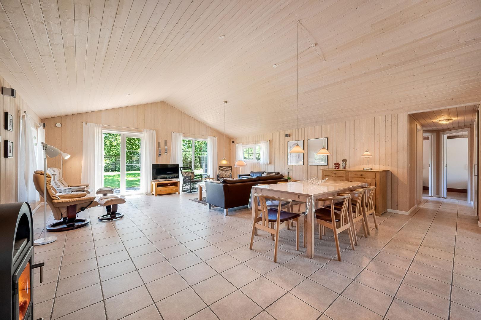 Med husets 4 soverum og 2 badeværelser, hvor det ene er med sauna og standvandsspa, egner huset sig til 8 personer. Køkkenet ligger i forbindelse med spisestue og stue, et dejligt lyst rum med loft til kip. Fra stue er der udgang til terrasse.