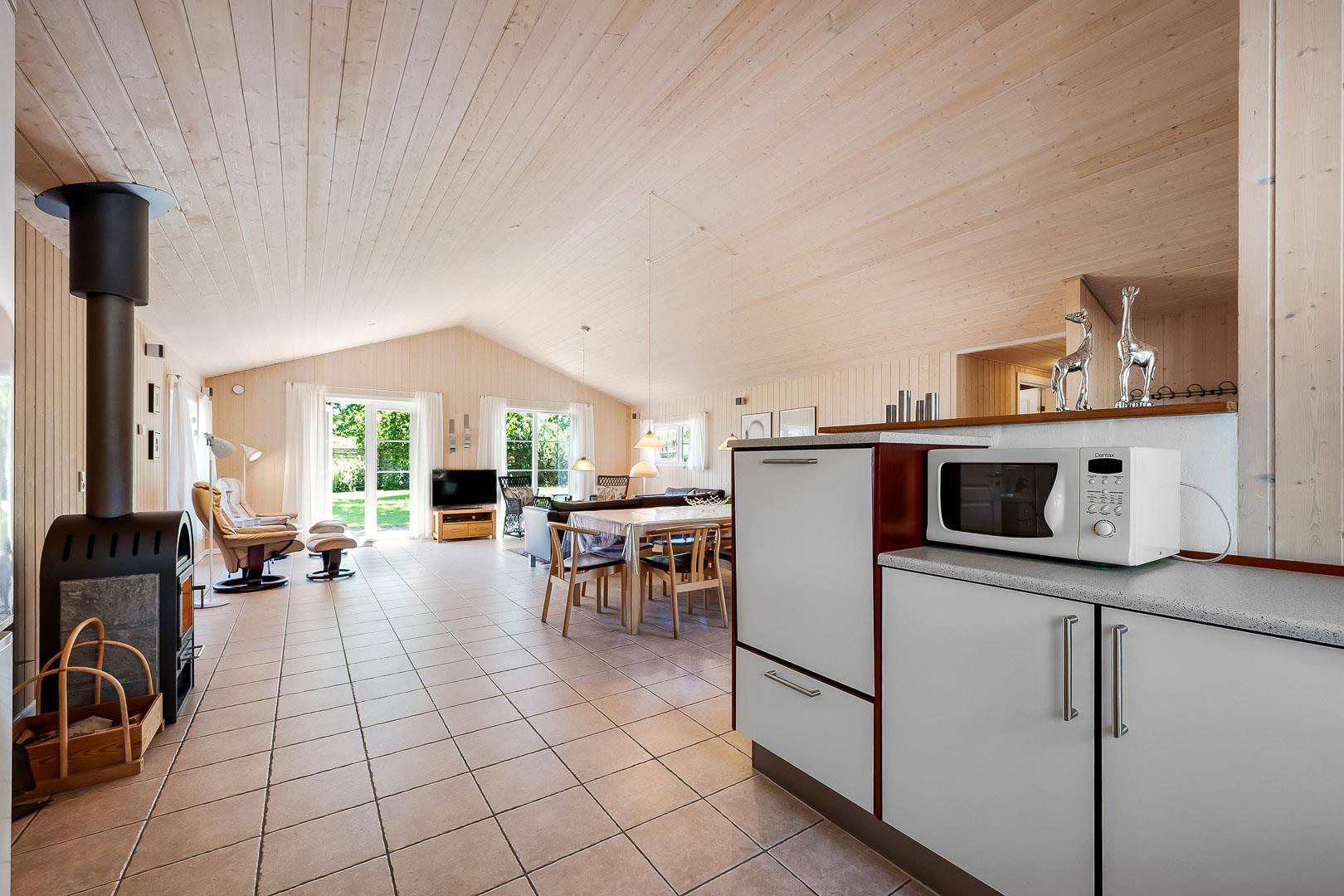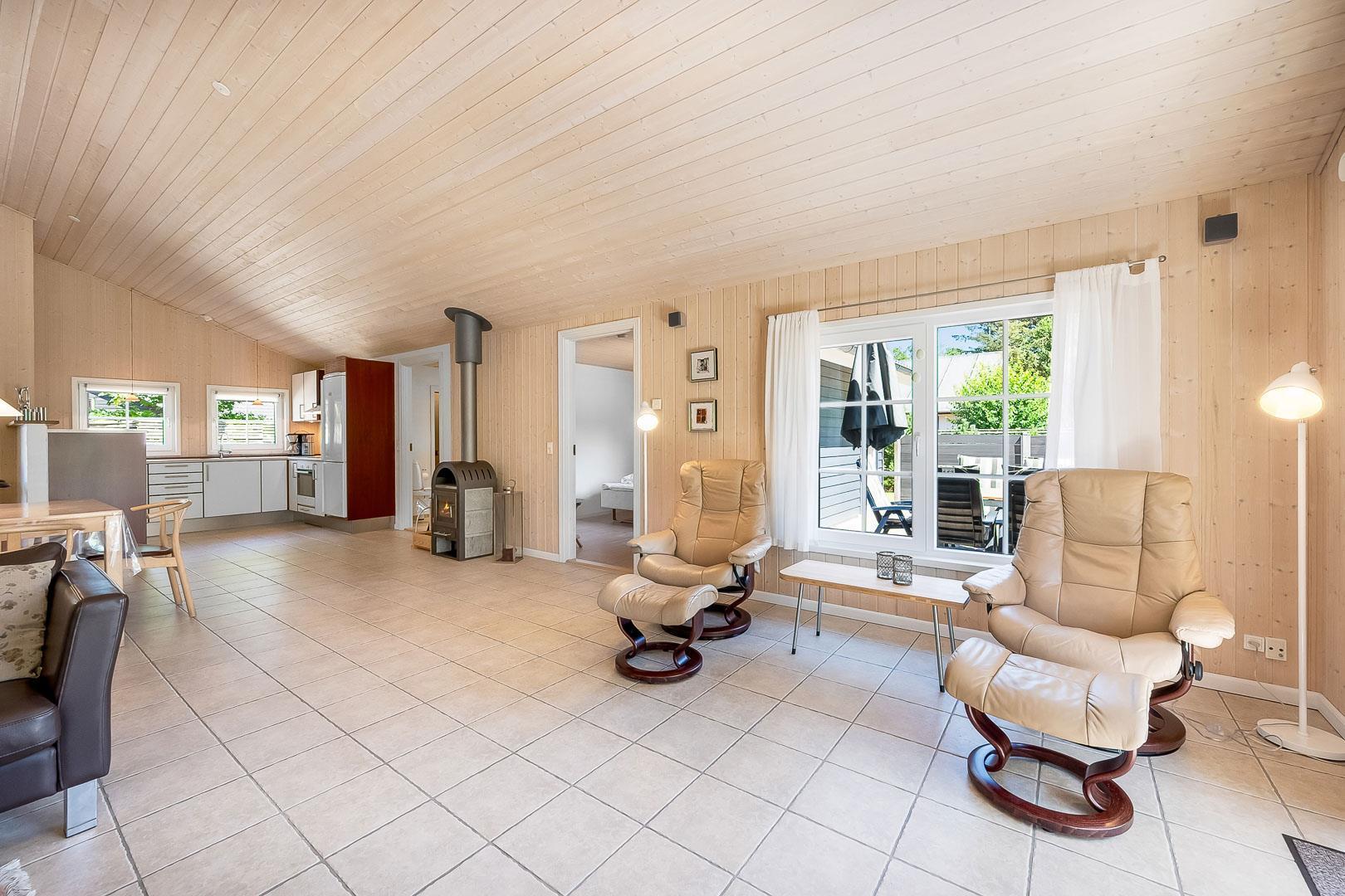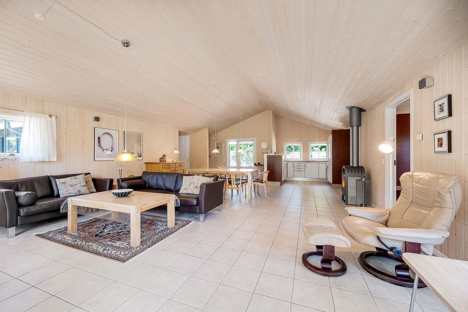 Med husets 4 soverum og 2 badeværelser, hvor det ene er med sauna og standvandsspa, egner huset sig til 8 personer. Køkkenet ligger i forbindelse med spisestue og stue, et dejligt lyst rum med loft til kip. Fra stue er der udgang til terrasse.