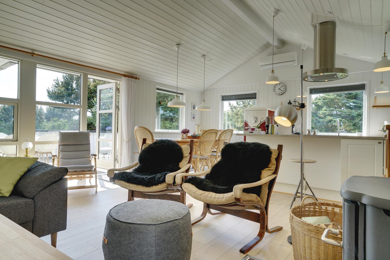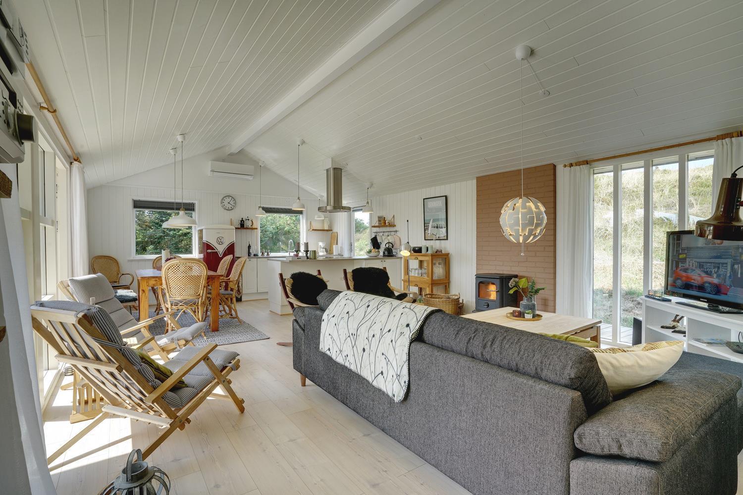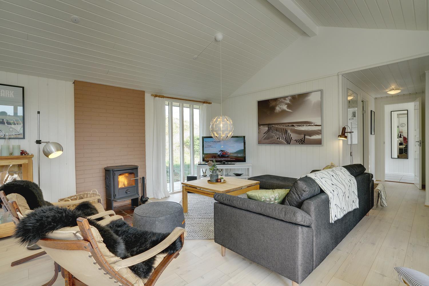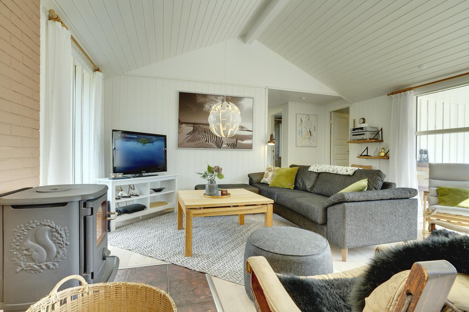 Sommerhuset byder på en gennemtænkt indretning med god plads til hele familien. Den lyse stue med brændeovn skaber en hyggelig atmosfære, mens den energivenlige varmepumpe sikrer et behageligt indeklima året rundt.