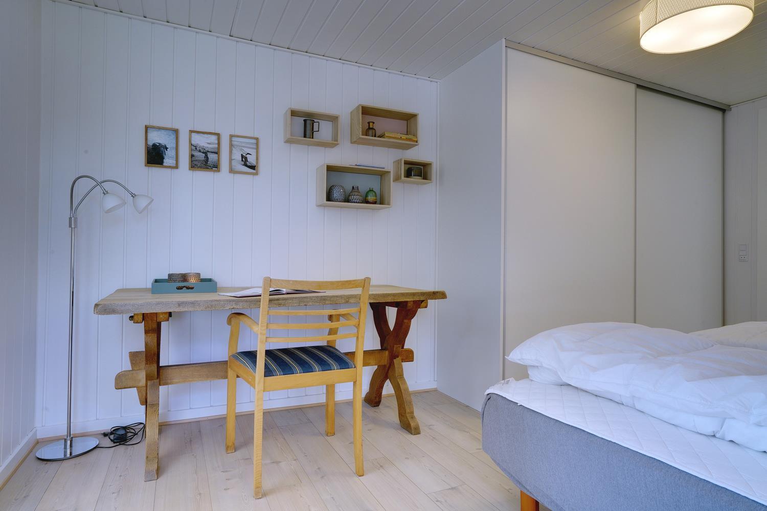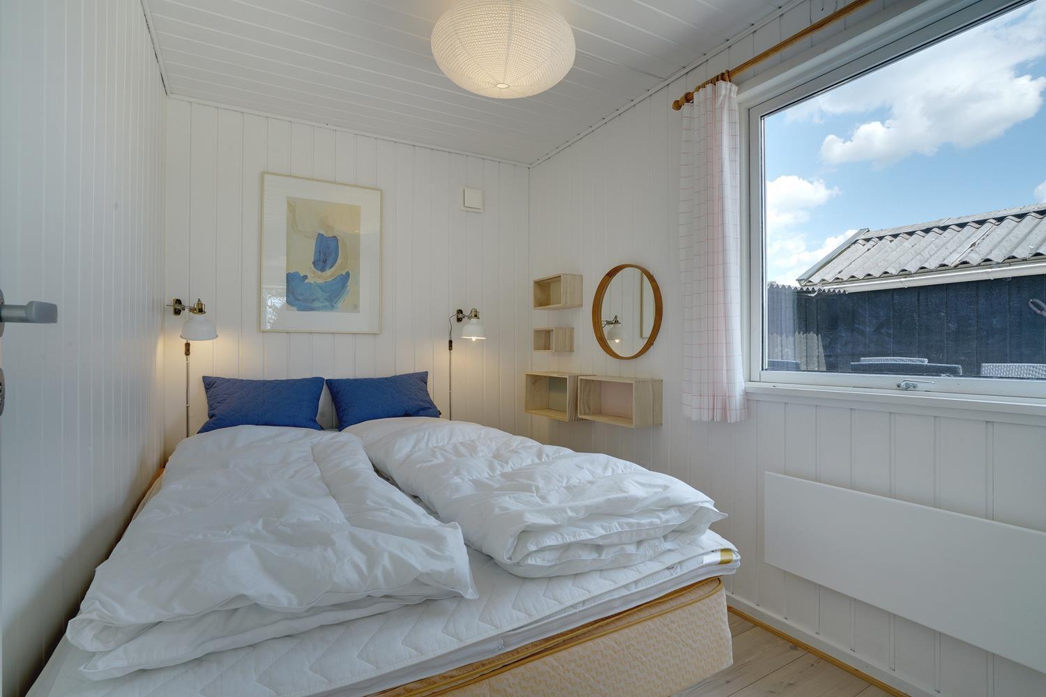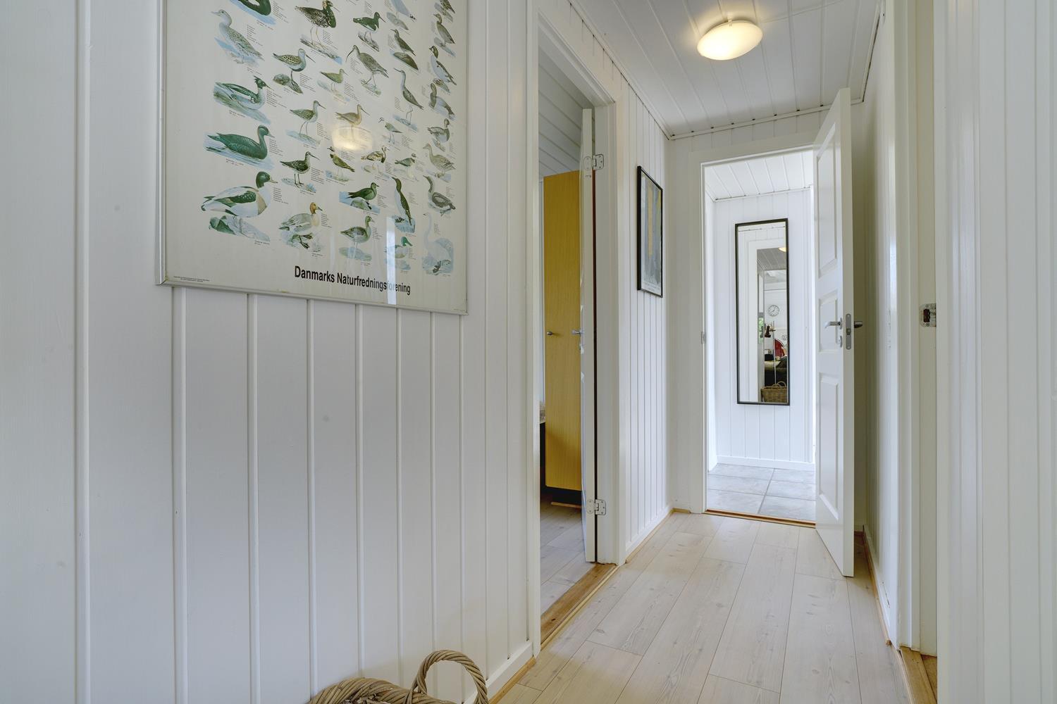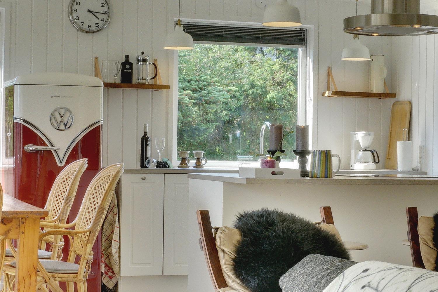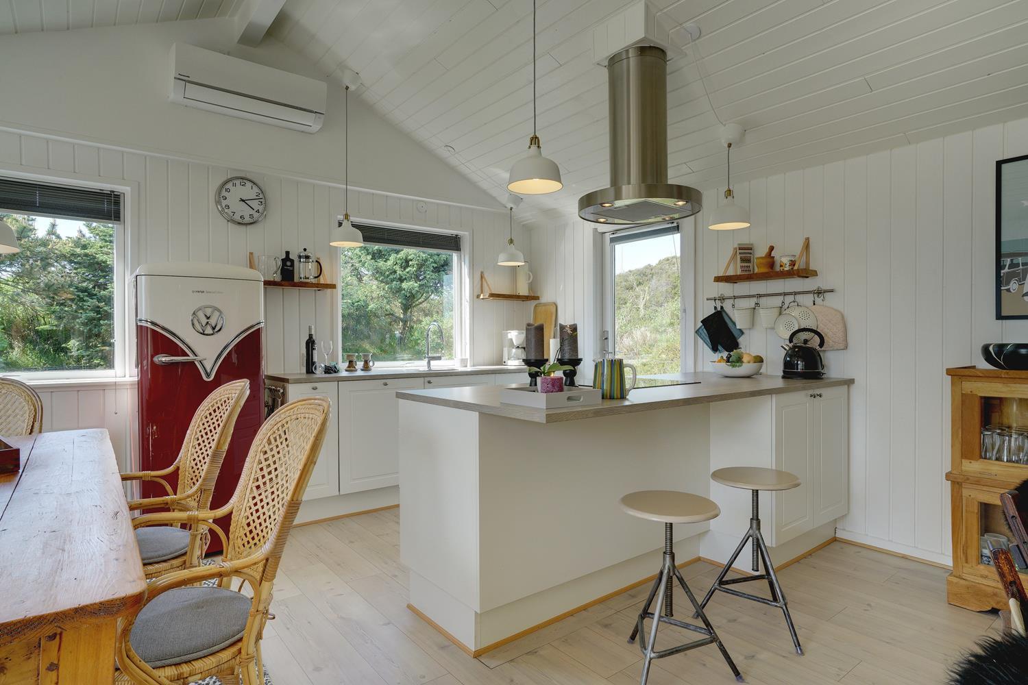 Sommerhuset byder på en gennemtænkt indretning med god plads til hele familien. Den lyse stue med brændeovn skaber en hyggelig atmosfære, mens den energivenlige varmepumpe sikrer et behageligt indeklima året rundt.