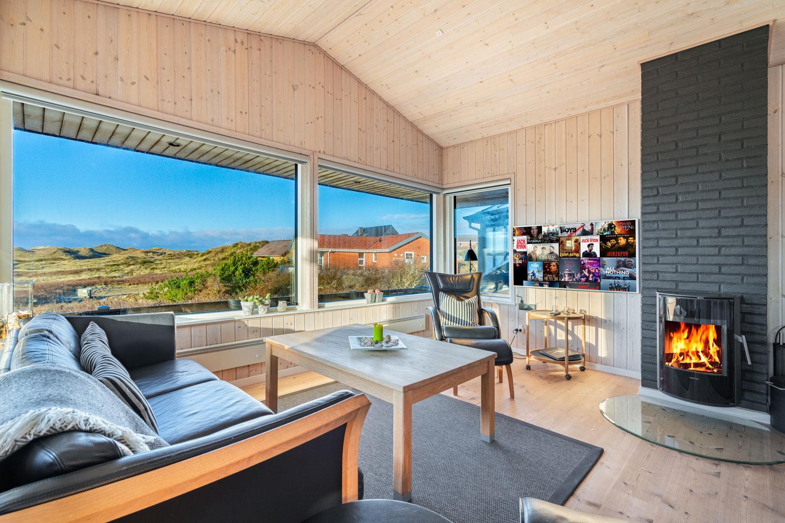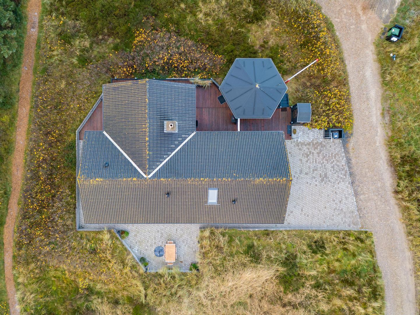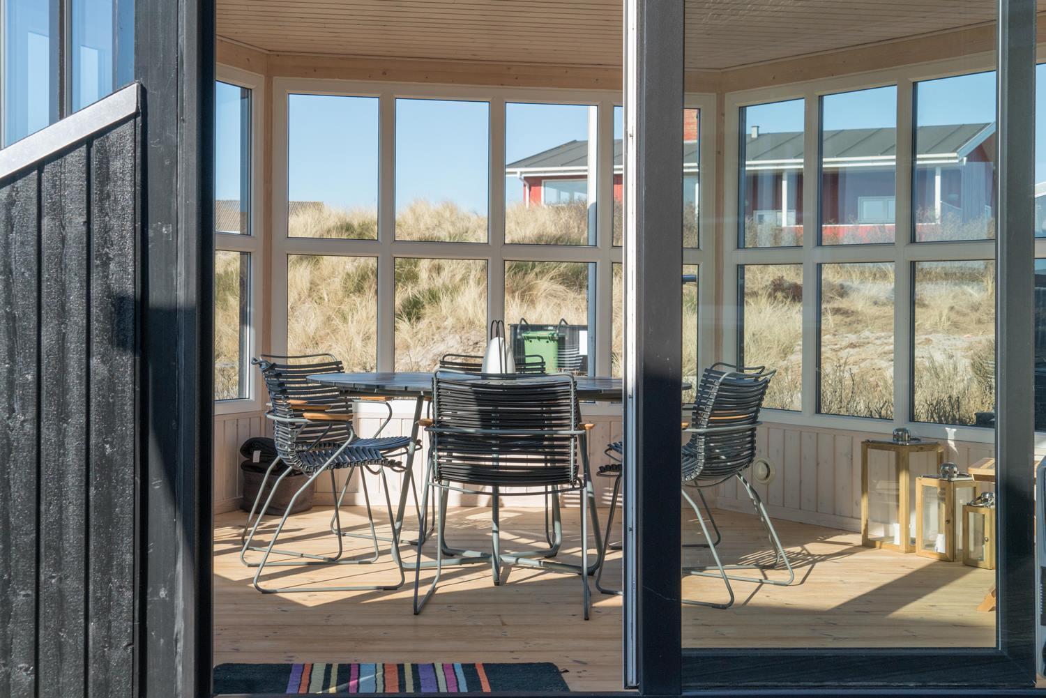 Feriehuset ligger helt fredeligt og velplaceret på en pragtfuld klitgrund, og det er opført med tanke på at optimere både lysindfald og udsigt. I kan derfor glæde jer til at nyde udsigten, mens I griller røde bøffer på terrassen, se frem til at følge med i vindens lette rusken i marehalmen, mens I drikker kaffe i pavillonen og ikke mindst håbe på regnvejr, så I kan lytte til dråberne, der trommer på ruderne i stuens kæmpestore vinduesparti.