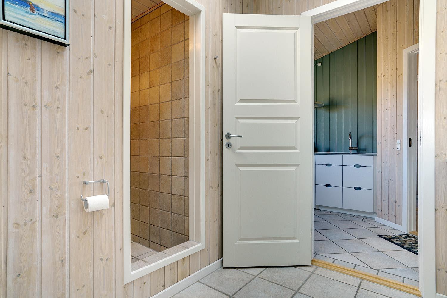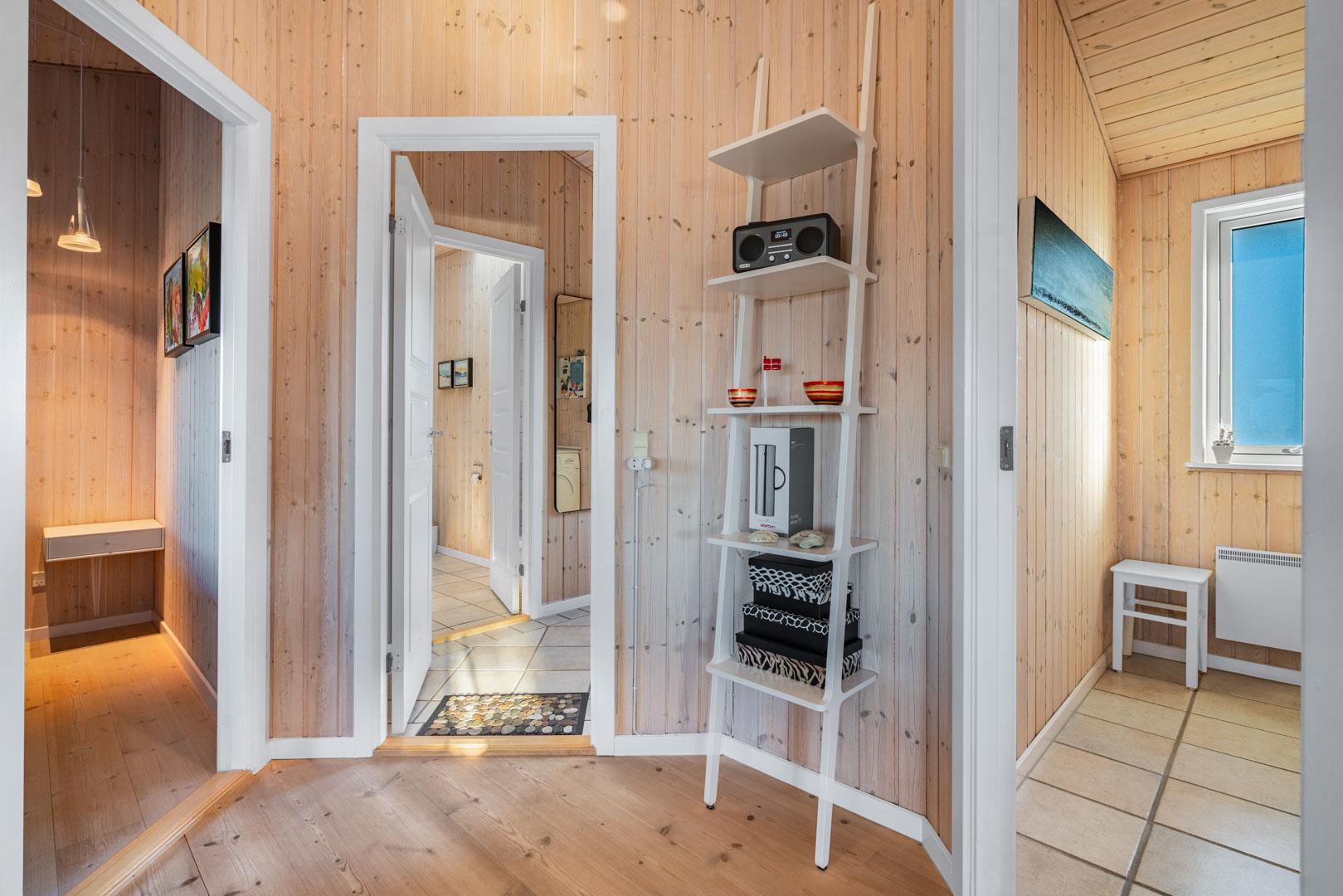 Huset er indrettet med seks faste sovepladser, som fordeler sig på tre soverum et med dobbeltseng (med elevation) og to med enkeltsenge. Stuen og køkkenet ligger i åben forbindelse og danner et åbent opholdsmiljø med brændeovn, og huset fuldendes af toilet og badeværelse samt entré med vaskefaciliteter.