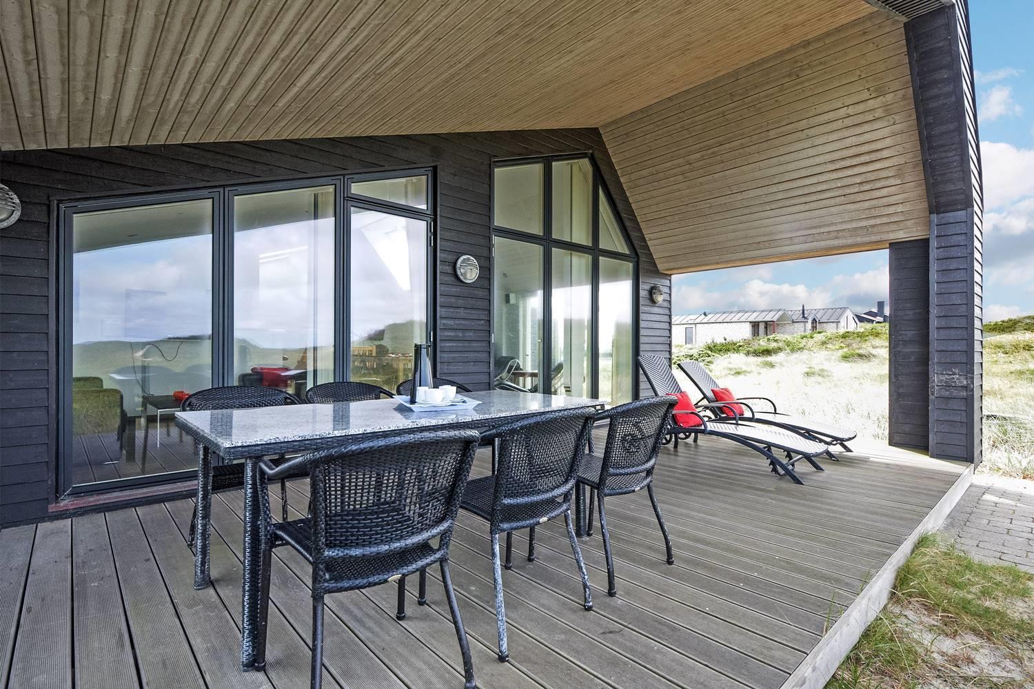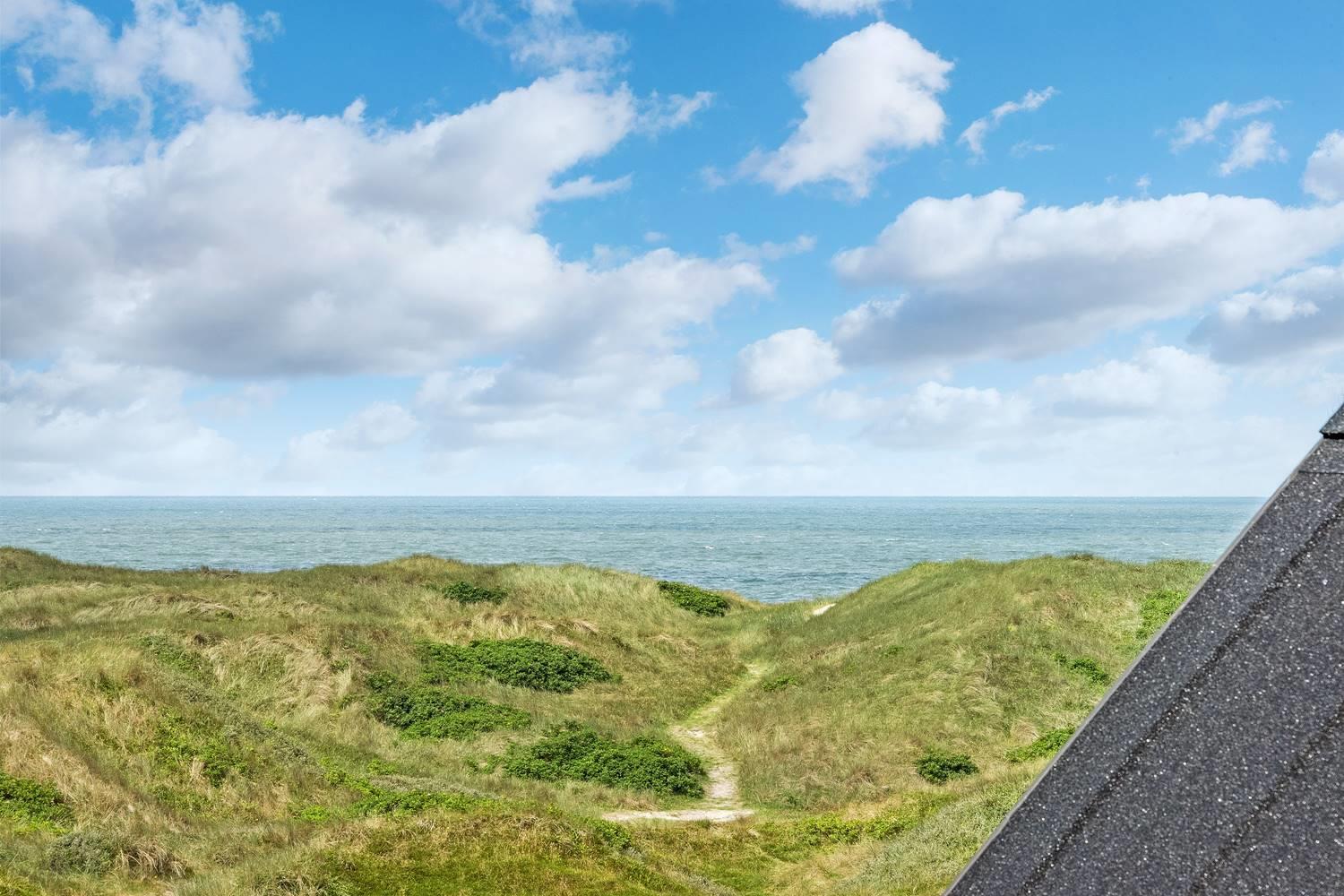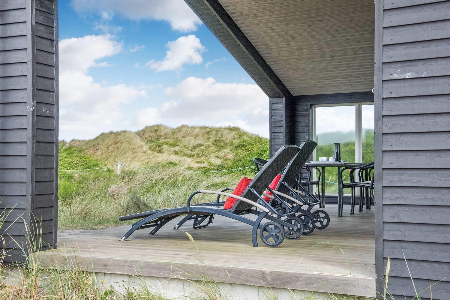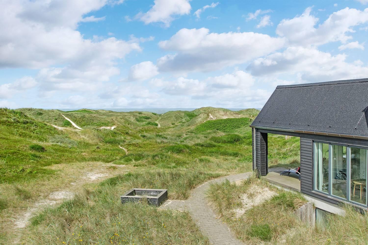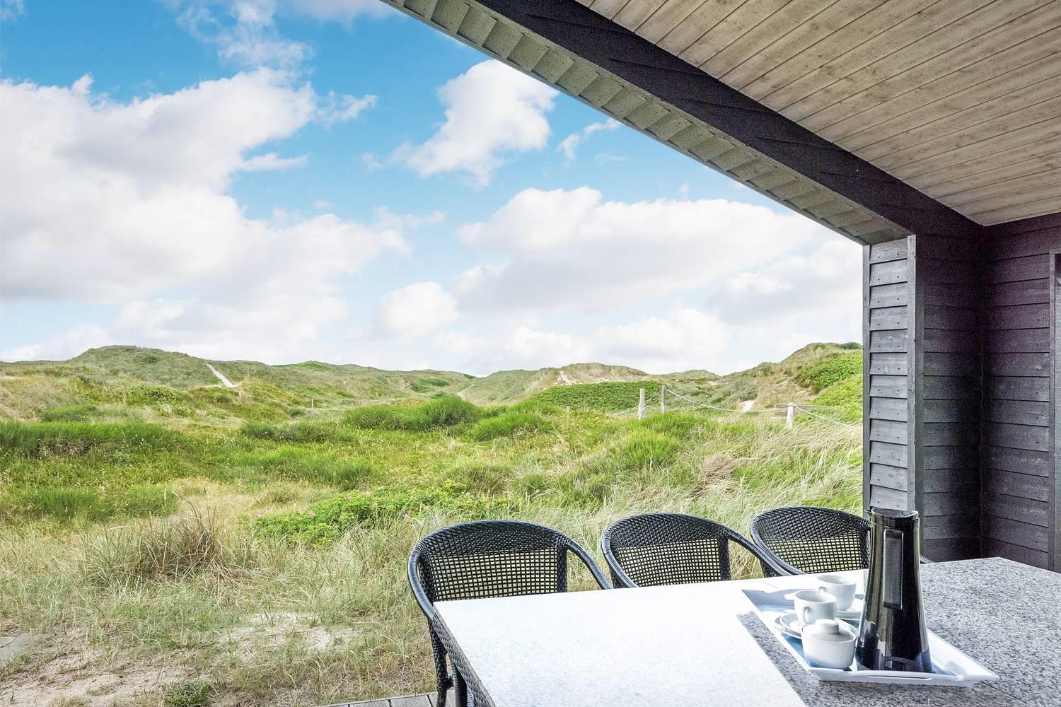 Fra stuen er der direkte adgang til en stor overdækket terrasse og den grønklædte naturgrund, der ofte besøges af hjorte ved daggry og skumring. Omgivelserne giver i det hele taget perfekte betingelser for at nyde naturen: Lige bag klitterne åbner den kridhvide sandstrand sig, og de blå bølger lover feriestemning på højde med Sydeuropa, og der er kort køreafstand til Blåbjerg Plantage, Kærgård Plantage og Filsø med mere.
