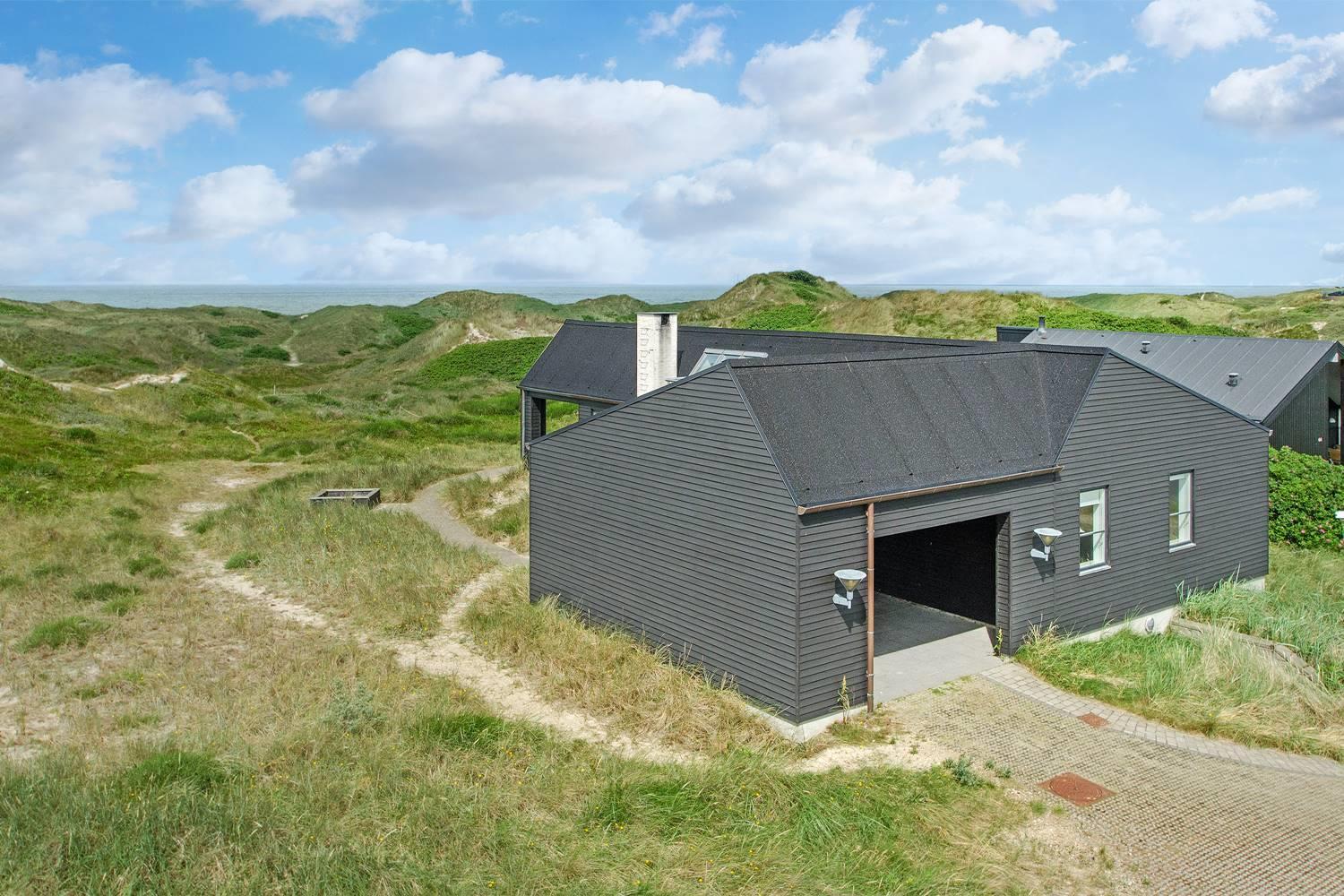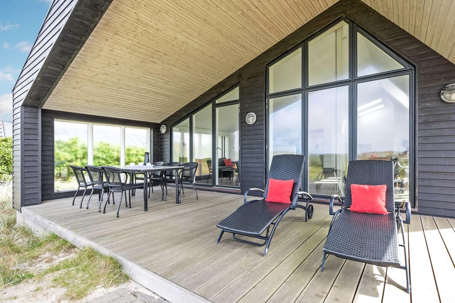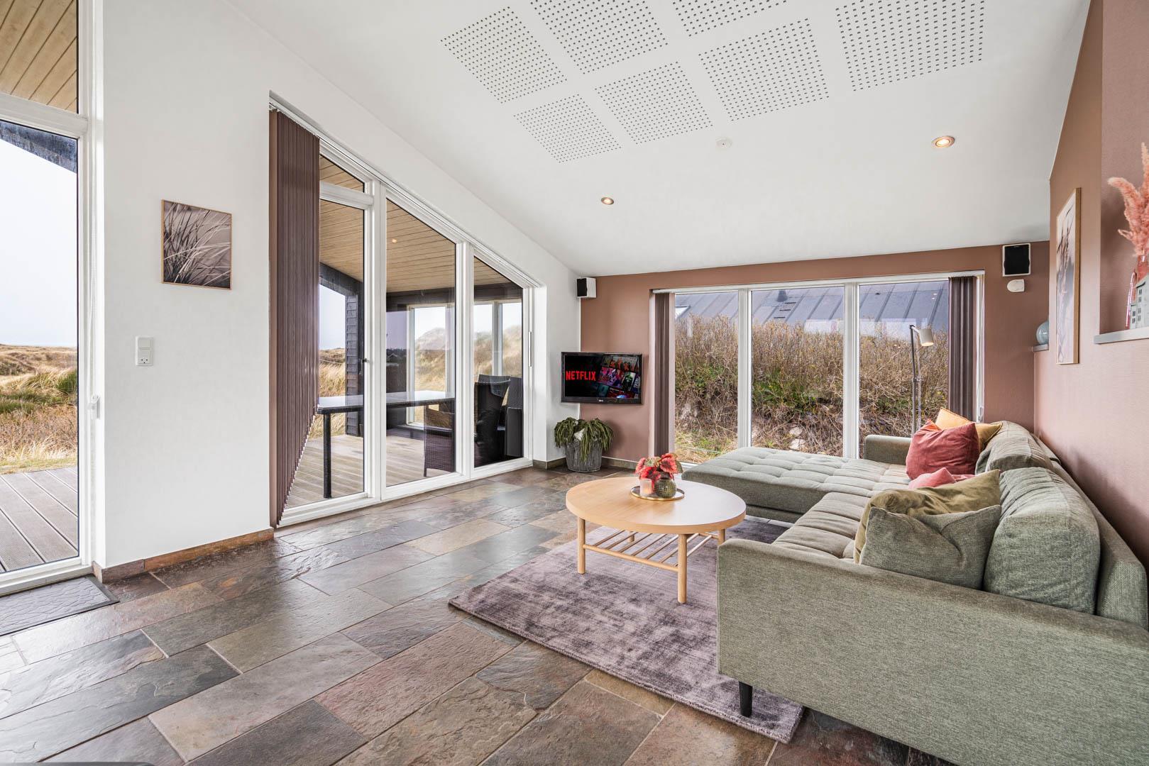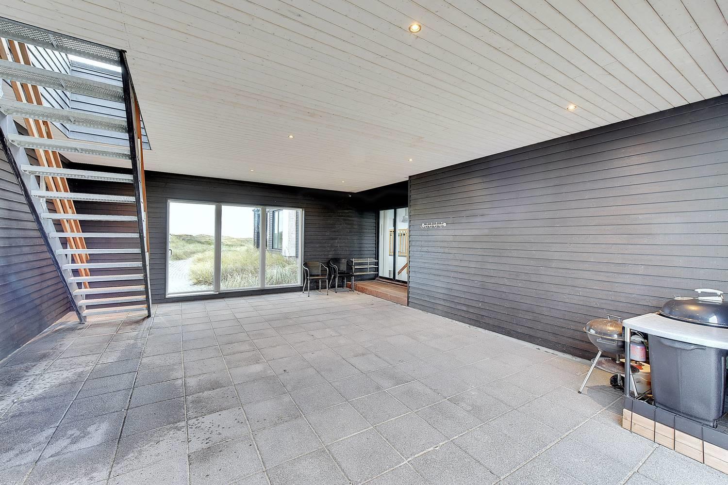 Fra stuen er der direkte adgang til en stor overdækket terrasse og den grønklædte naturgrund, der ofte besøges af hjorte ved daggry og skumring. Omgivelserne giver i det hele taget perfekte betingelser for at nyde naturen: Lige bag klitterne åbner den kridhvide sandstrand sig, og de blå bølger lover feriestemning på højde med Sydeuropa, og der er kort køreafstand til Blåbjerg Plantage, Kærgård Plantage og Filsø med mere.