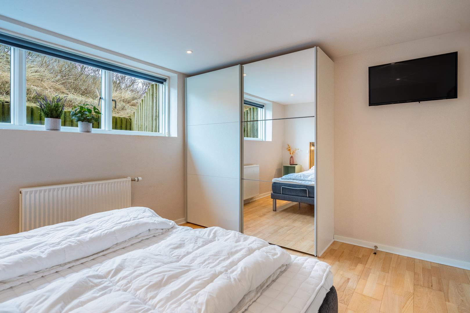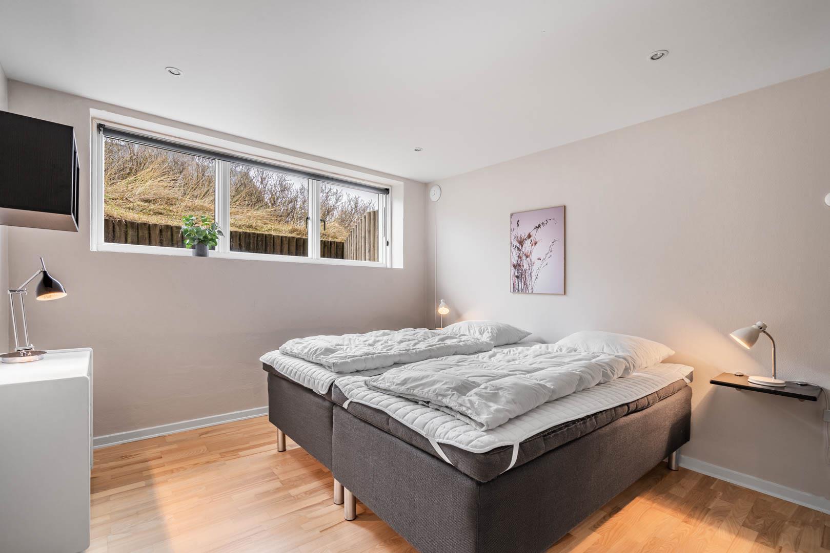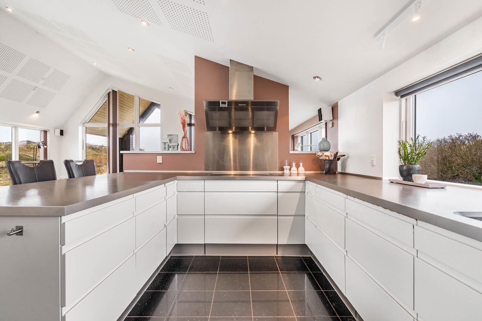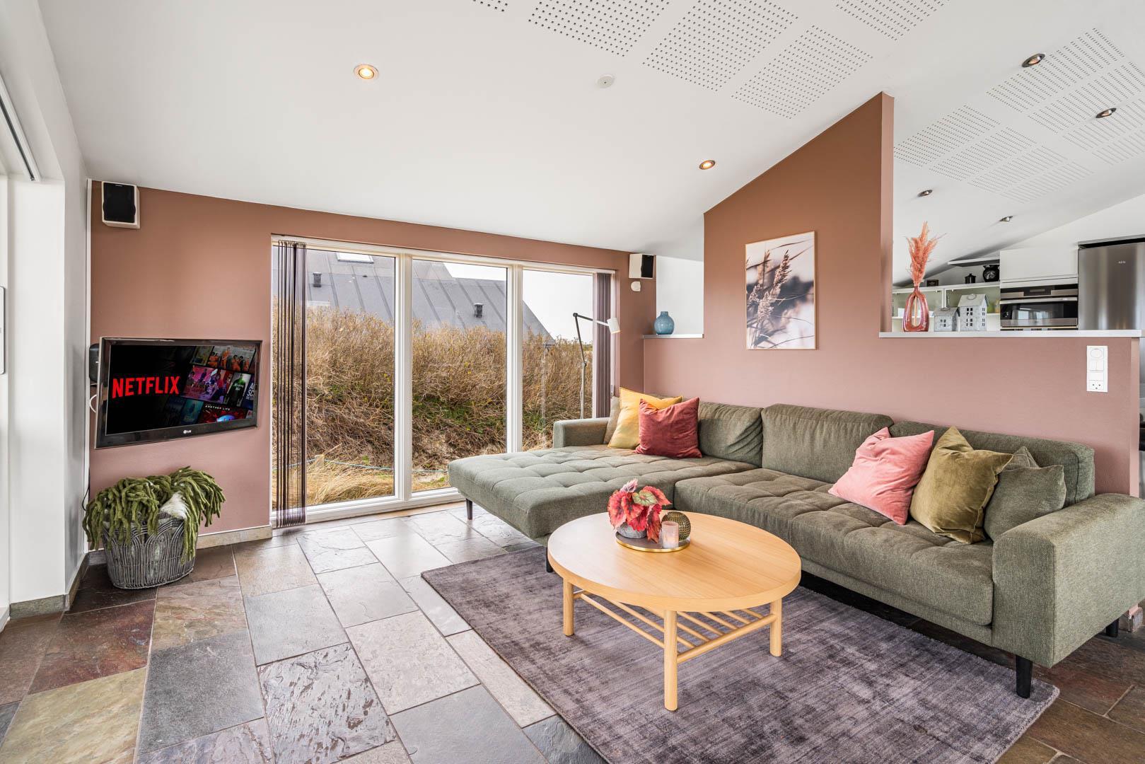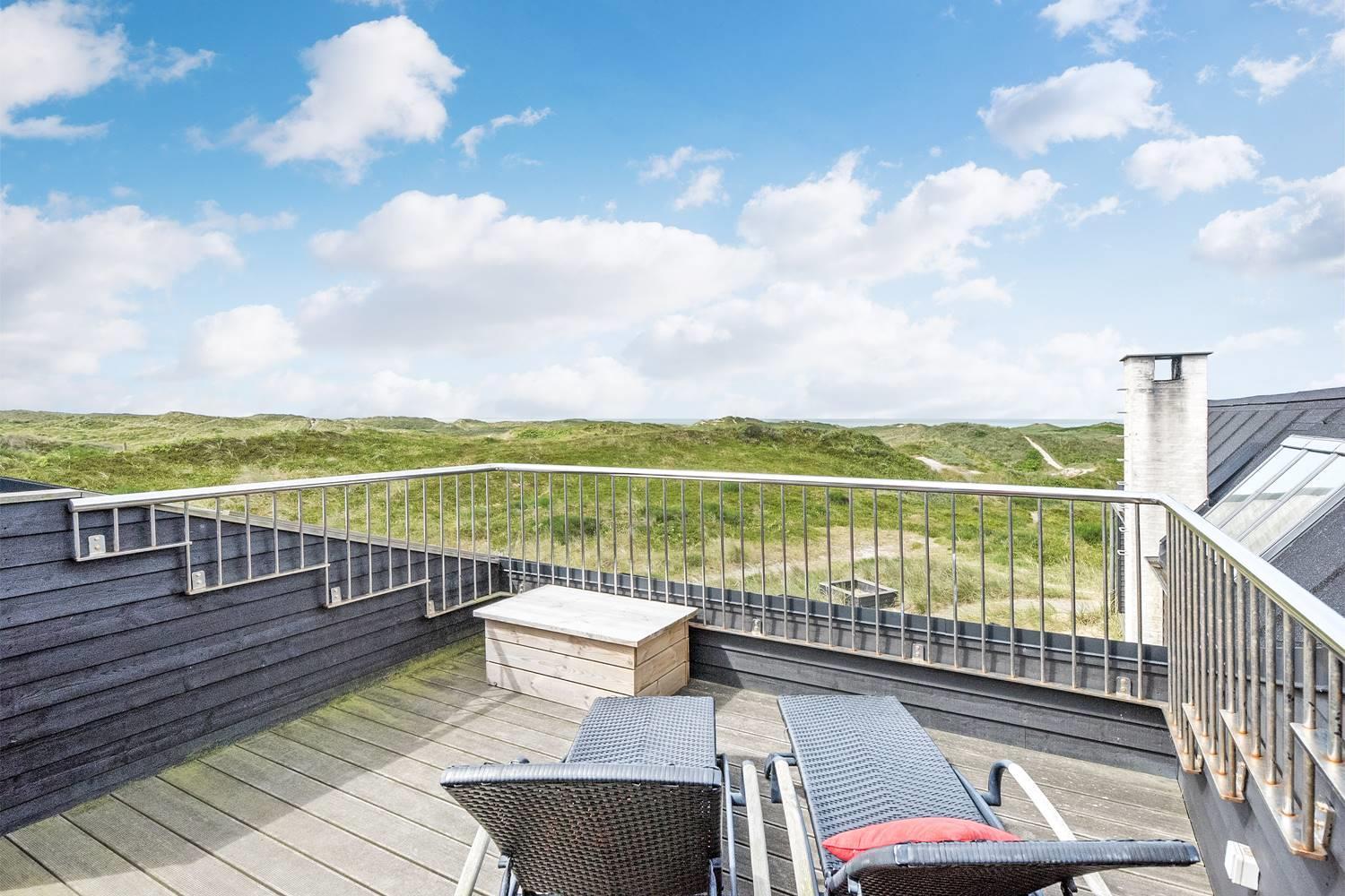 Fra stuen er der direkte adgang til en stor overdækket terrasse og den grønklædte naturgrund, der ofte besøges af hjorte ved daggry og skumring. Omgivelserne giver i det hele taget perfekte betingelser for at nyde naturen: Lige bag klitterne åbner den kridhvide sandstrand sig, og de blå bølger lover feriestemning på højde med Sydeuropa, og der er kort køreafstand til Blåbjerg Plantage, Kærgård Plantage og Filsø med mere.