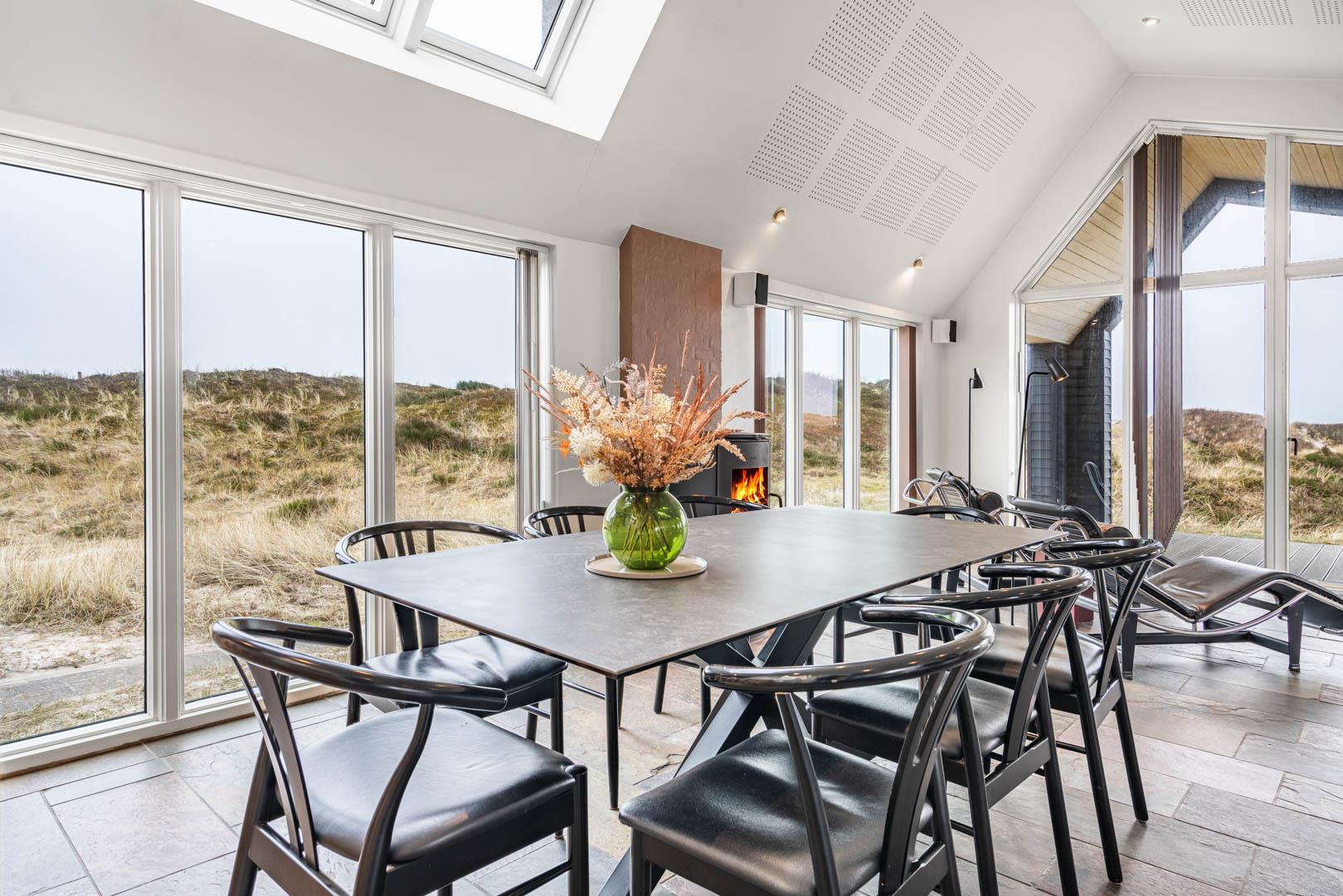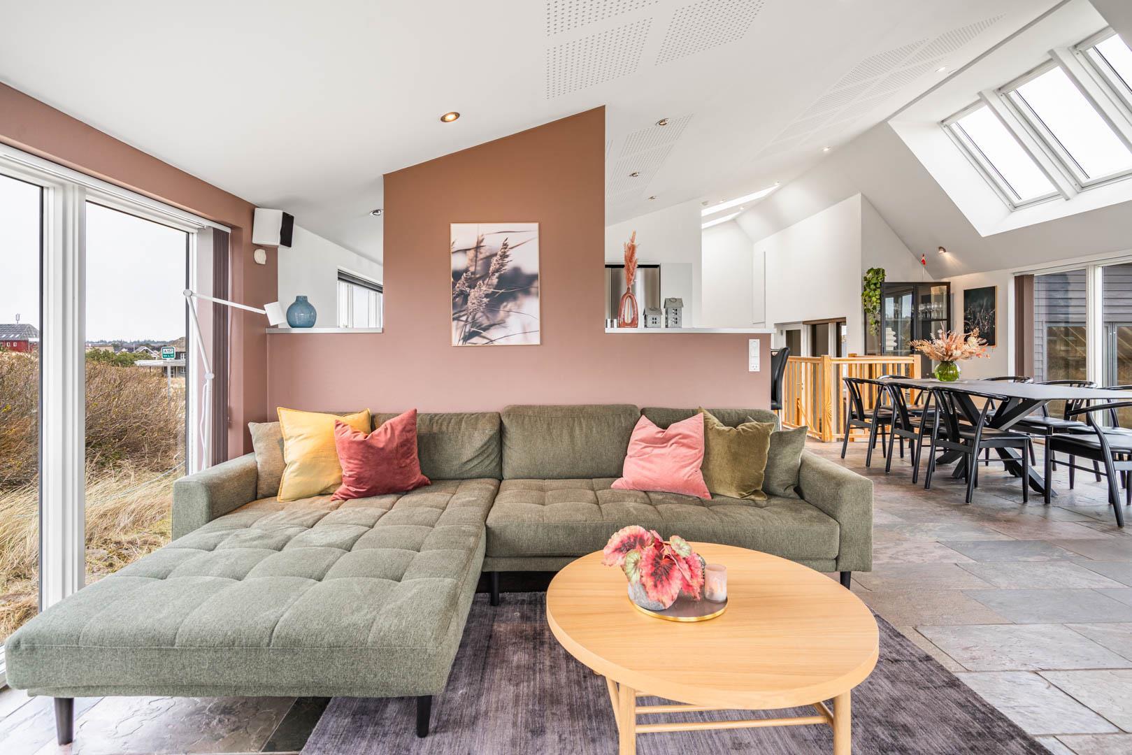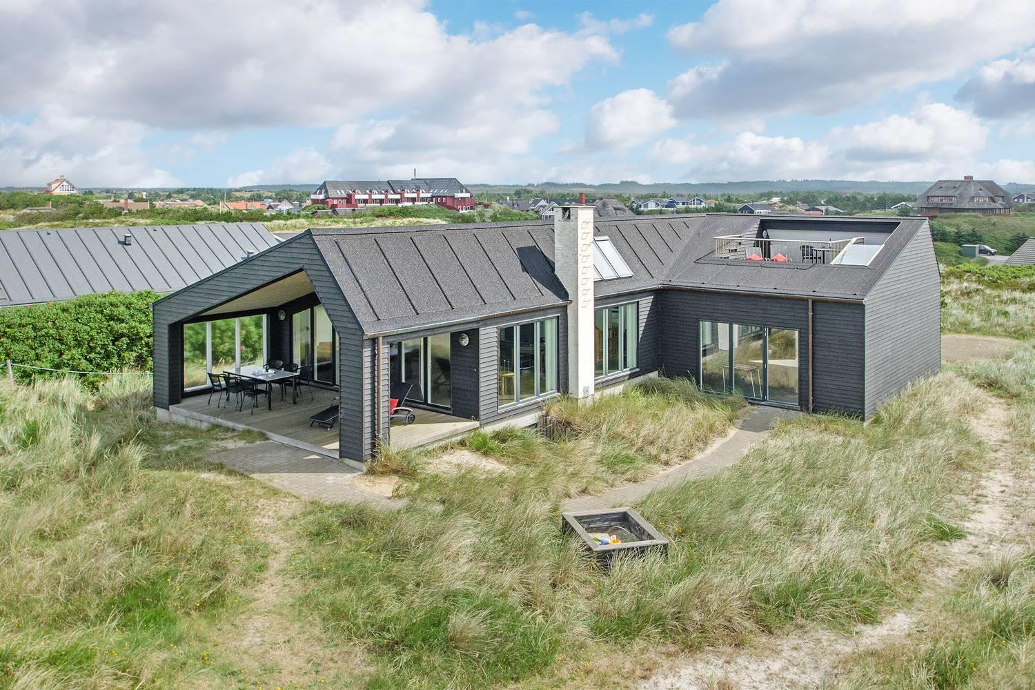 Holder I af den smukke natur langs den vestjyske kyst, og værdsætter I kvalitet, velvære og samvær? Så passer dette feriehus perfekt til jer. Her kommer I nemlig til at holde ferie i et stort, arkitekttegnet kvalitetshus med aktivitetsrum, wellness-afdeling og en enestående udsigt over de bløde klitter med det brusende Vesterhav i baggrunden.