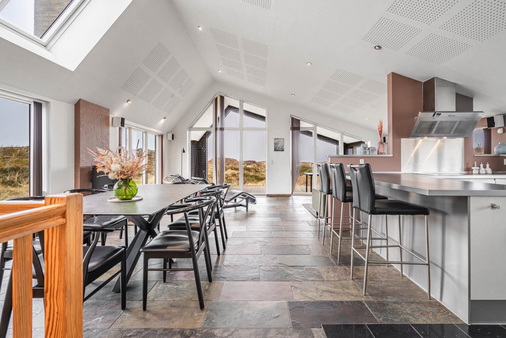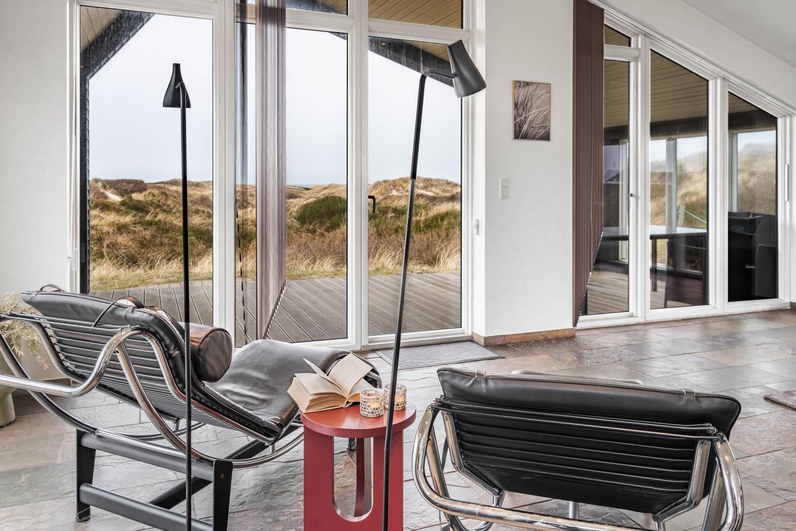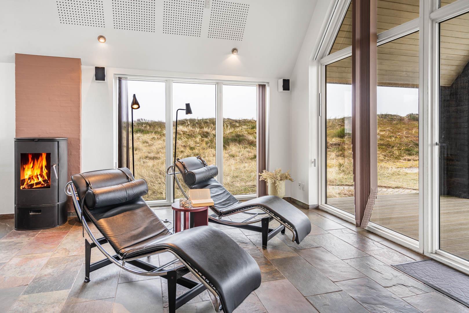 Feriehuset er indrettet personligt med sans for æstetik og kvalitet, så man føler sig omfavnet, så snart man træder ind i de højloftede rum. Let forskudte plan giver en helt unik dybde, og en særlig fornemmelse af lys og luft skabes af husets mange store vinduespartier, der trækker naturens farver helt ind i rummene.