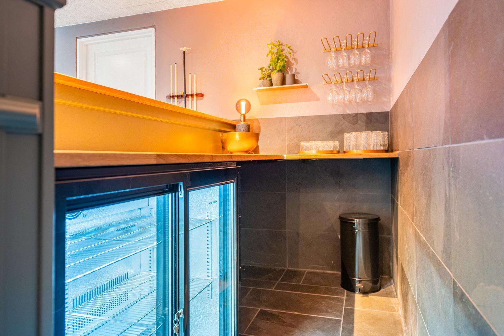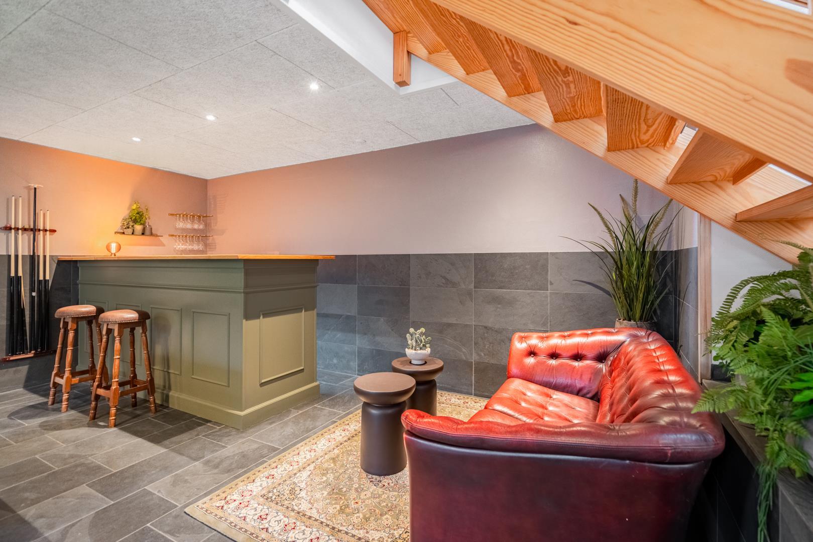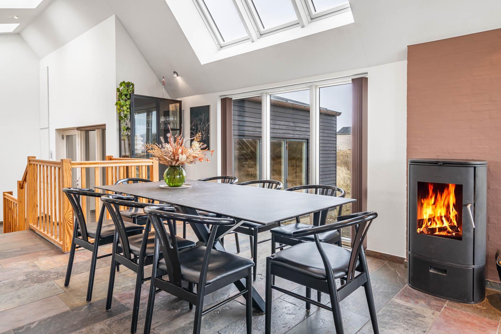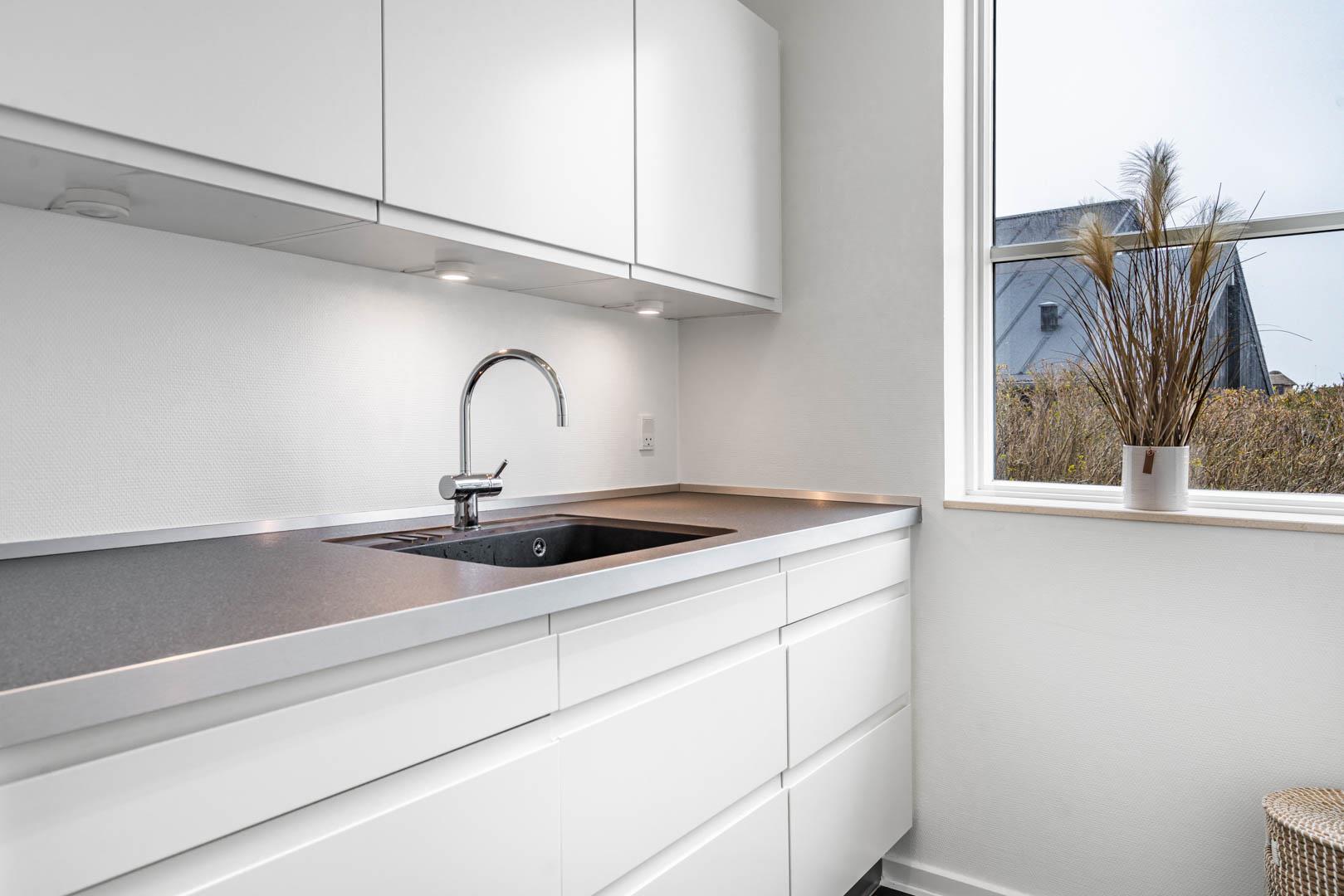 Husets hjerte består af en hyggelig stue med bløde sofaer og et stort fladskærms-tv samt et elegant, hvidt køkken med et sort, funklende klinkegulv. I rummet er der også et dejligt spisebord med plads til seks, og der er naturligvis også brændeovn til at skrue helt op for hyggen.