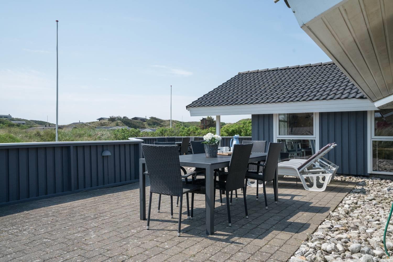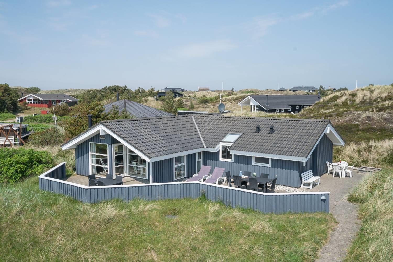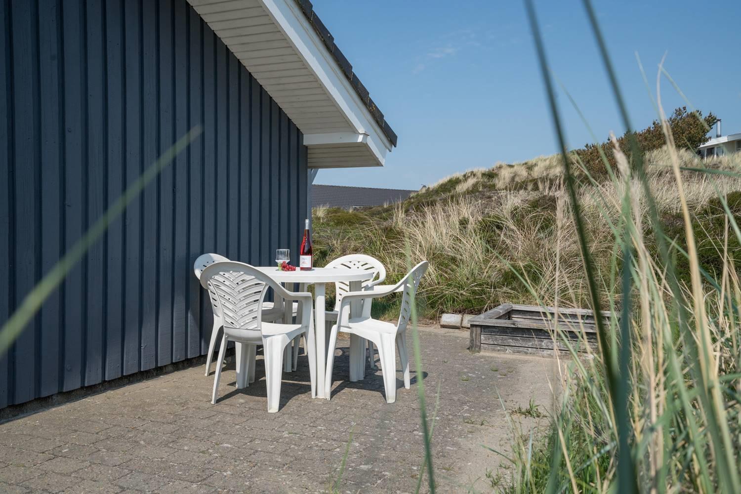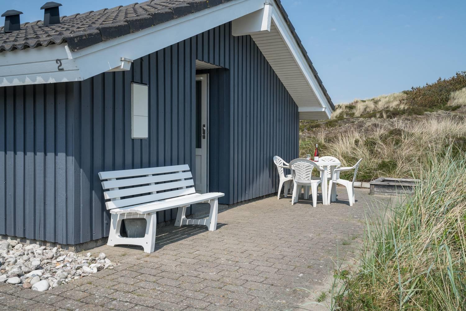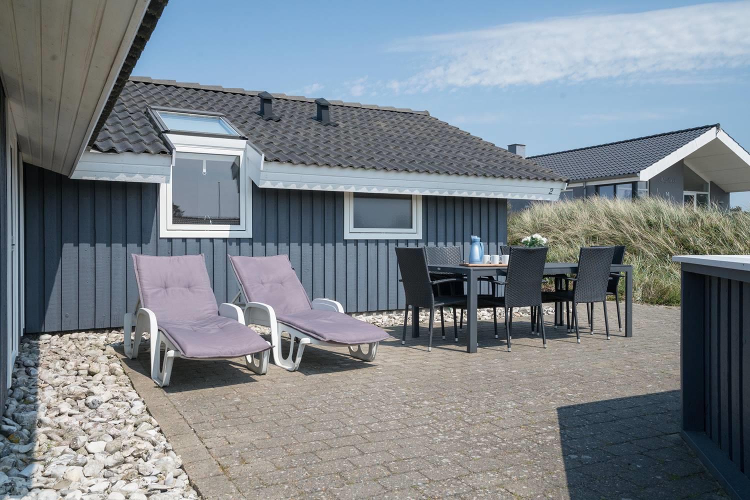 Hyggeligt feriehus i rolige omgivelser med spa, sauna og stor indhegnet terrasse tæt på havet.