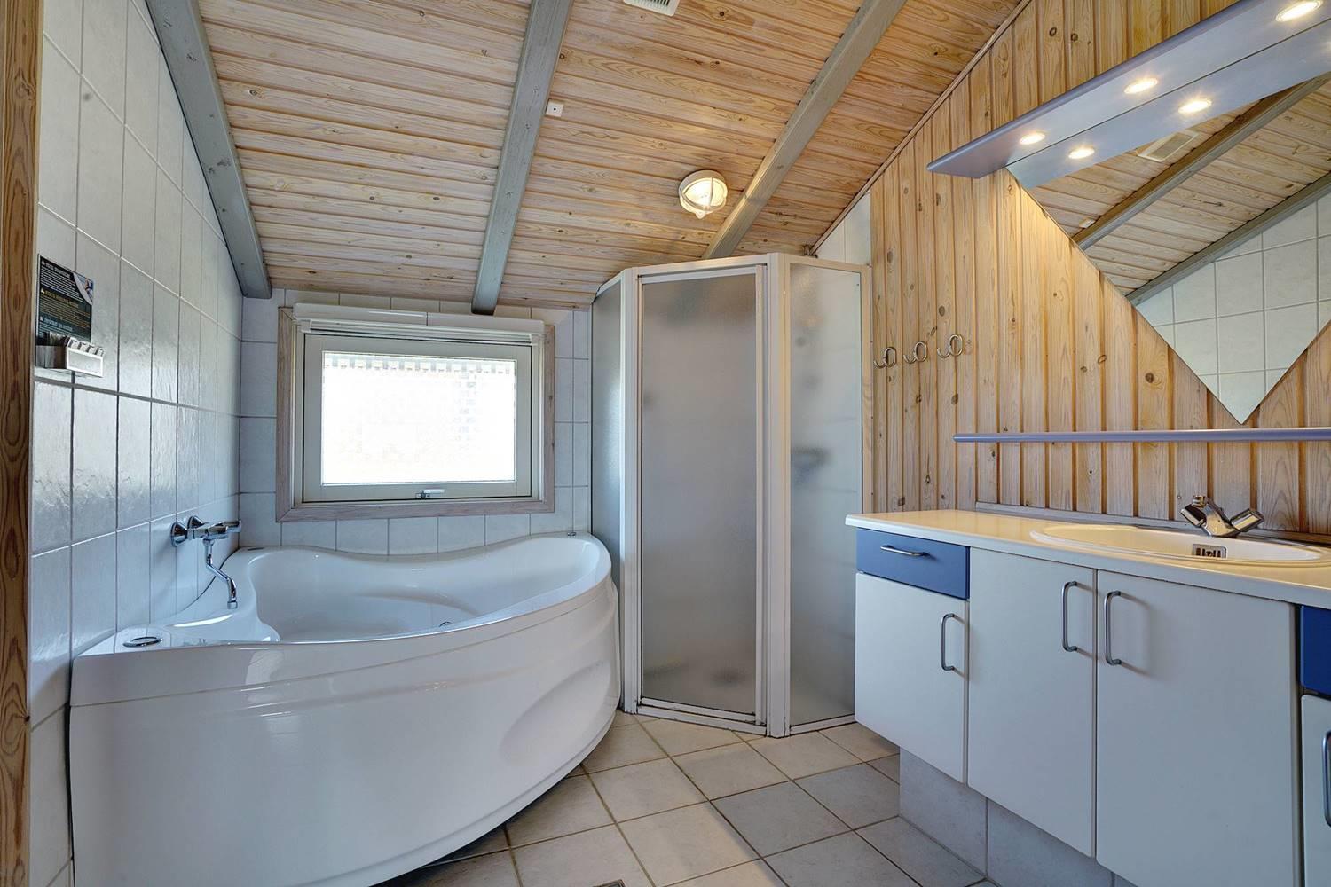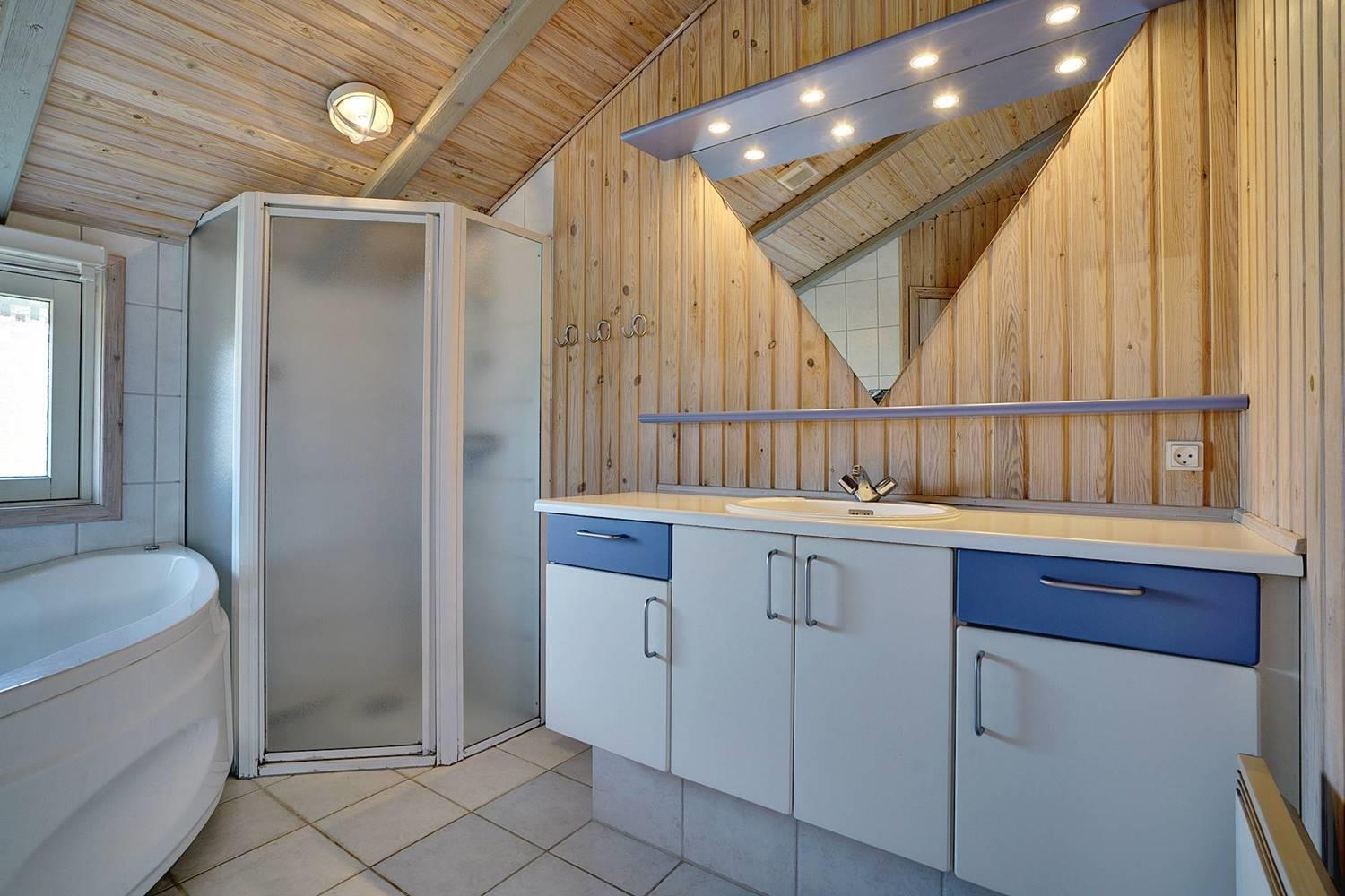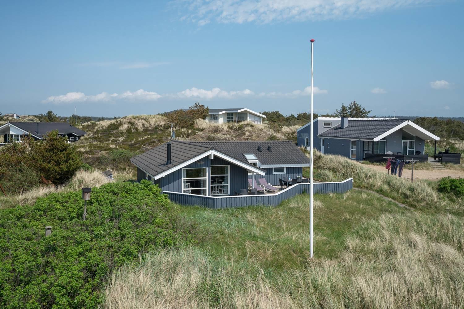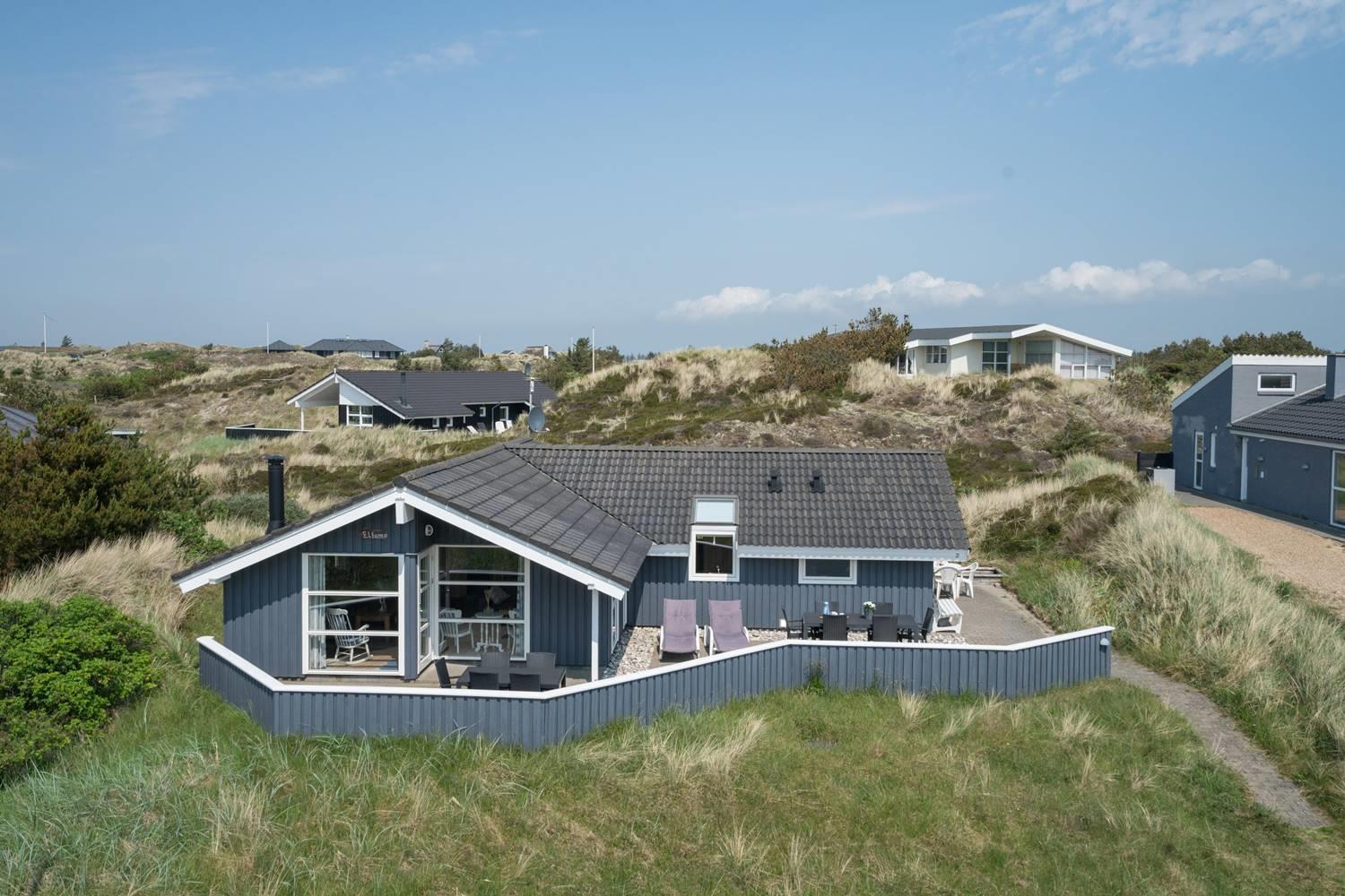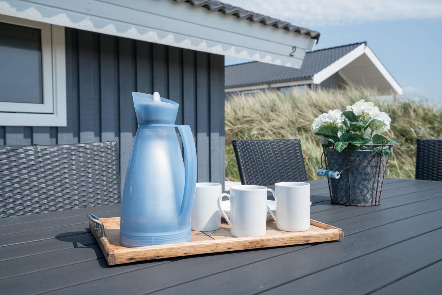 Hyggeligt feriehus i rolige omgivelser med spa, sauna og stor indhegnet terrasse tæt på havet.