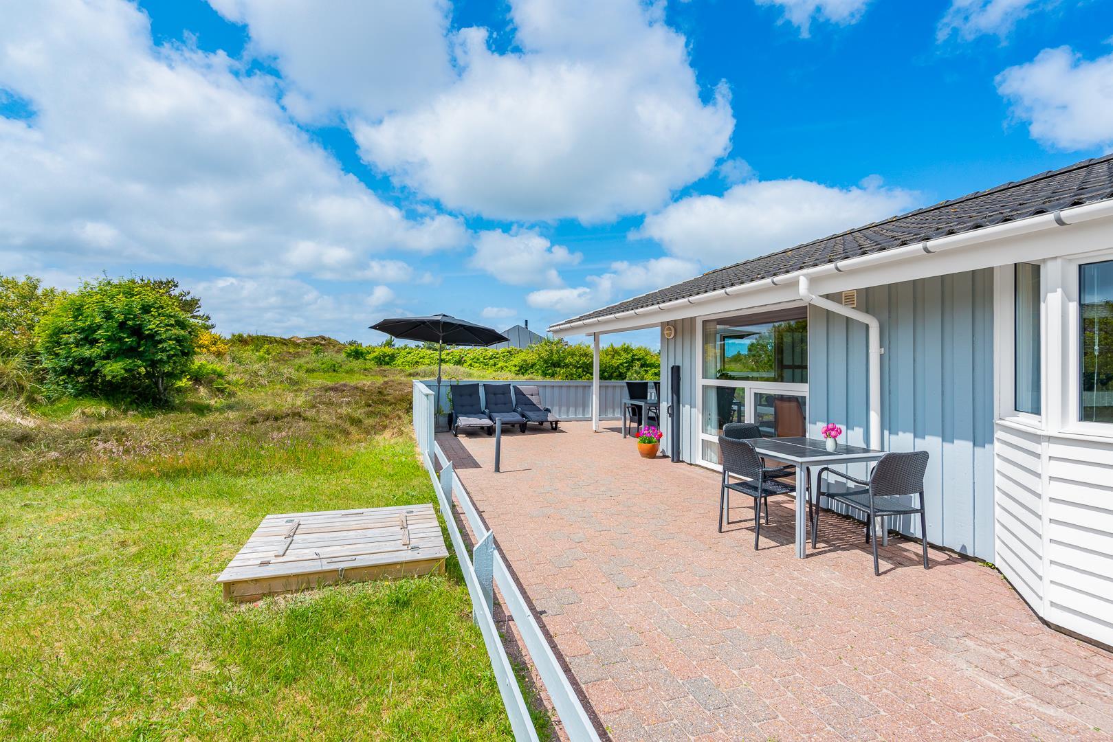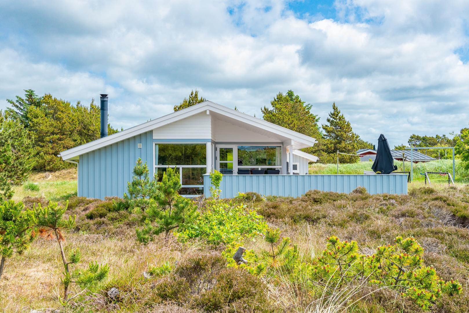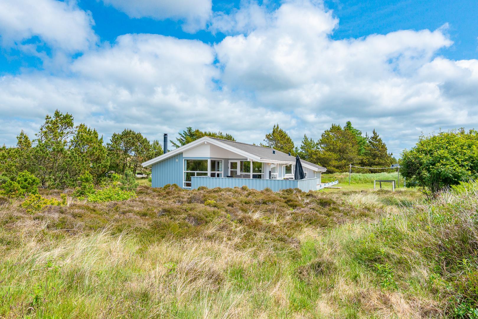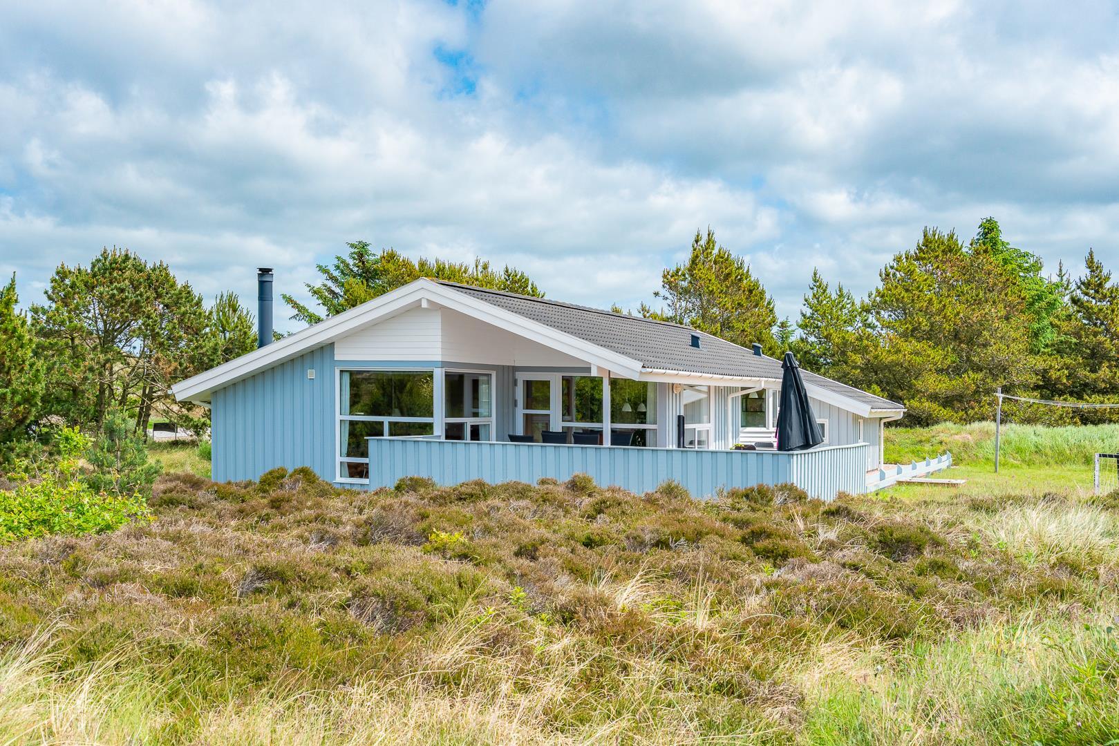 Feriehuset er indrettet med terrasser langs de syd- og vestlige facader, så du til fulde kan nyde solen og udsigten til den lave klitbeplantning, der læner sig blidt i sommerbrisen. Ikke mere end et par kilometer herfra afløses det åbne terræn af dyb, fascinerende skov med smukke vandre- og ridestier samt mountainbikeruter i forskellige sværhedsgrader. Stranden ligger blot omkring 800 meter fra feriehuset, så når du har nydt skovens mange farver, kan du slappe af på stranden hele eftermiddagen.