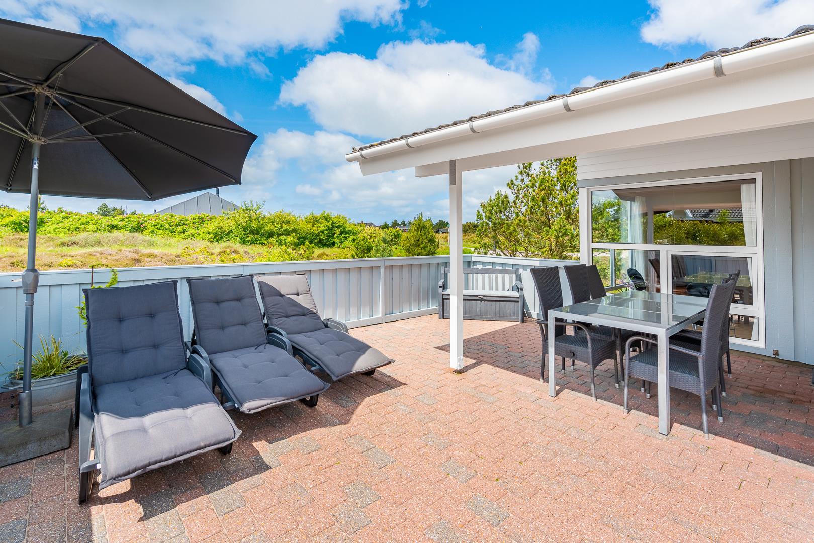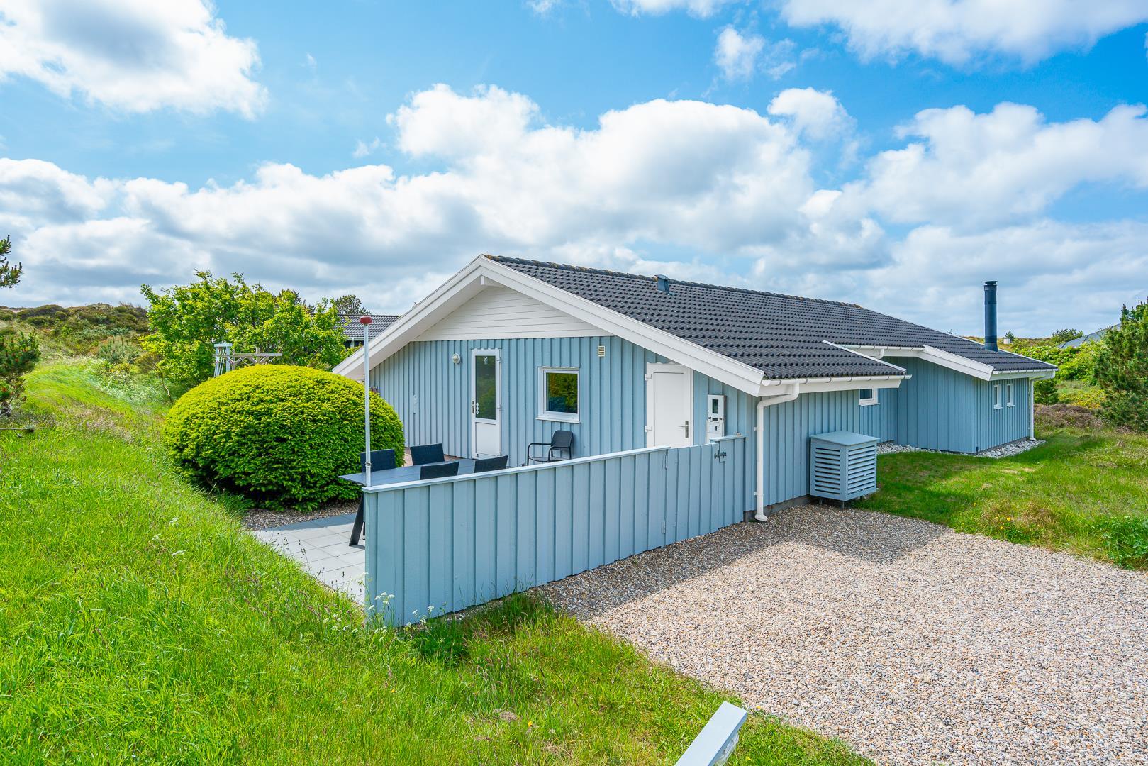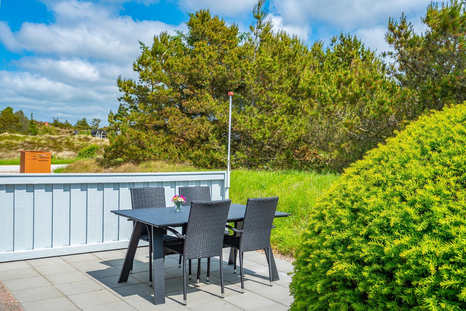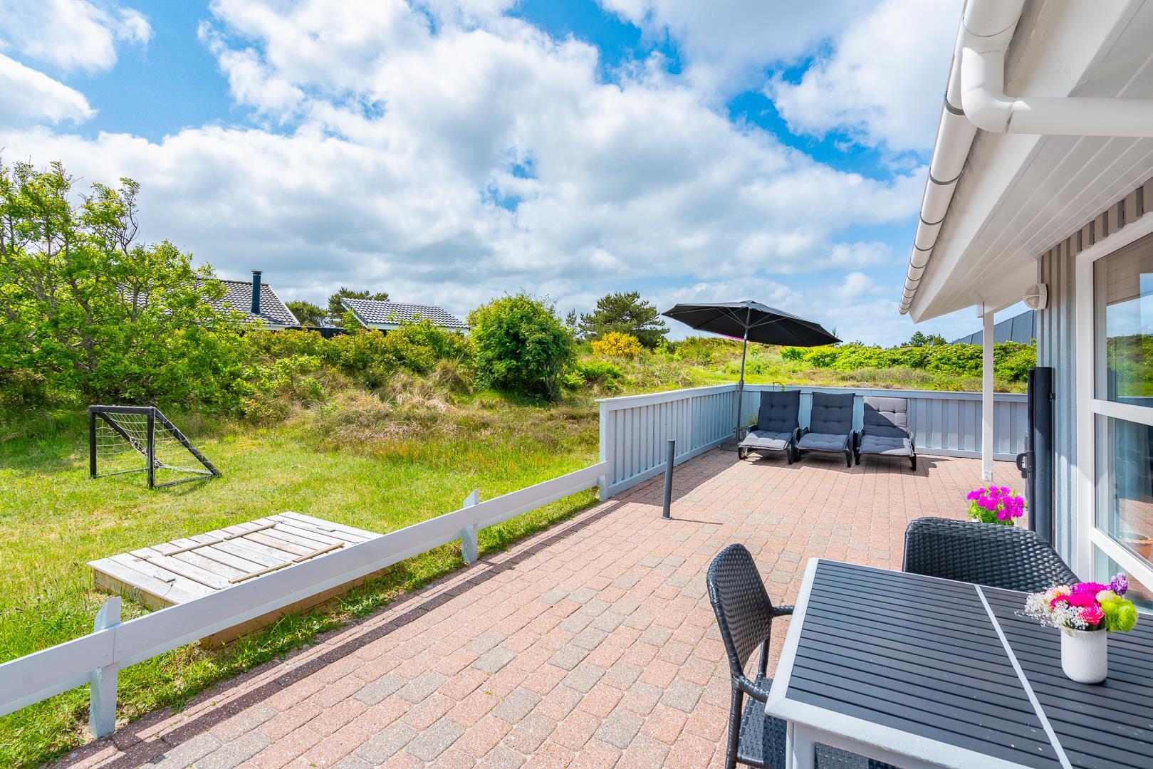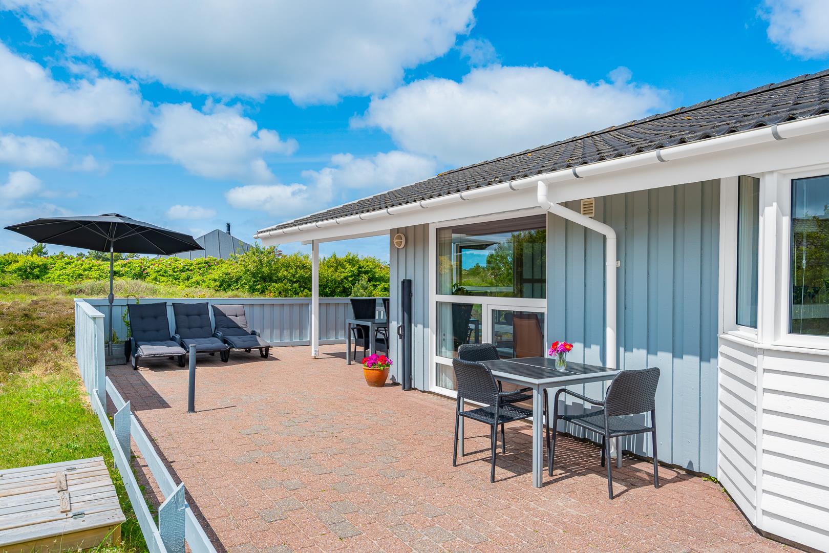 Feriehuset er indrettet med terrasser langs de syd- og vestlige facader, så du til fulde kan nyde solen og udsigten til den lave klitbeplantning, der læner sig blidt i sommerbrisen. Ikke mere end et par kilometer herfra afløses det åbne terræn af dyb, fascinerende skov med smukke vandre- og ridestier samt mountainbikeruter i forskellige sværhedsgrader. Stranden ligger blot omkring 800 meter fra feriehuset, så når du har nydt skovens mange farver, kan du slappe af på stranden hele eftermiddagen.