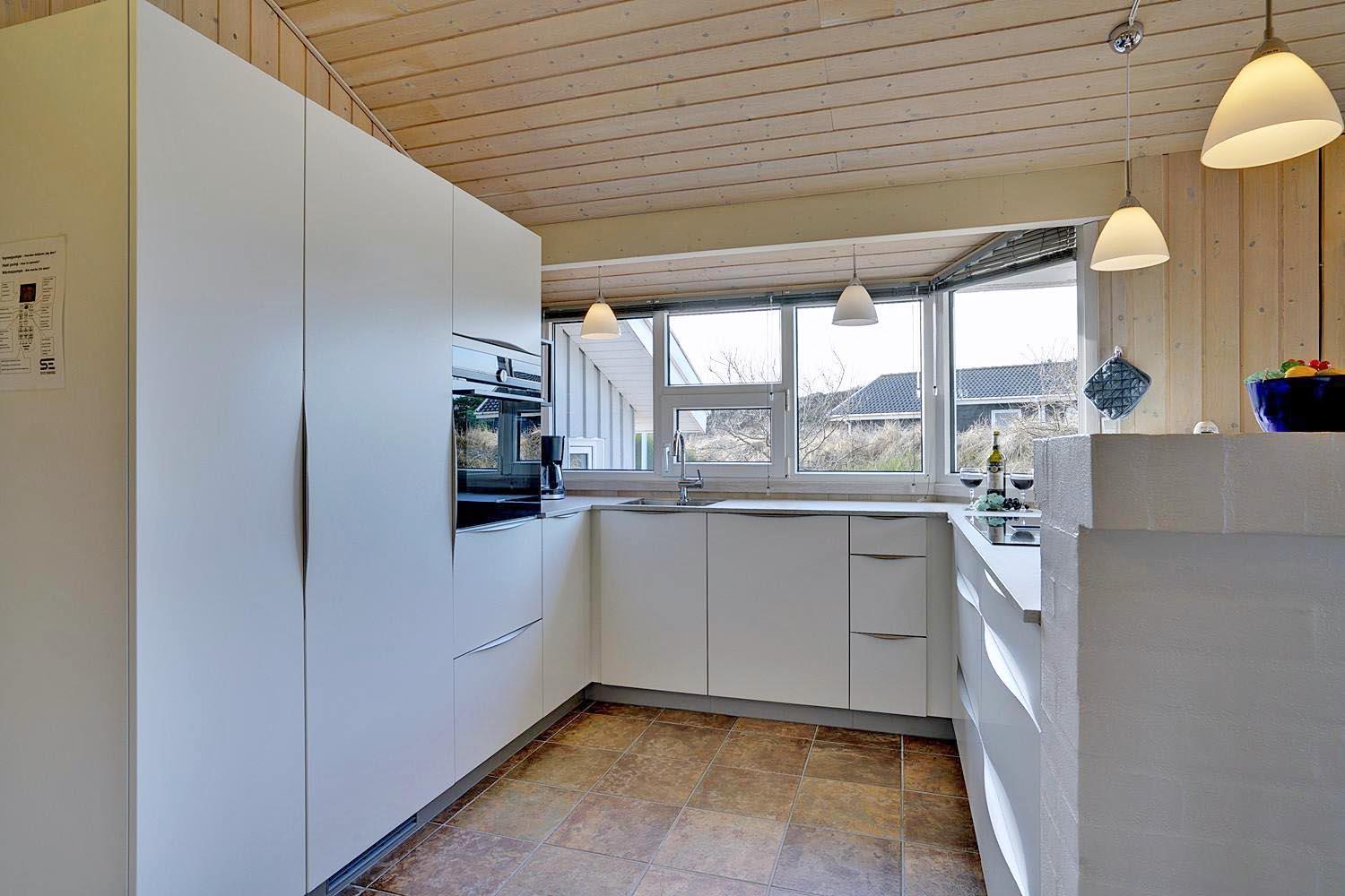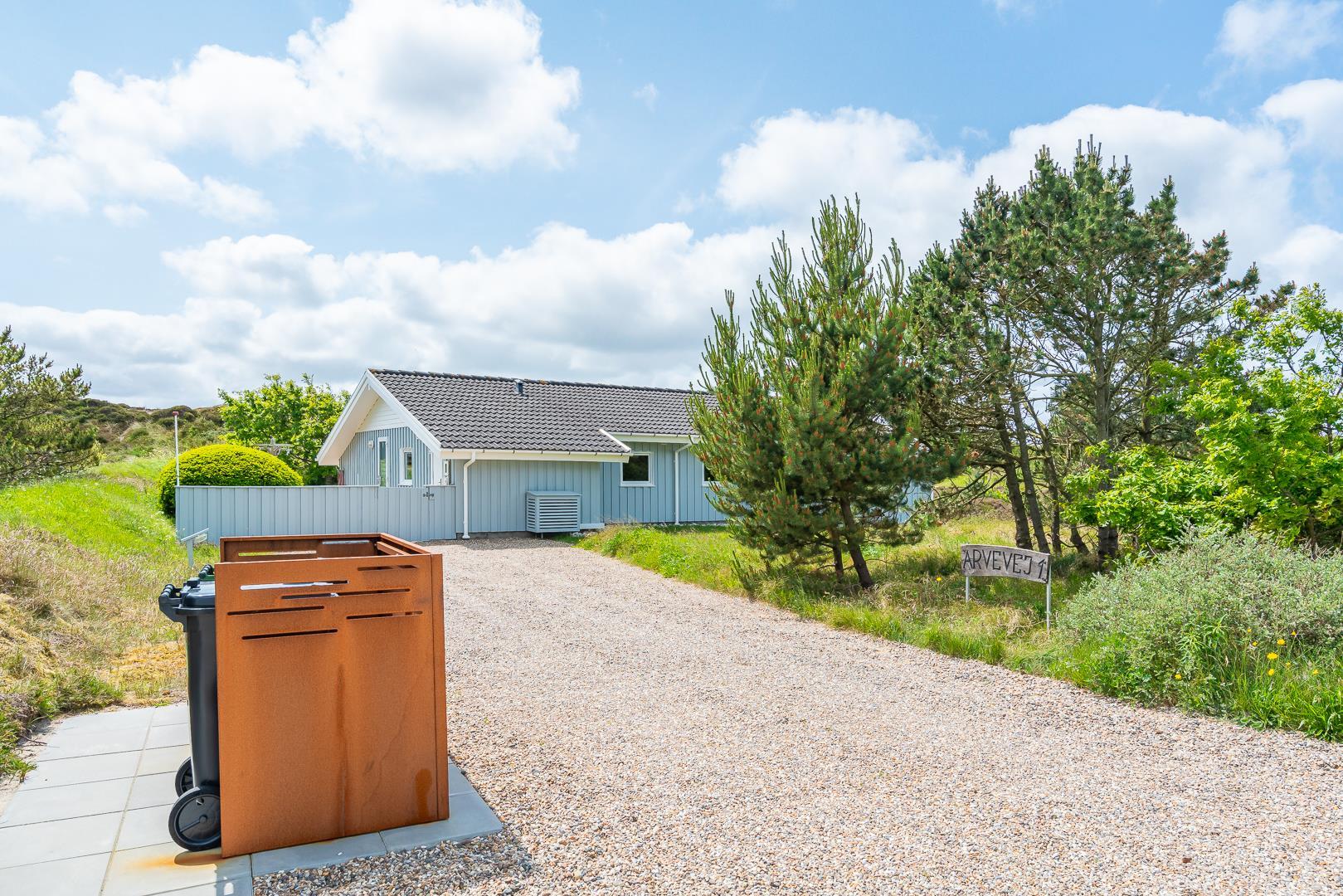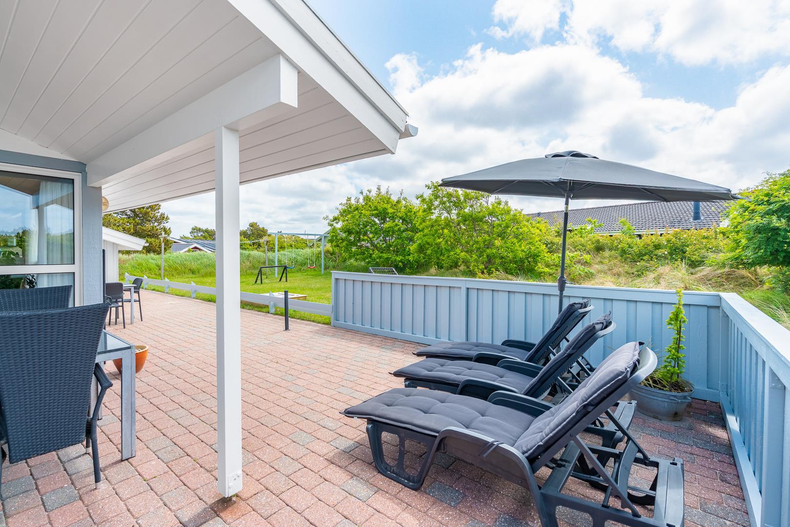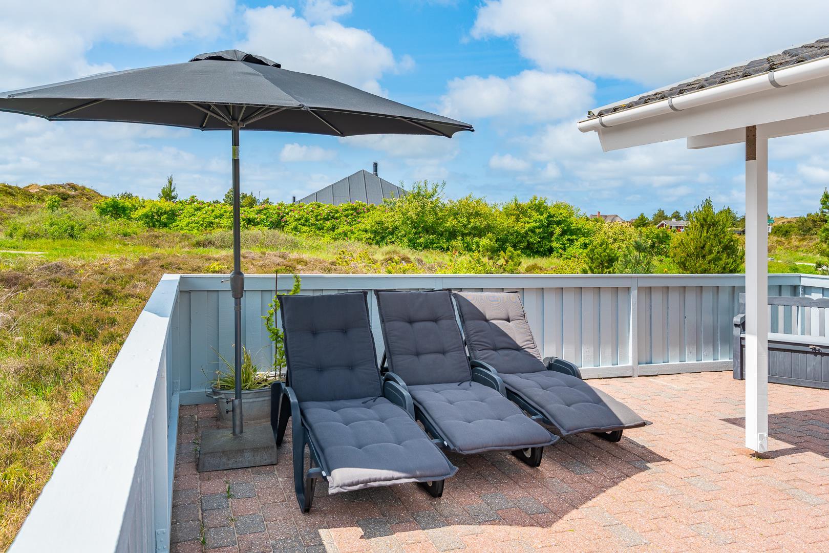 Feriehuset er indrettet med terrasser langs de syd- og vestlige facader, så du til fulde kan nyde solen og udsigten til den lave klitbeplantning, der læner sig blidt i sommerbrisen. Ikke mere end et par kilometer herfra afløses det åbne terræn af dyb, fascinerende skov med smukke vandre- og ridestier samt mountainbikeruter i forskellige sværhedsgrader. Stranden ligger blot omkring 800 meter fra feriehuset, så når du har nydt skovens mange farver, kan du slappe af på stranden hele eftermiddagen.