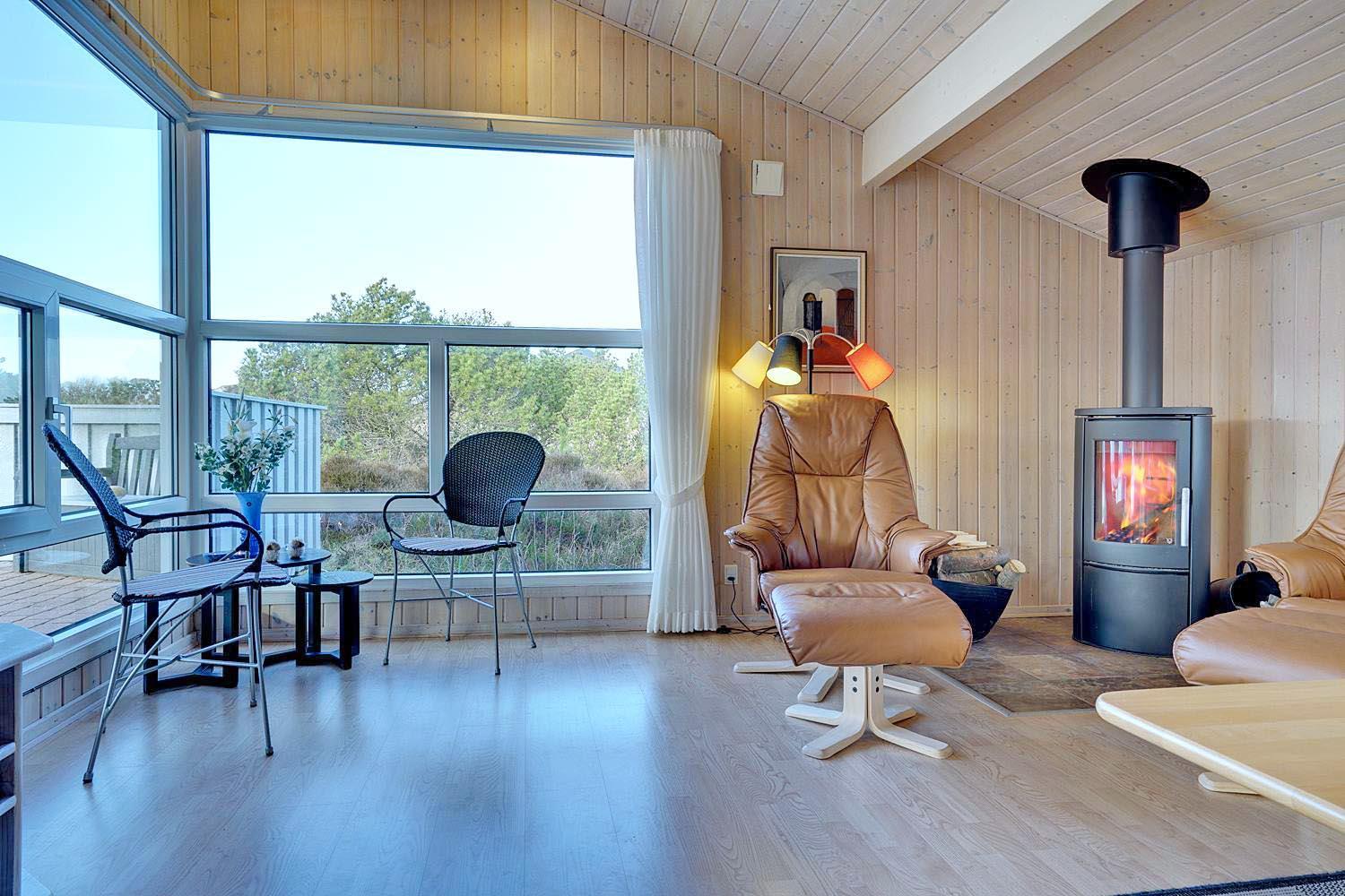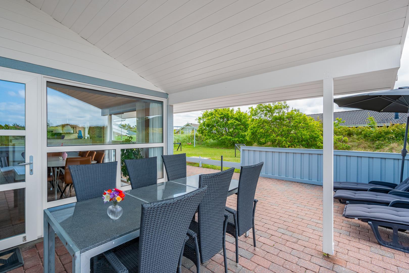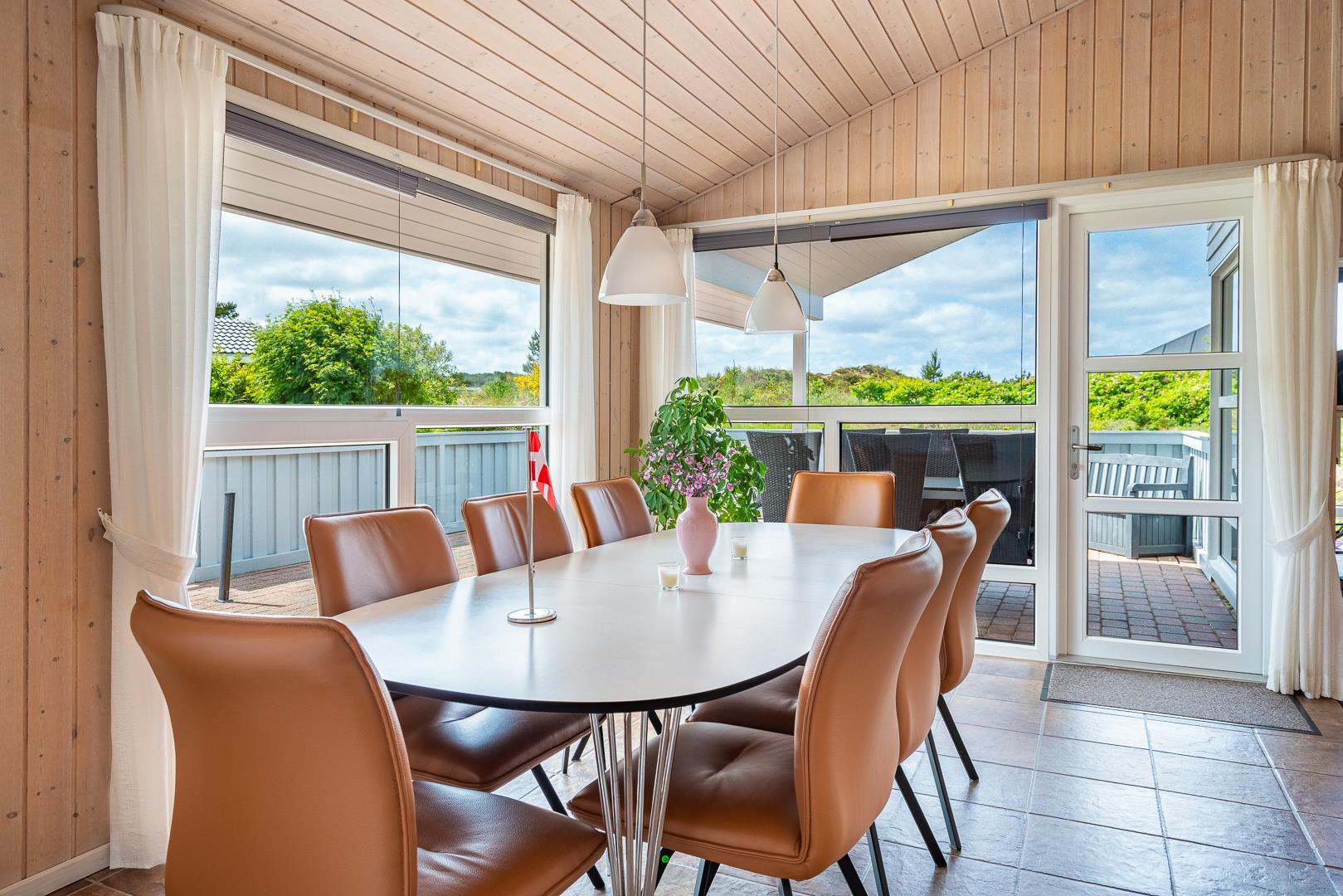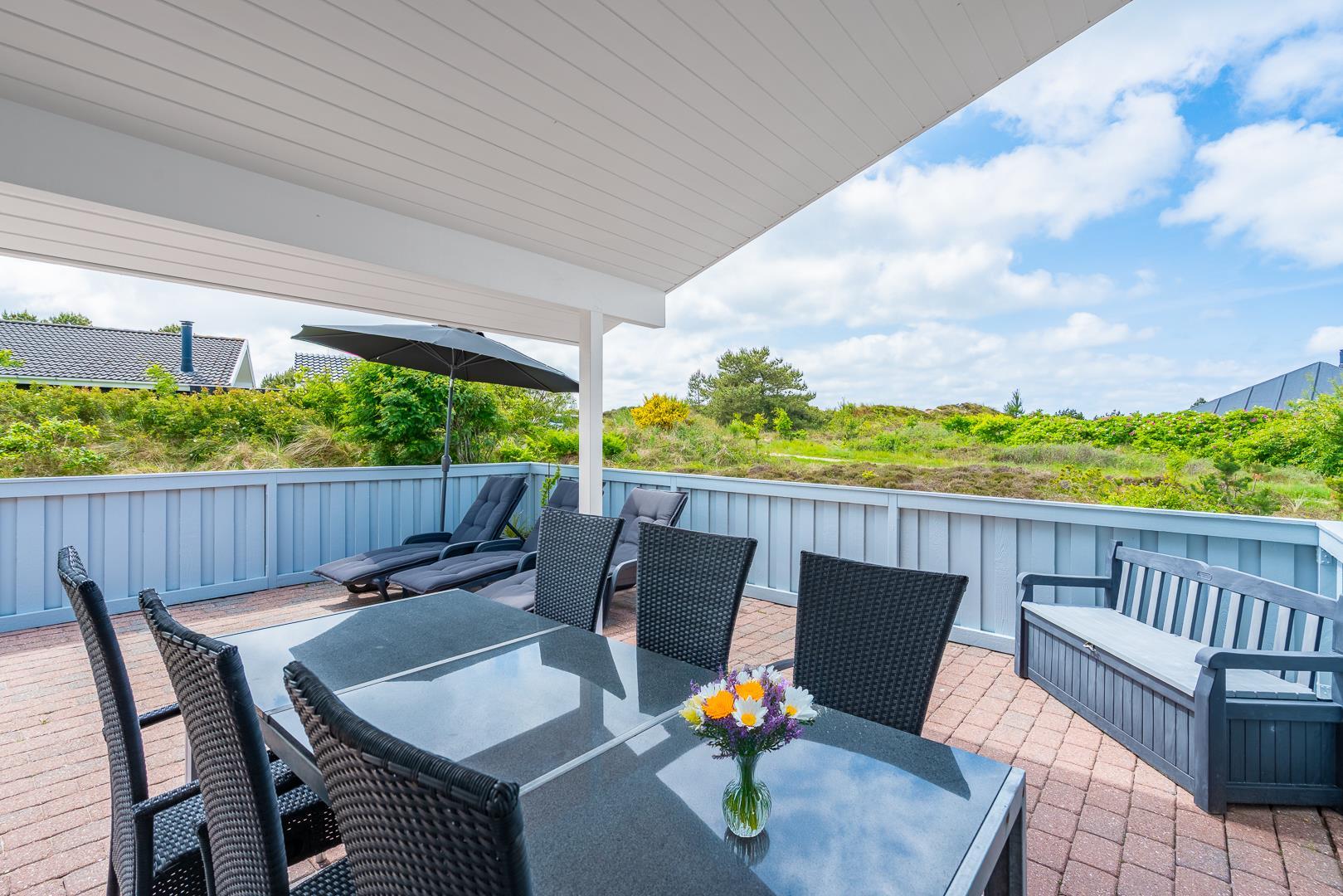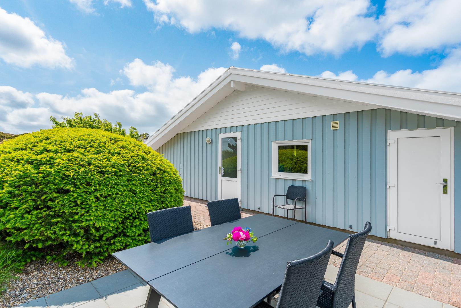 Feriehuset er indrettet med terrasser langs de syd- og vestlige facader, så du til fulde kan nyde solen og udsigten til den lave klitbeplantning, der læner sig blidt i sommerbrisen. Ikke mere end et par kilometer herfra afløses det åbne terræn af dyb, fascinerende skov med smukke vandre- og ridestier samt mountainbikeruter i forskellige sværhedsgrader. Stranden ligger blot omkring 800 meter fra feriehuset, så når du har nydt skovens mange farver, kan du slappe af på stranden hele eftermiddagen.