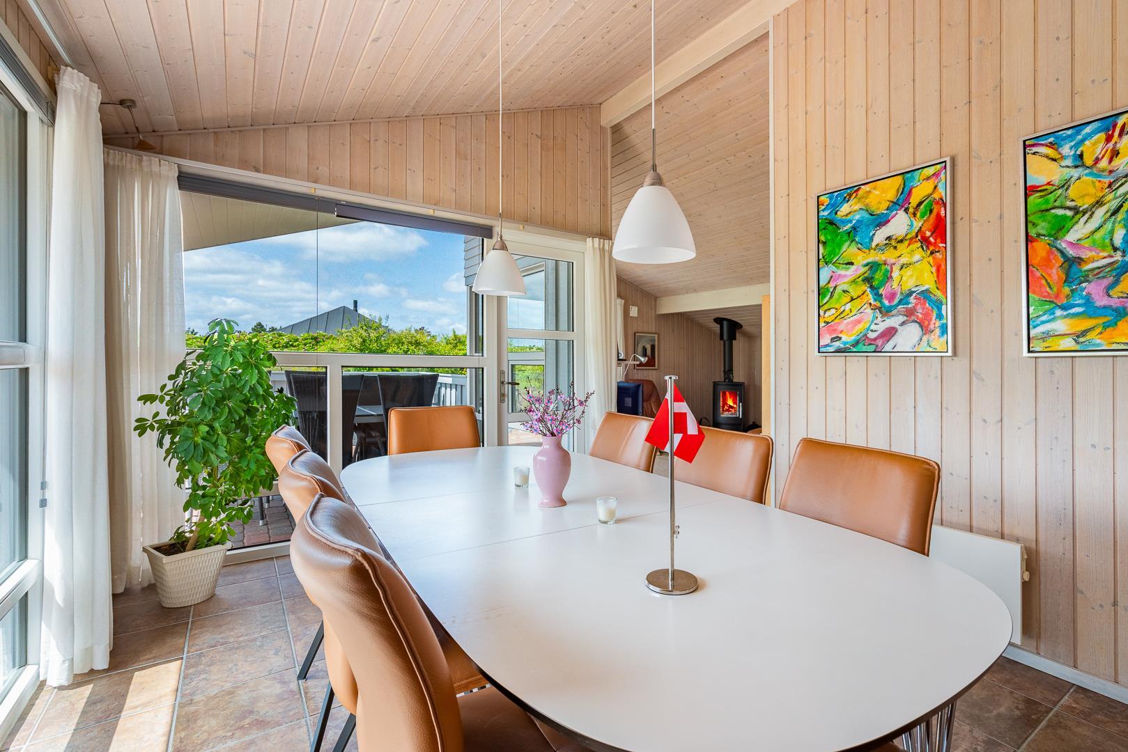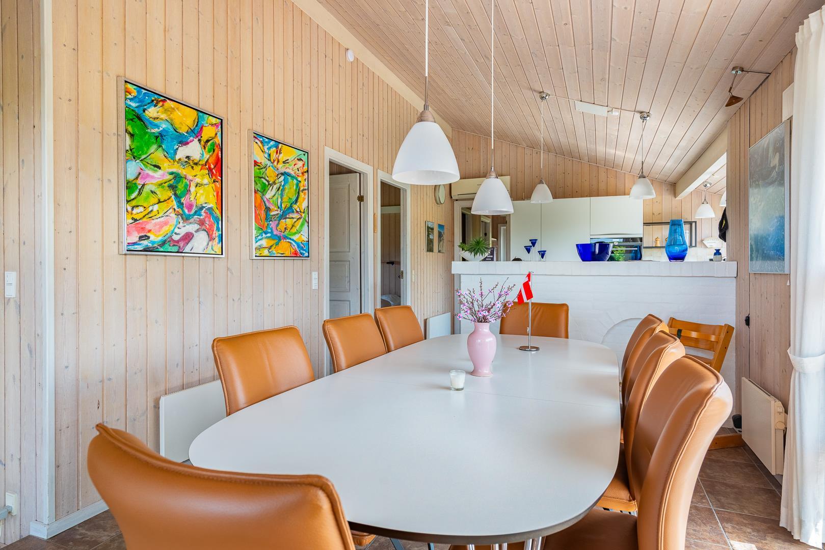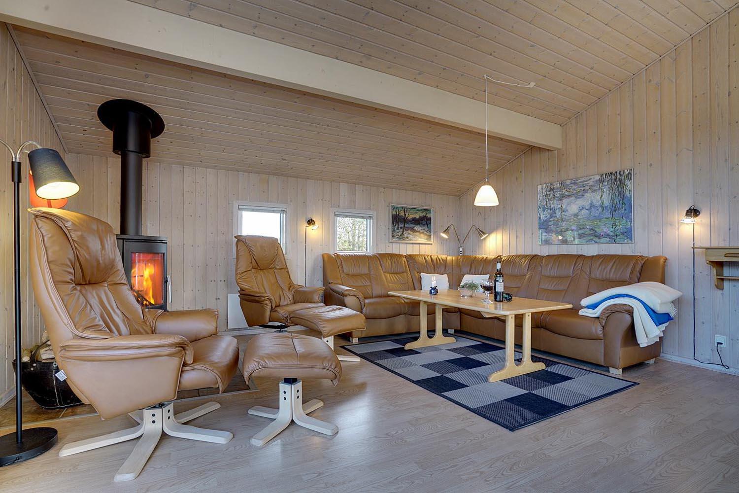 Selve huset er pænt møbleret med behagelige lædersofaer og et langt spisebord med otte spisepladser. Seks af de spisende gæster kan overnatte i faste senge + en barneseng, som er fordelt på tre soverum.
