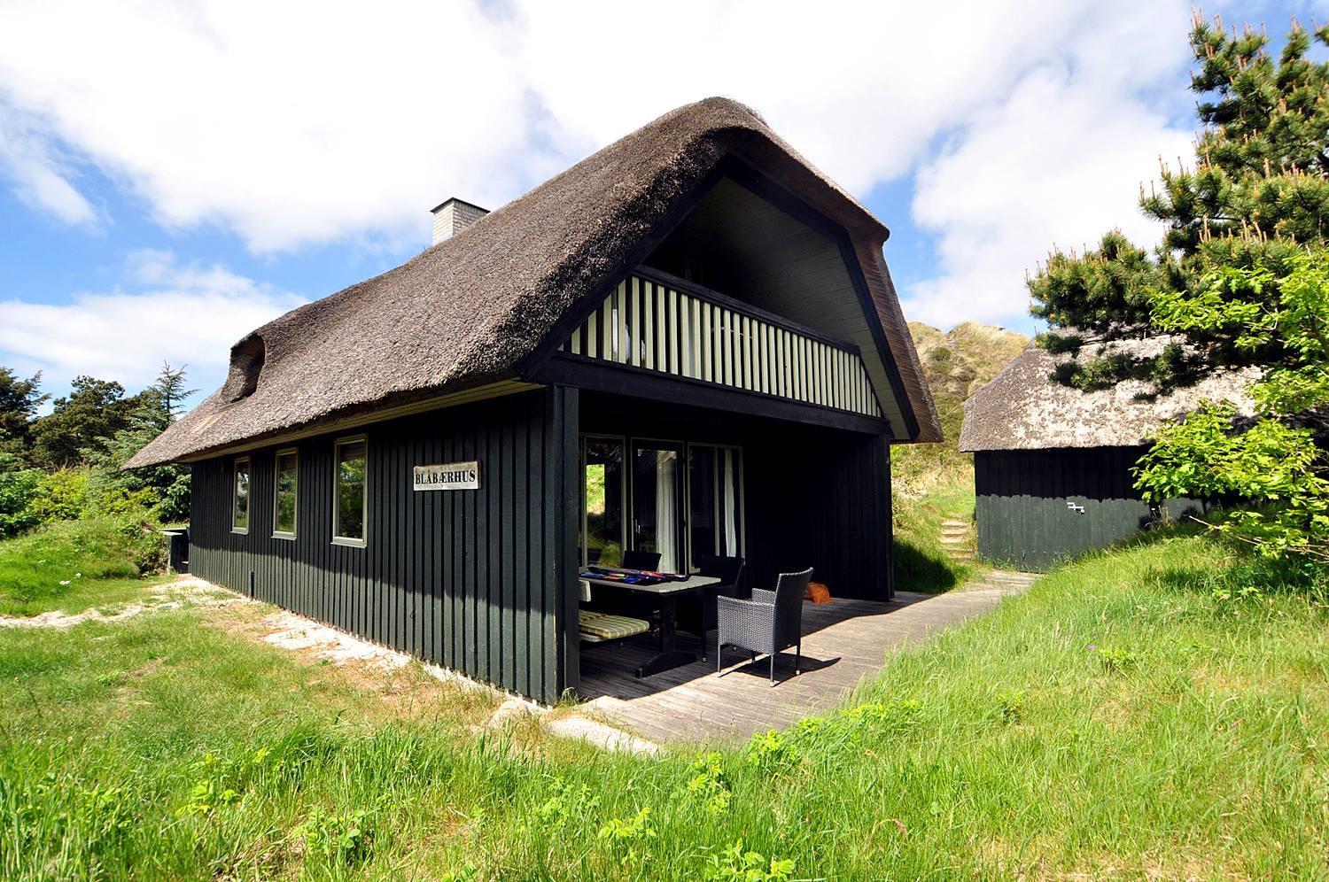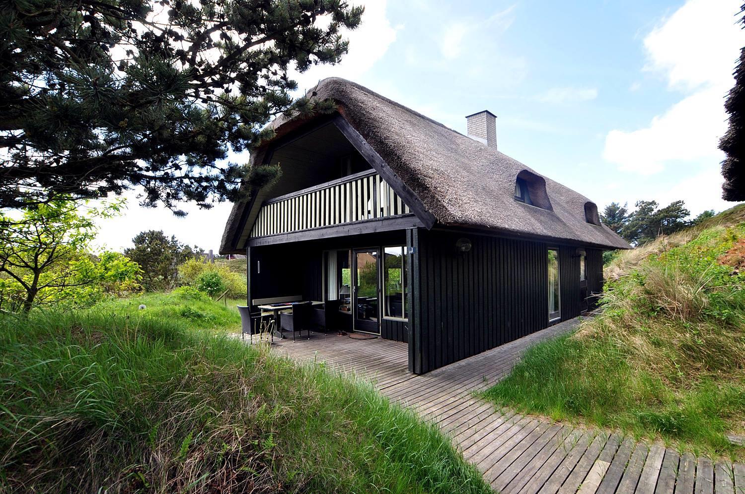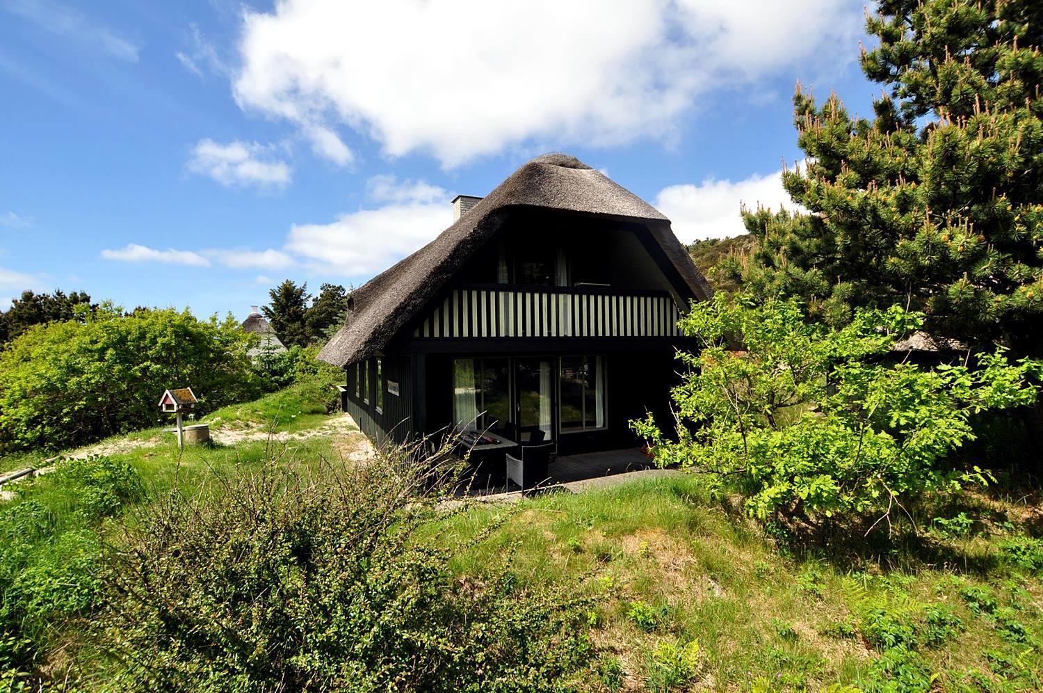 På en pragtfuld, kuperet klitgrund og for enden af blind vej i rolige omgivelser ligger dette charmerende, stråtækte feriehus med garage. Dejlig lyst køkken, som ligger i åben forbindelse med stuen med brændeovn. Der er fra det ene soverum udgang til lille balkon, hvor den flotte udsigt kan nydes.
