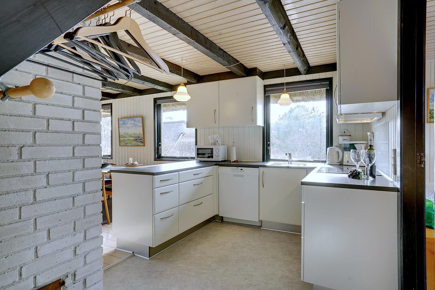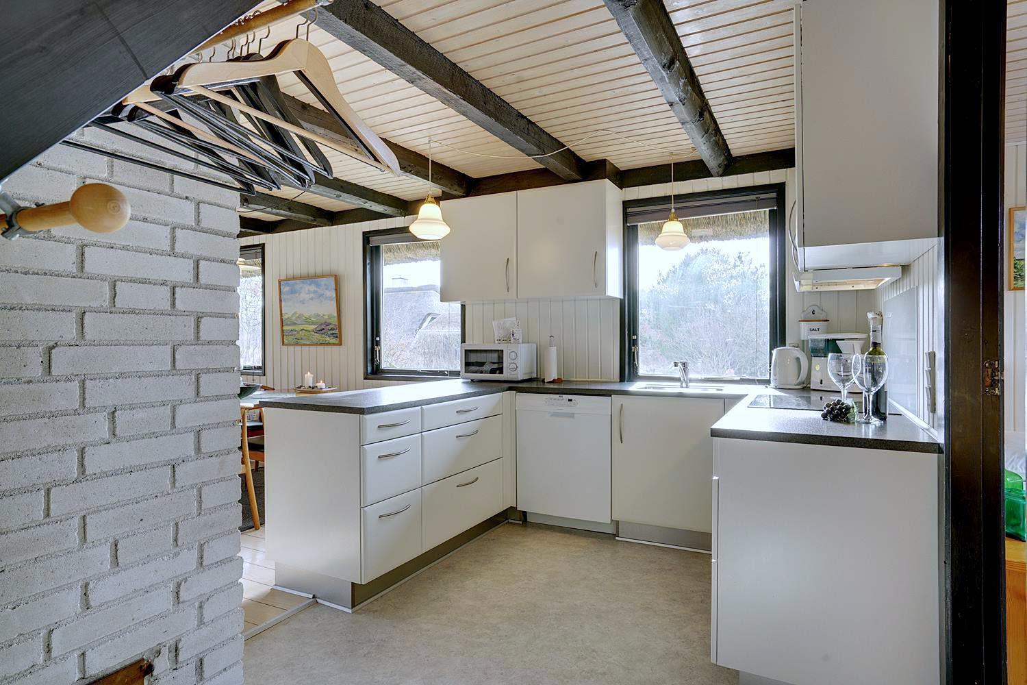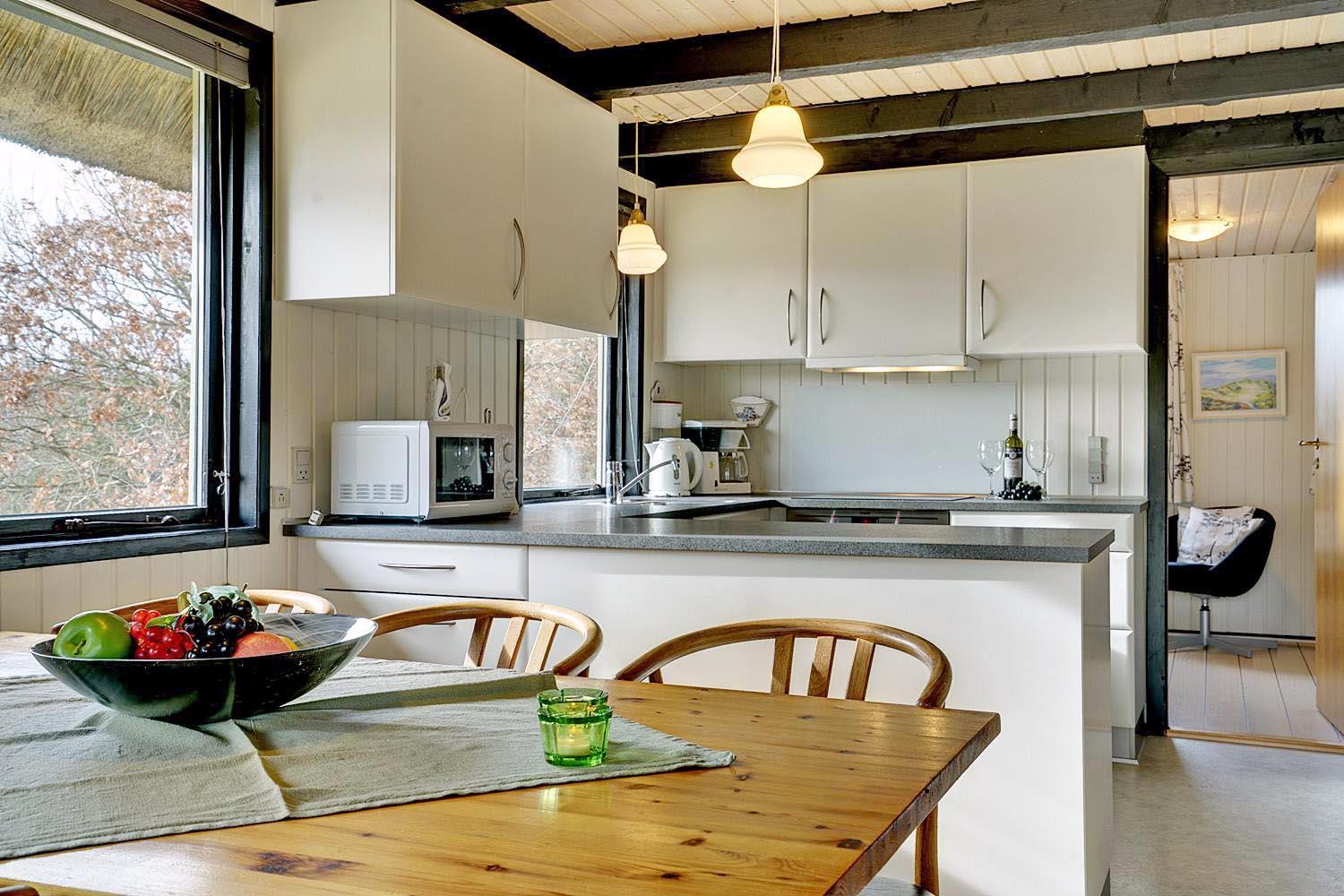 På en pragtfuld, kuperet klitgrund og for enden af blind vej i rolige omgivelser ligger dette charmerende, stråtækte feriehus med garage. Dejlig lyst køkken, som ligger i åben forbindelse med stuen med brændeovn. Der er fra det ene soverum udgang til lille balkon, hvor den flotte udsigt kan nydes.