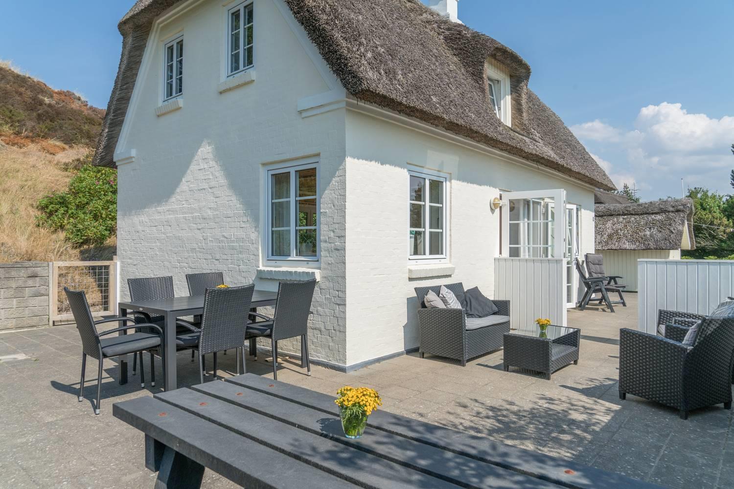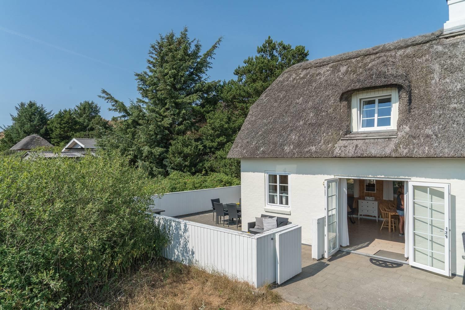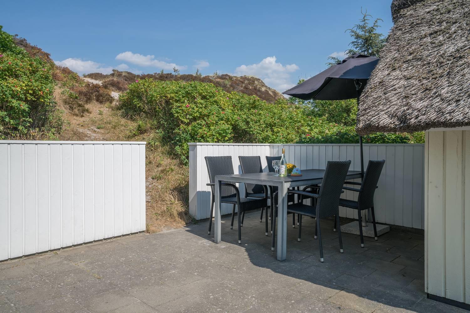 Hyggeligt stråtækt sommerhus med stor lukket terrasse nær Henne Strand, ideelt til fred og afslapning i naturskønne omgivelser.