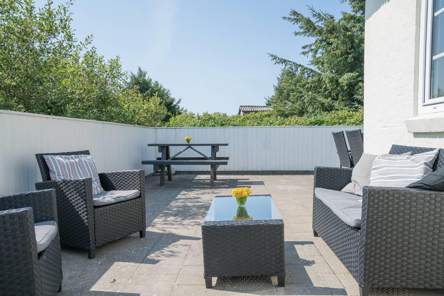 Huset er omkranset af en stor, solrig og helt lukket terrasse, hvor man altid kan finde læ og nyde udelivet i fred og ro. Her er plads til både afslapning, grillhygge og leg for de mindste.
