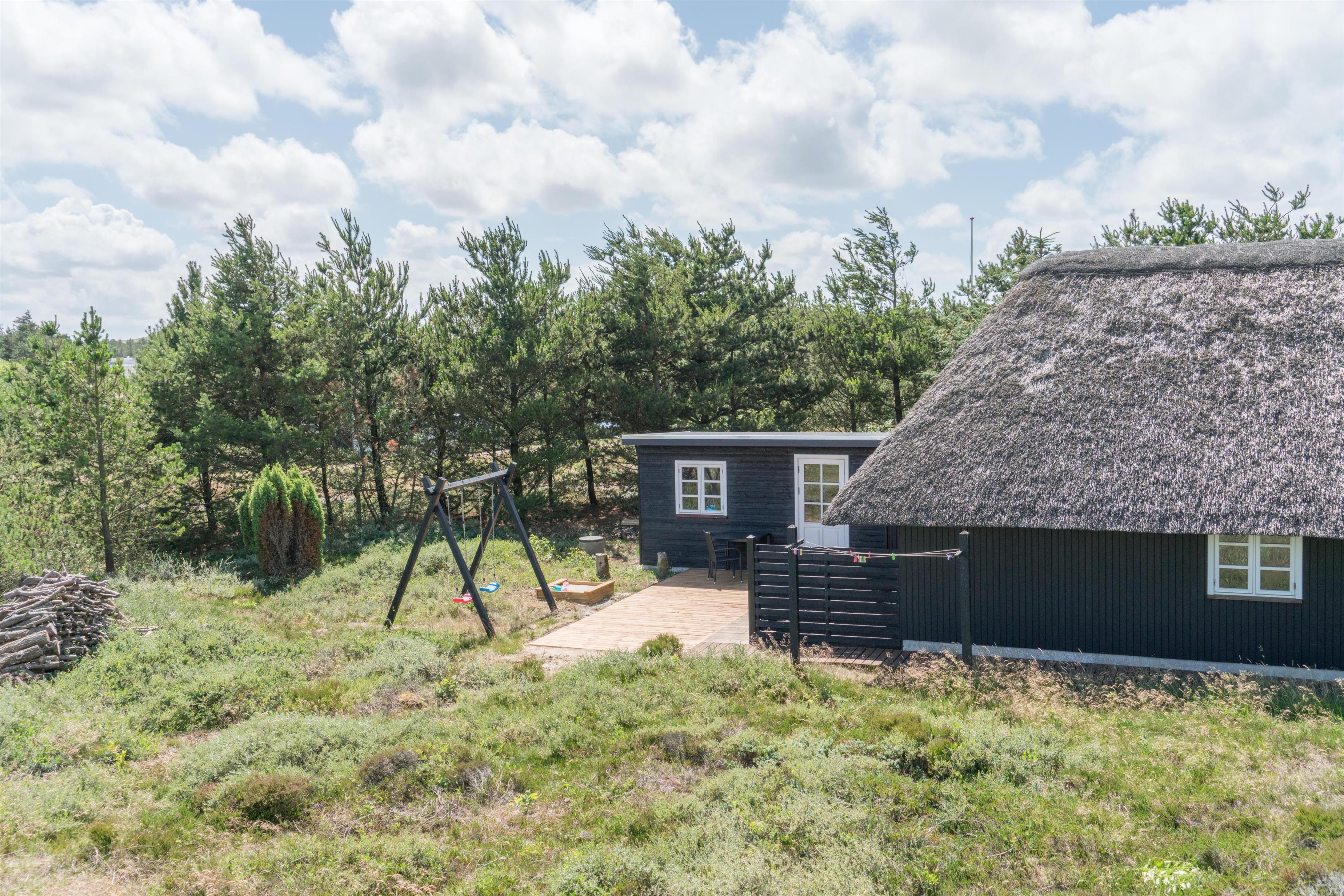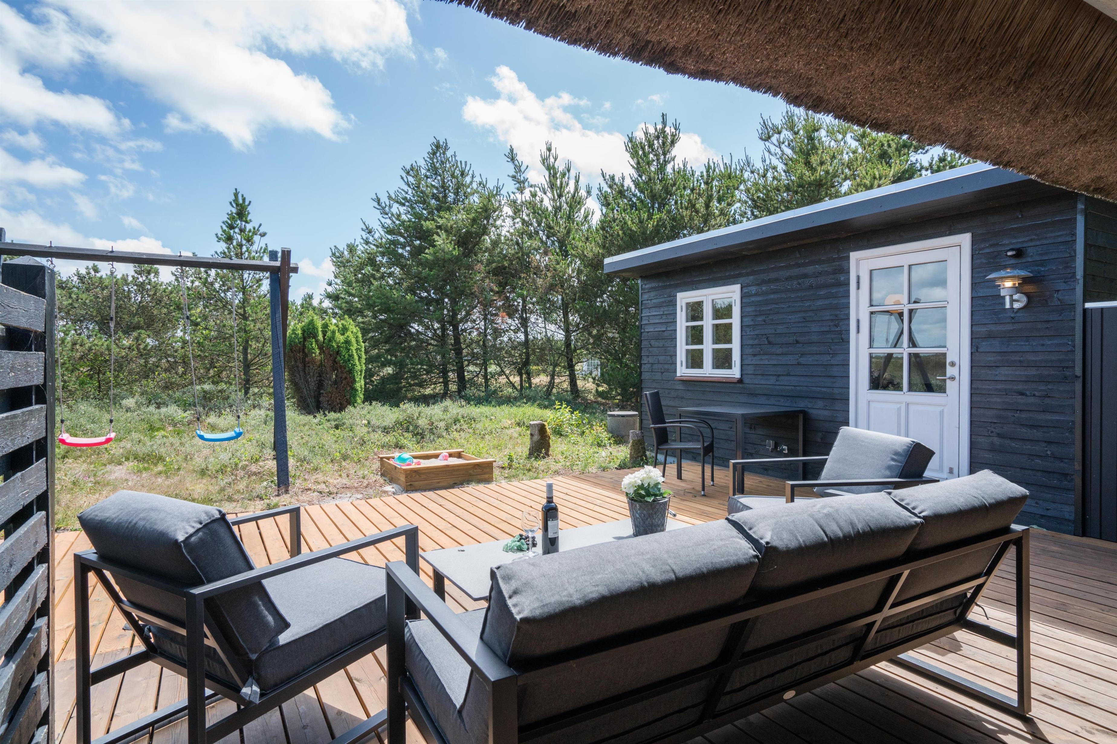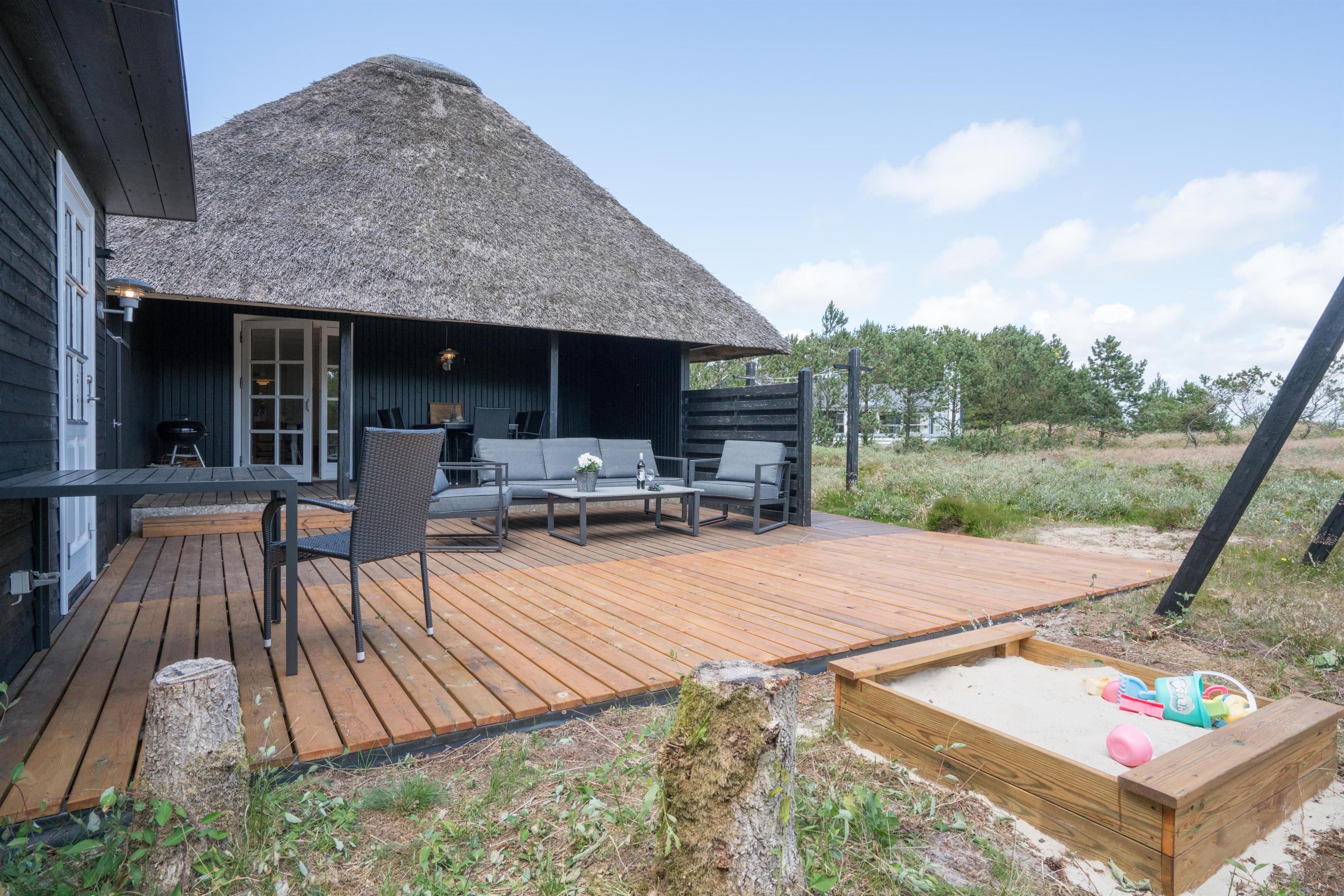 For familier med børn er der også tænkt på underholdningen: en sandkasse i haven giver sjov for de små, mens du kan nyde solen og roen på terrassen.