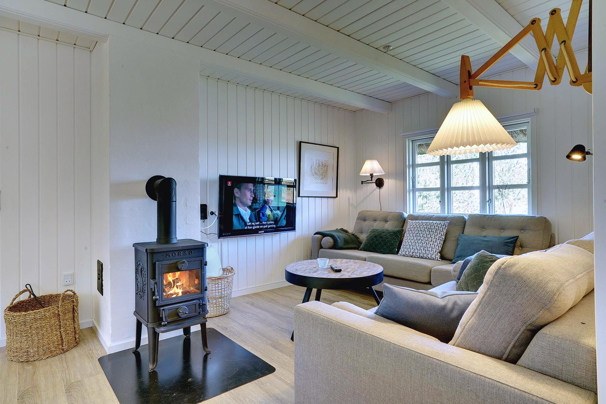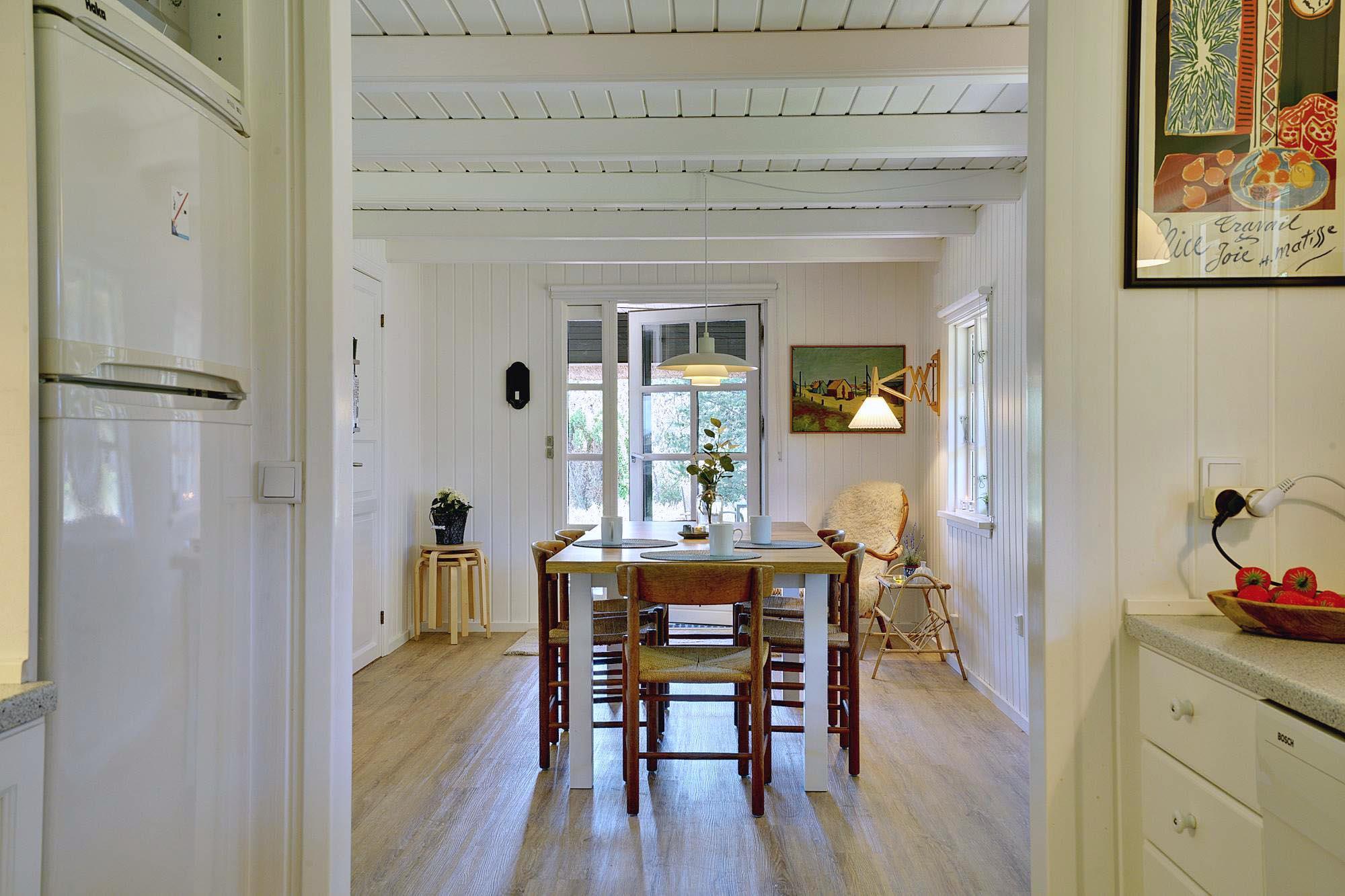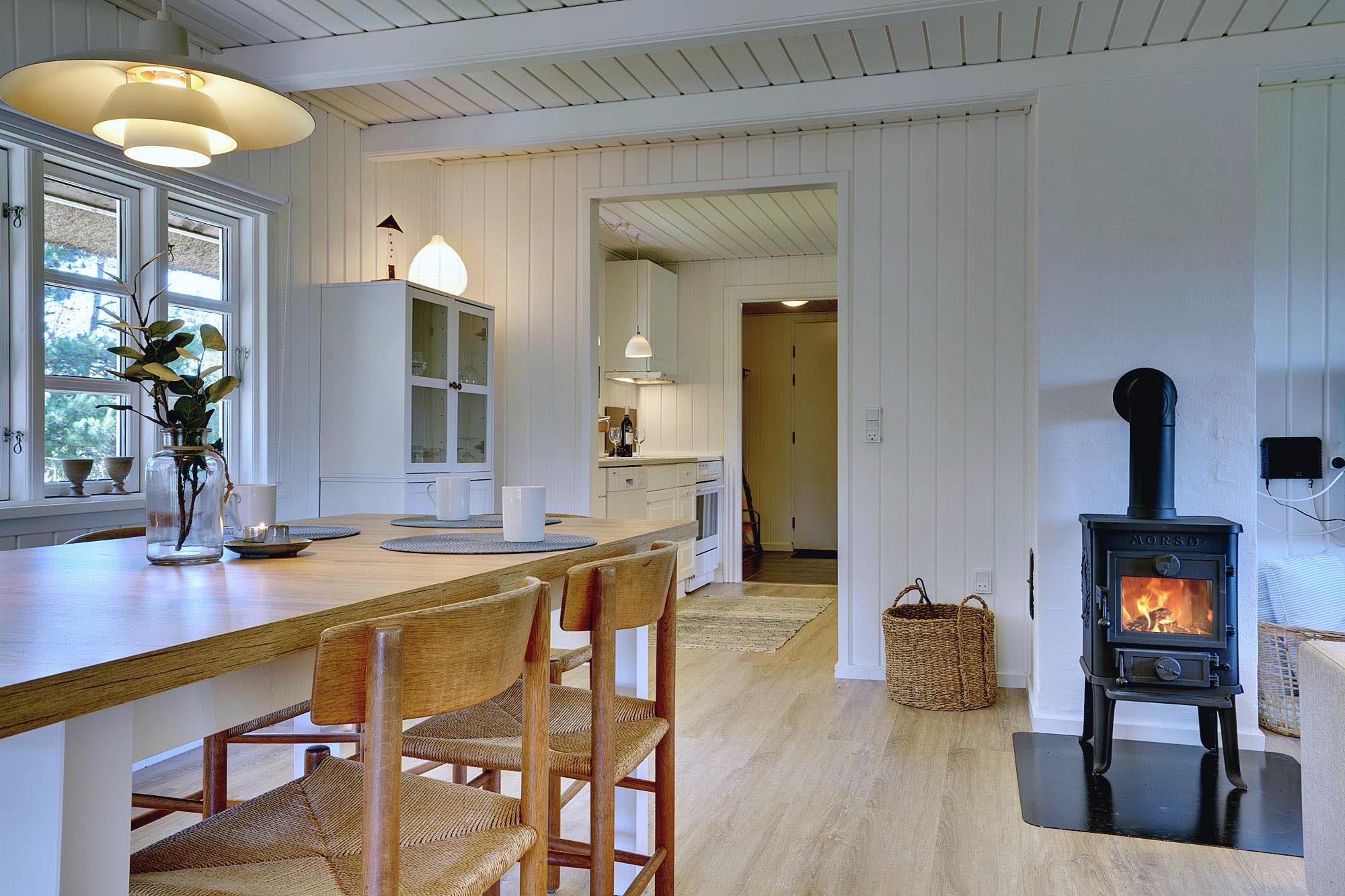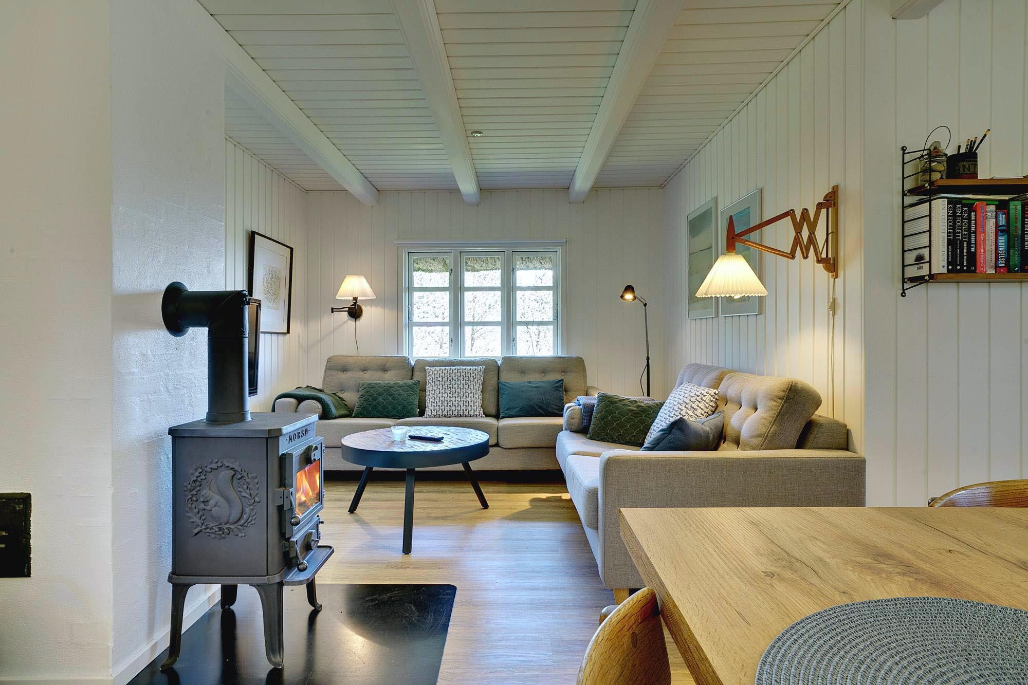 Kernen i huset er den åbne stue- og spisestue. Store vinduer lukker masser af dagslys ind og skaber en lys og venlig atmosfære. Brændeovnen giver dejlig varme på kølige dage og bidrager til ægte sommerhusstemning. Om aftenen på sofaen, med en god bog eller et glas vin efter en tur på stranden – her kan du virkelig slappe af.