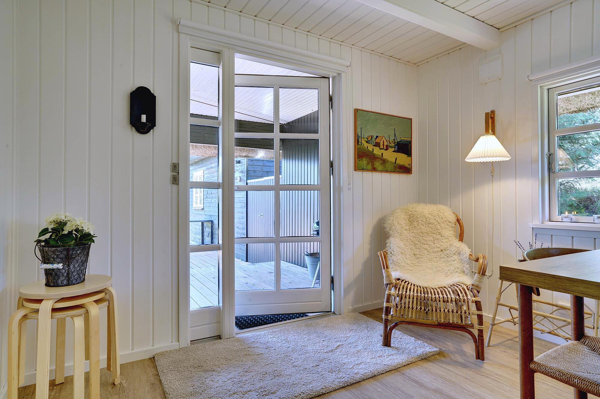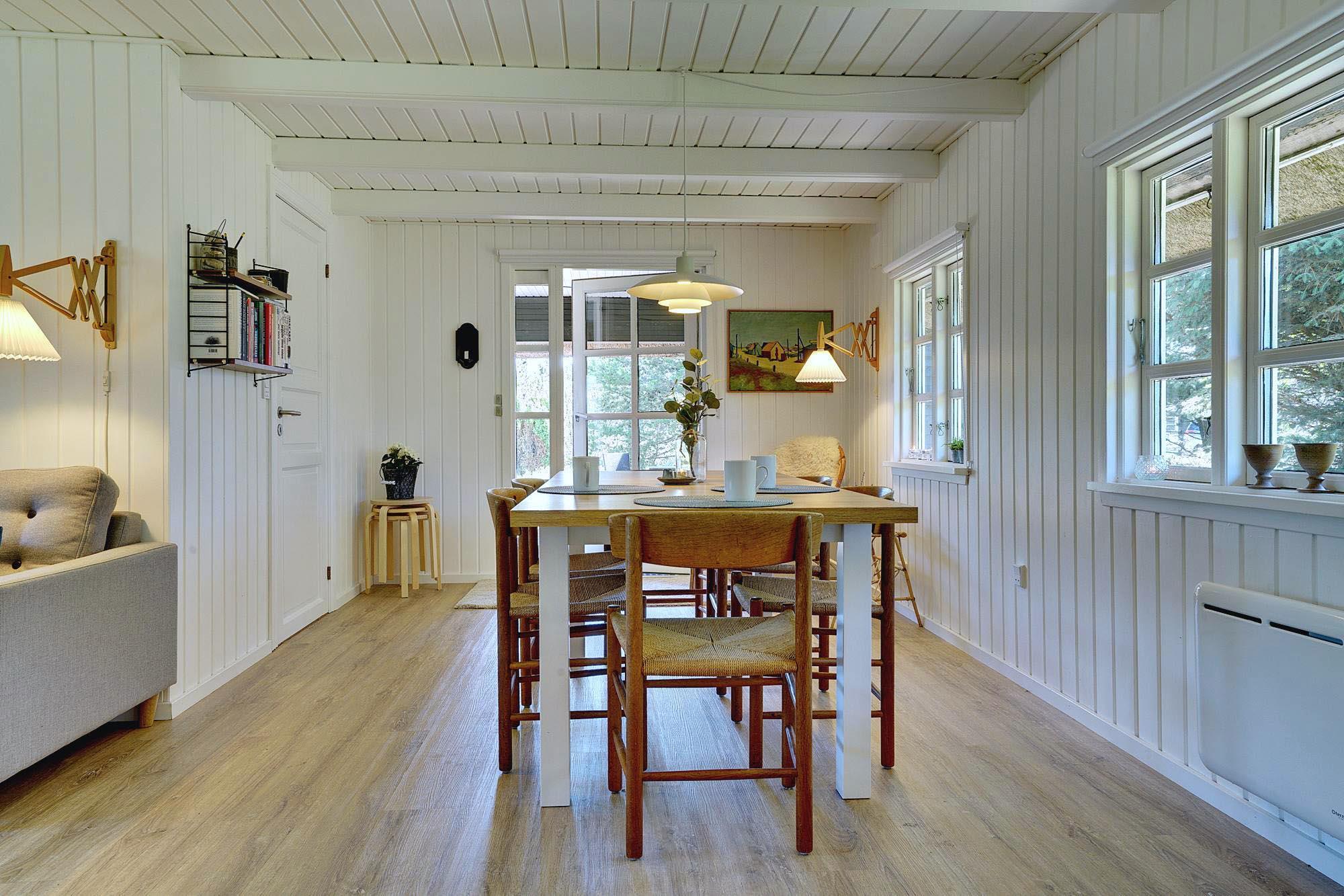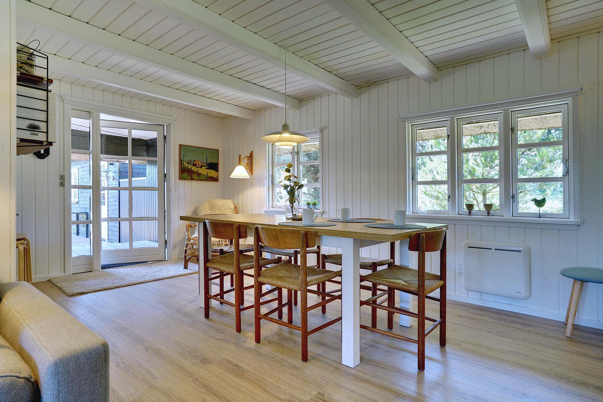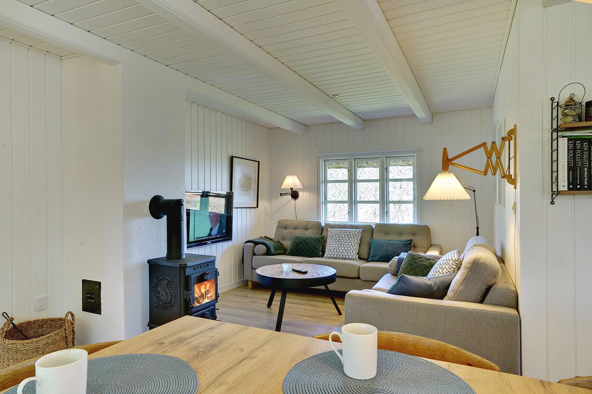 Kernen i huset er den åbne stue- og spisestue. Store vinduer lukker masser af dagslys ind og skaber en lys og venlig atmosfære. Brændeovnen giver dejlig varme på kølige dage og bidrager til ægte sommerhusstemning. Om aftenen på sofaen, med en god bog eller et glas vin efter en tur på stranden – her kan du virkelig slappe af.