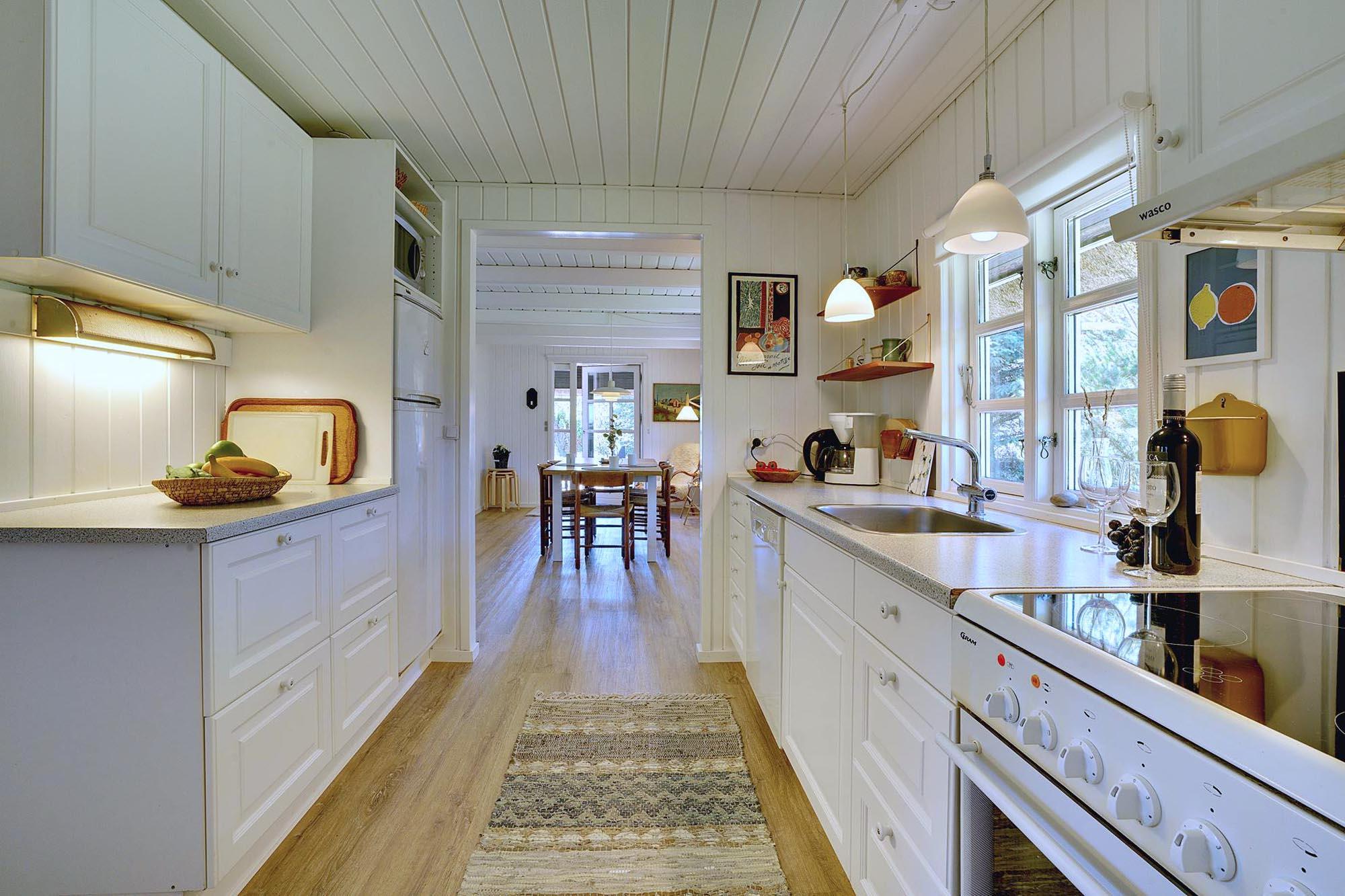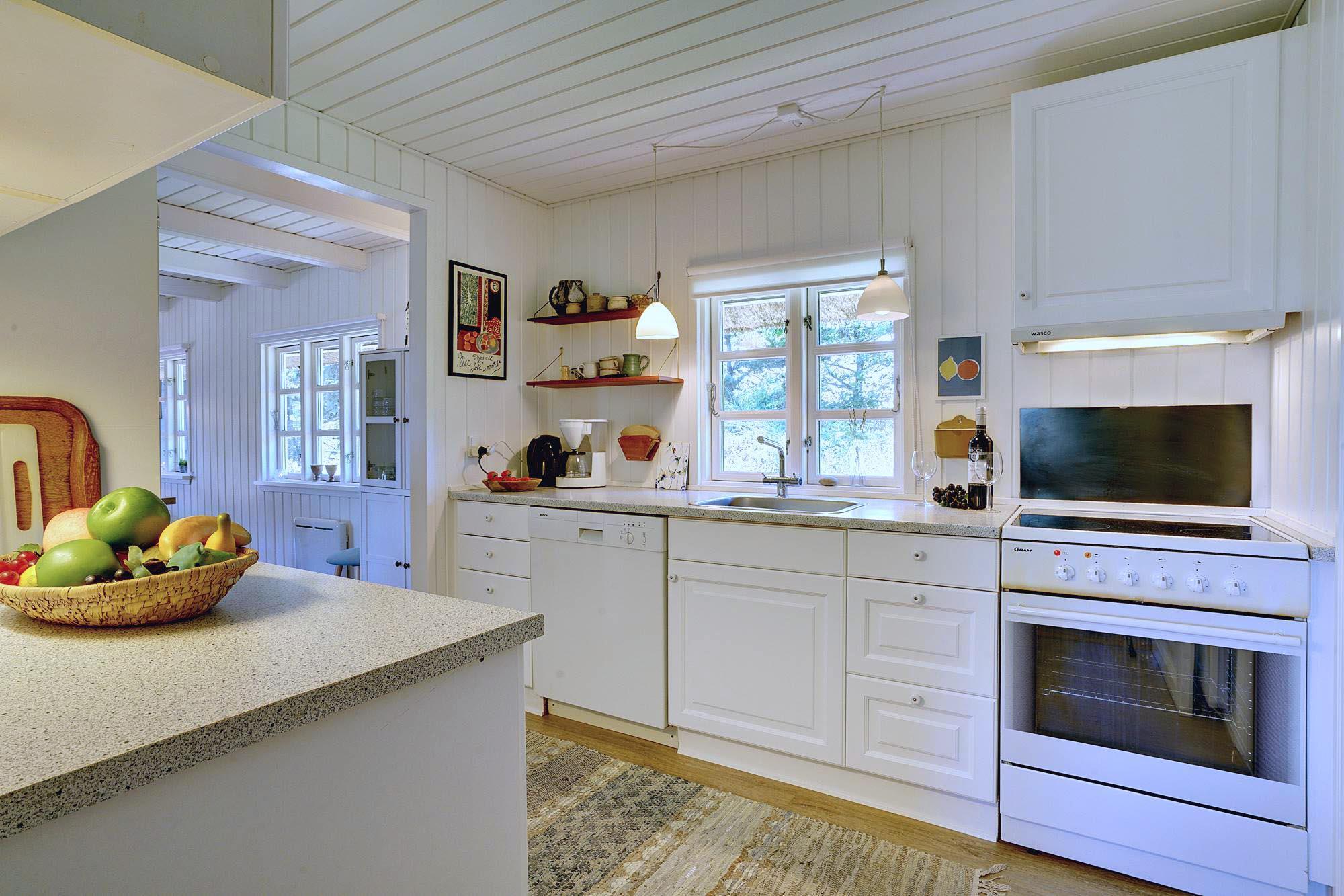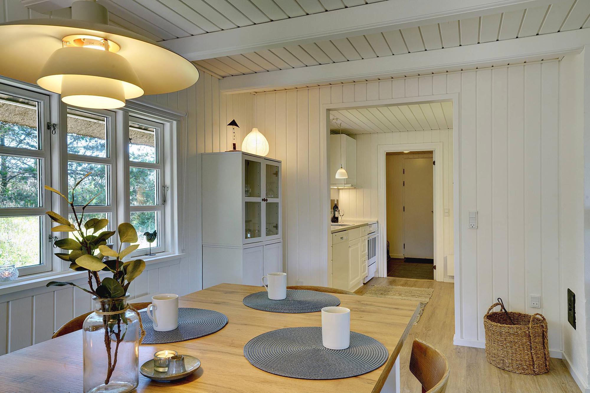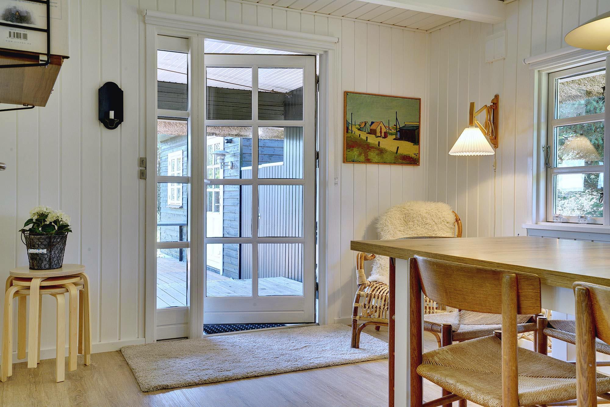 Kernen i huset er den åbne stue- og spisestue. Store vinduer lukker masser af dagslys ind og skaber en lys og venlig atmosfære. Brændeovnen giver dejlig varme på kølige dage og bidrager til ægte sommerhusstemning. Om aftenen på sofaen, med en god bog eller et glas vin efter en tur på stranden – her kan du virkelig slappe af.